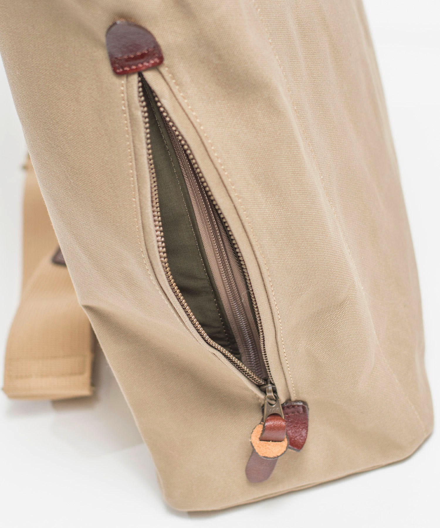 カバンのサイドにはファスナーポケットがあり、内装のペットボトルホルダーにつながっています。バッグを肩に掛けたままサイドファスナーから出し入れ可能となっており便利です。