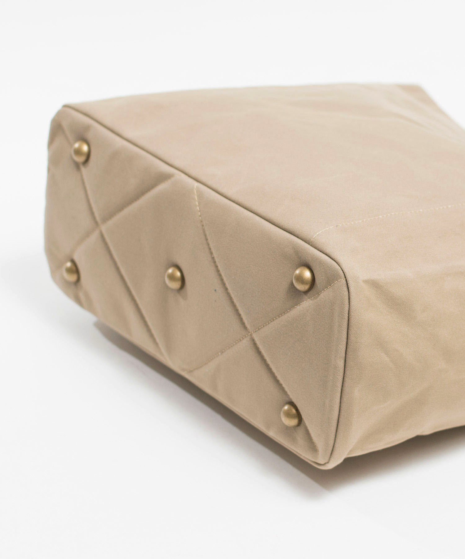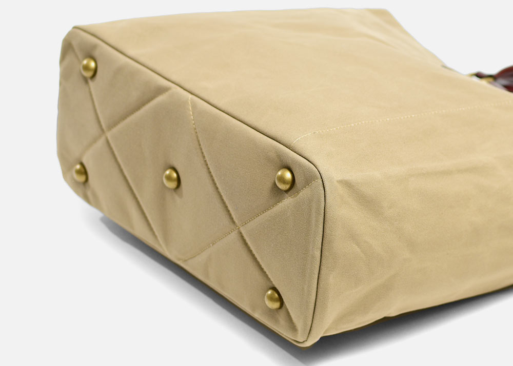 底部はウレタンを挟み込み、クロスステッチを掛けて補強しています。さらに底鋲を配し、直置きでもなるべく底が汚れたり擦り切れたりしないようにと配慮。自立して立てて置くことも可能です。