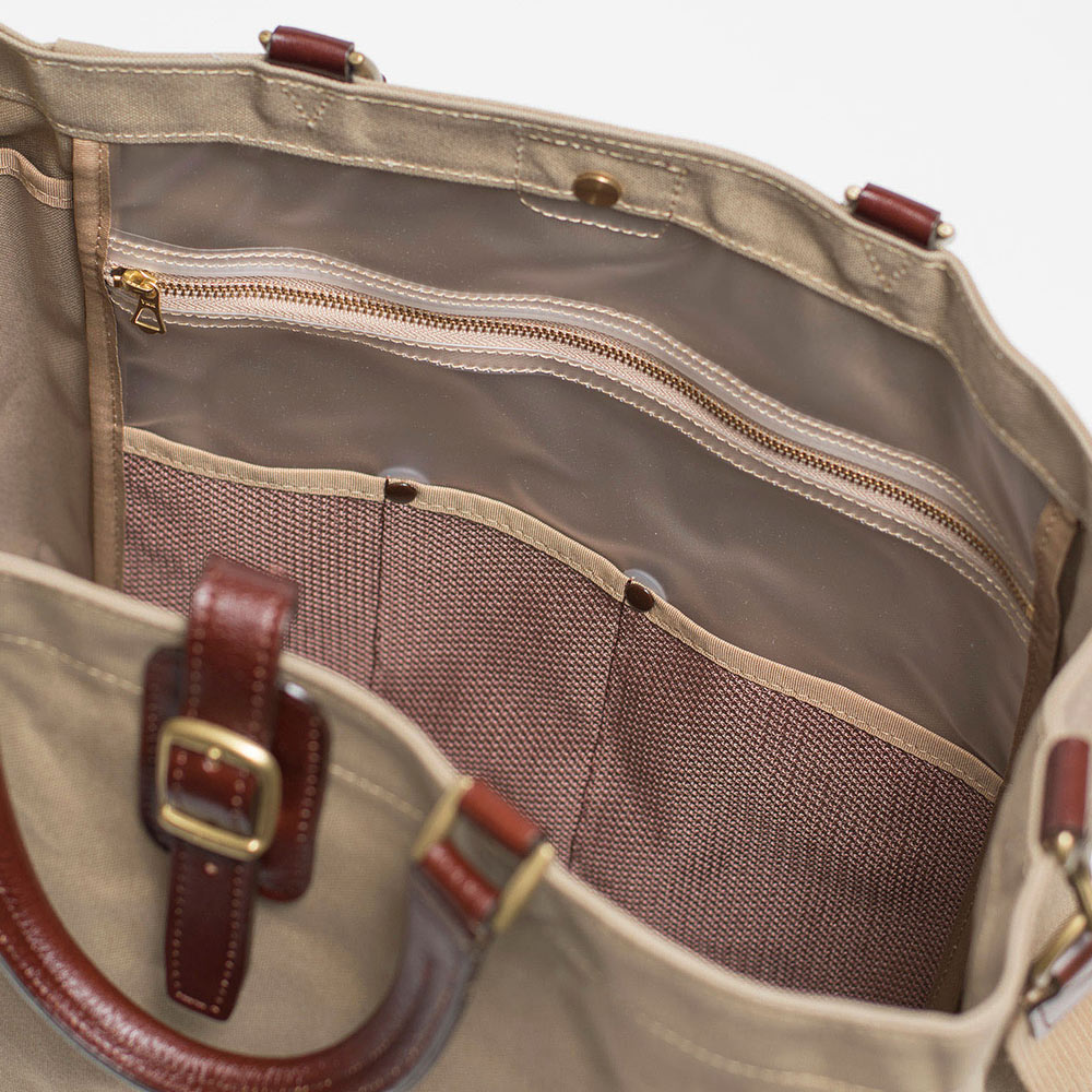B4サイズも楽々入る大きさでレジャーにも最適です。A4ファイルなら横向きでも入ります。内装はファスナーポケット、ホック付きメッシュポケット、メッシュポケット大、小が1つずつ、ペットボトルホルダーが装備されています。大寸トートだけに、ポケットも大きめです。ホック付きメッシュポケットは雑誌も楽々入るサイズ。