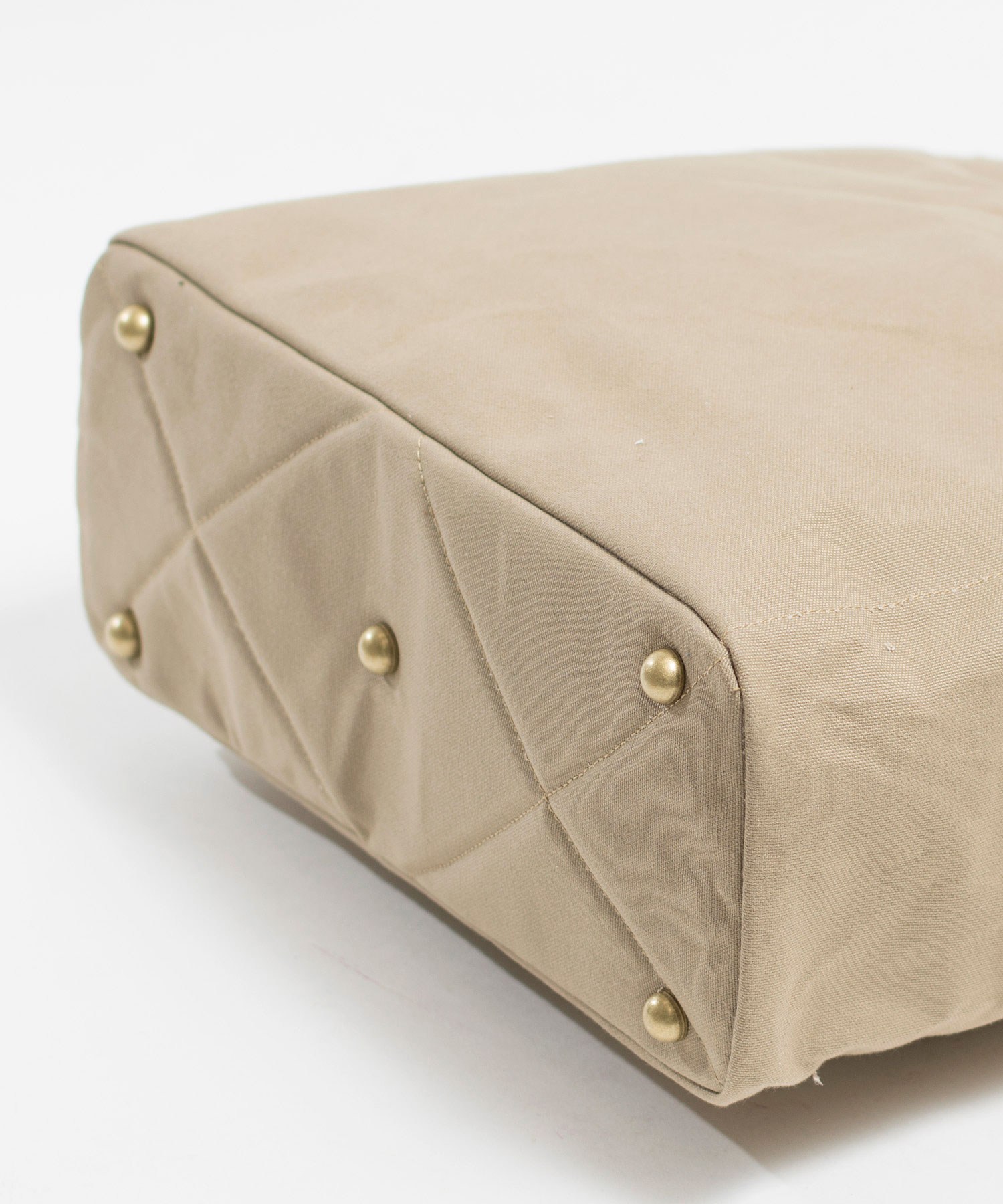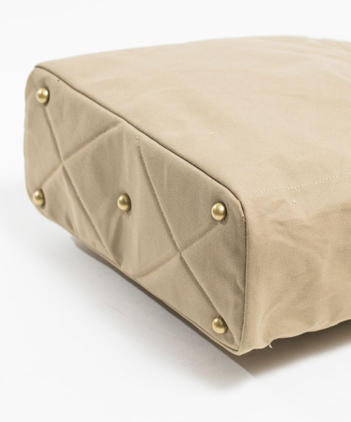 底面のクロスステッチ底部はウレタンを挟み込み、クロスステッチを掛けて補強しています。さらに底鋲を配し、直置きでもなるべく底が汚れたり擦り切れたりしないようにと配慮。自立して立てて置くことも可能です。