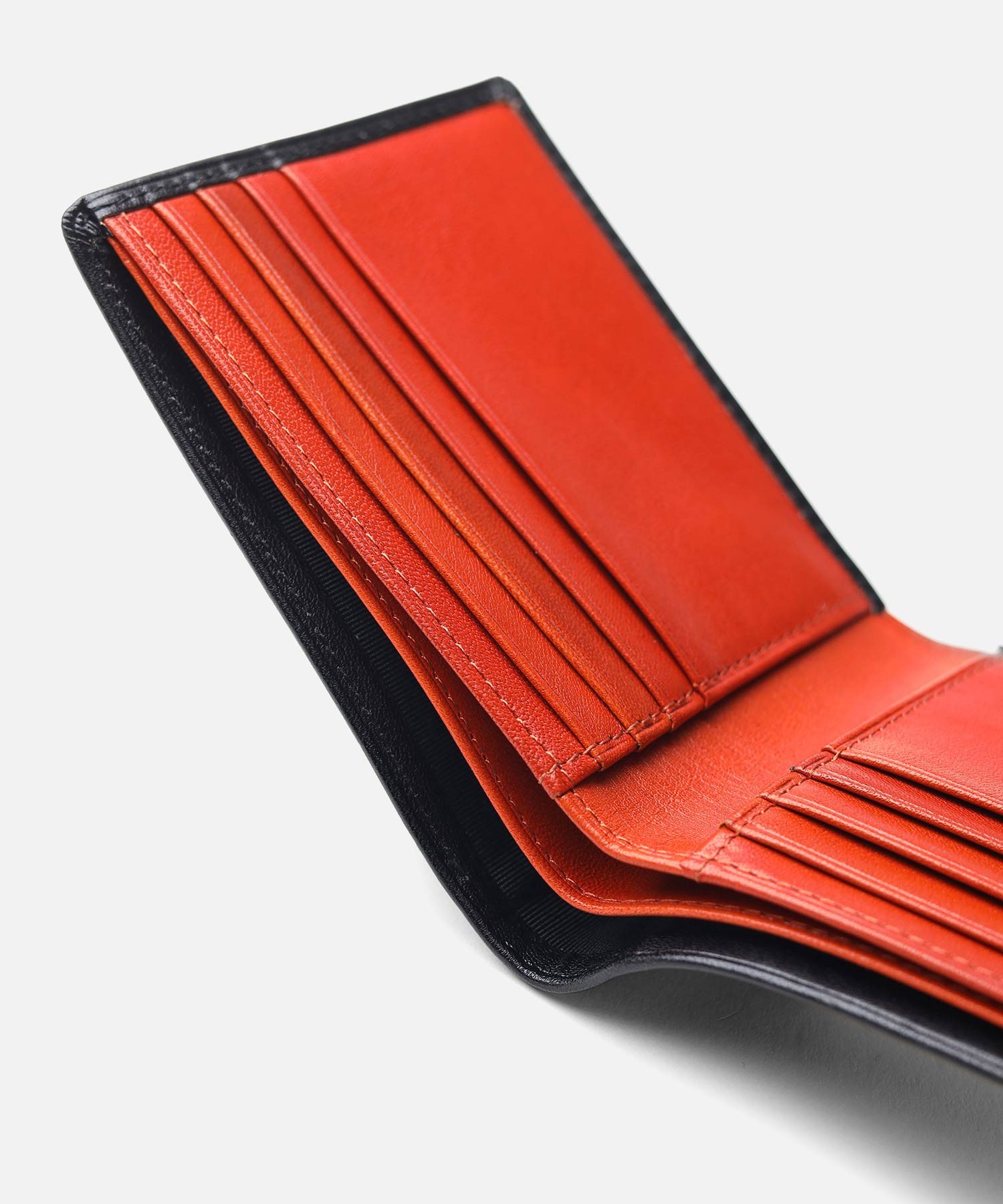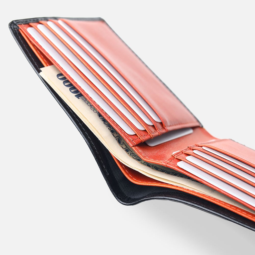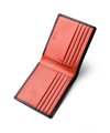 タケオキクチの小銭入れ無しの純札タイプの二つ折り財布です。小銭入れがない分、スマートで薄造りなフォルムとなっています。札入れスペースは二層に分かれており、紙幣とレシート類等を分けて収納できます。カード段が8つとポケットが2つ備わっており、収納力抜群の純札二つ折り財布です。