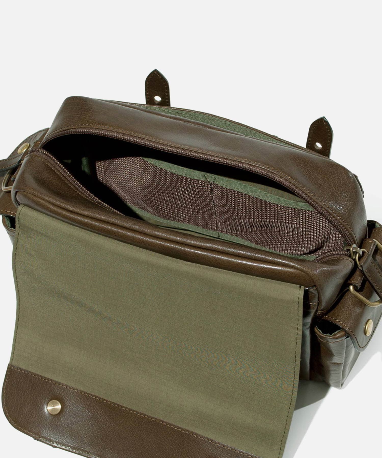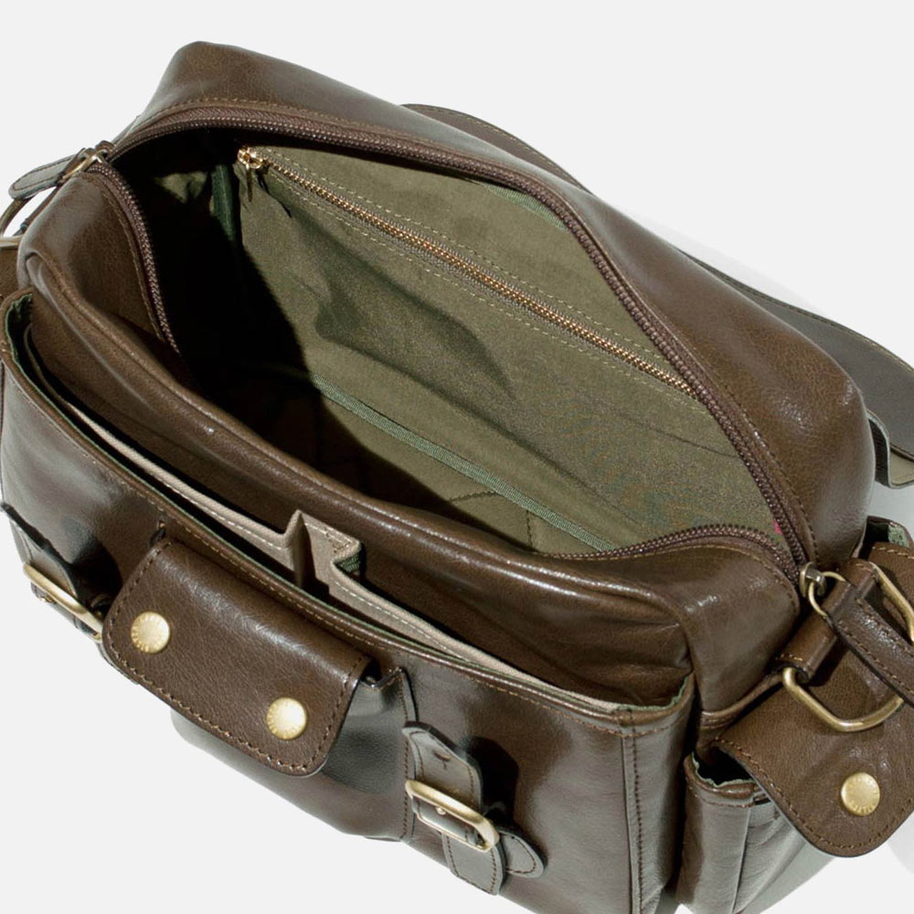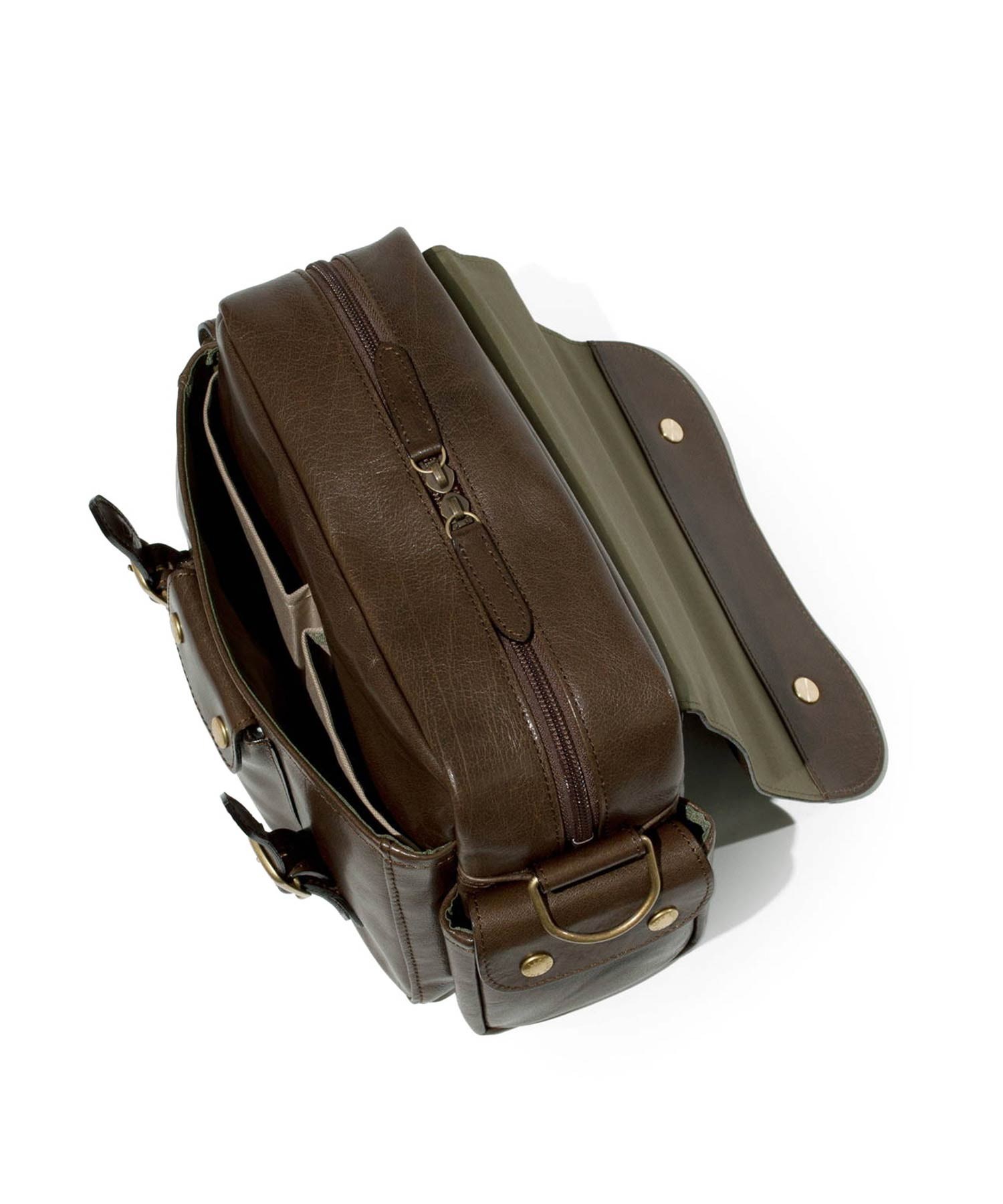 バッグのフラップ下のポケット内にはさらに小ポケットが2つ、両サイドにはマチ付きファスナーポケットがあります。