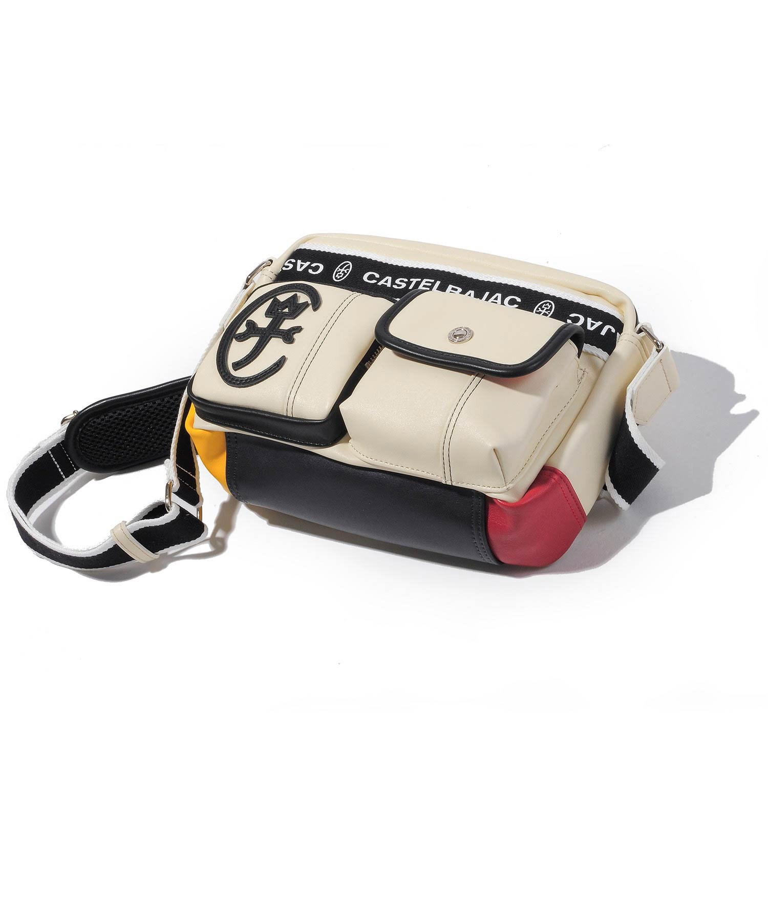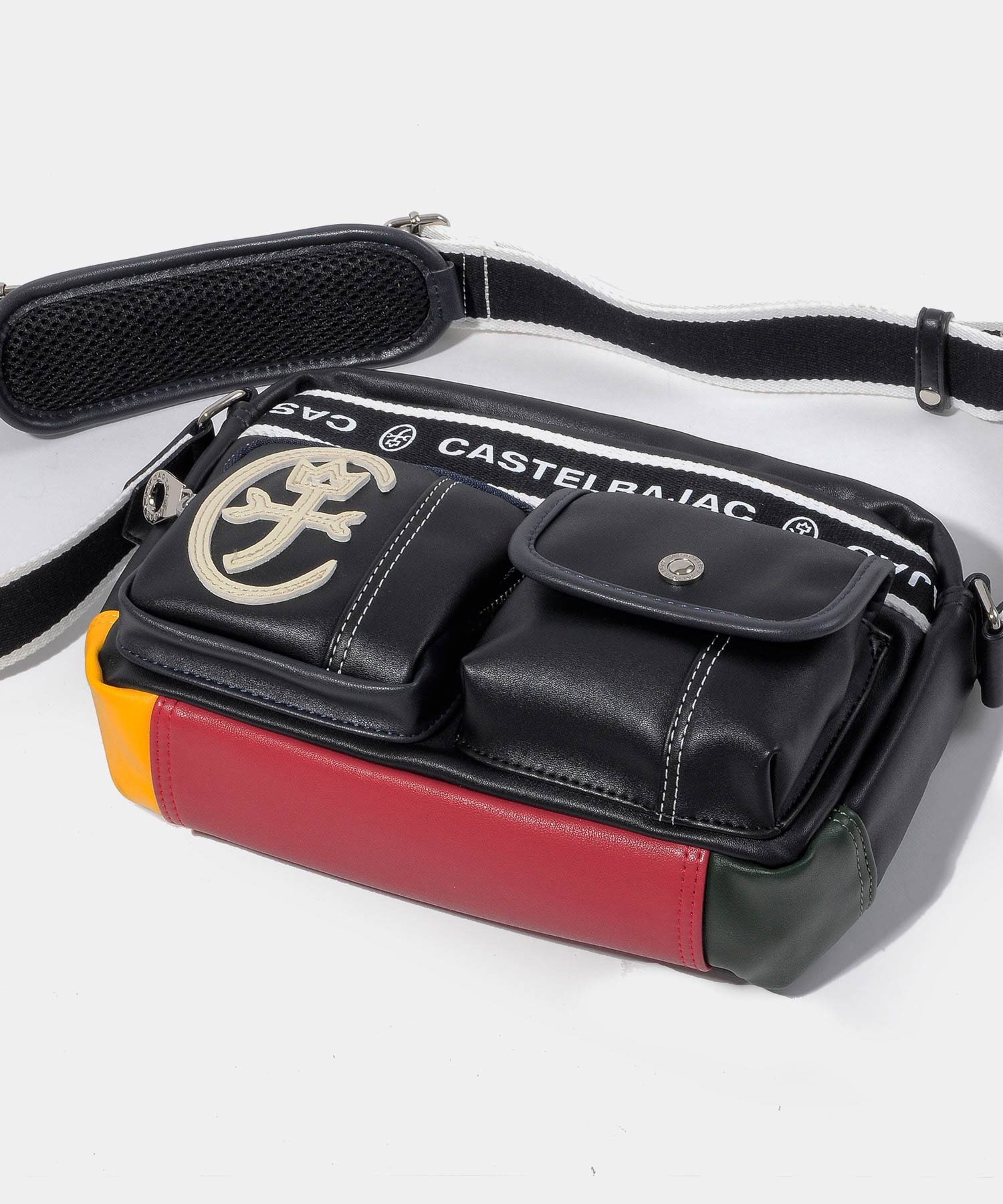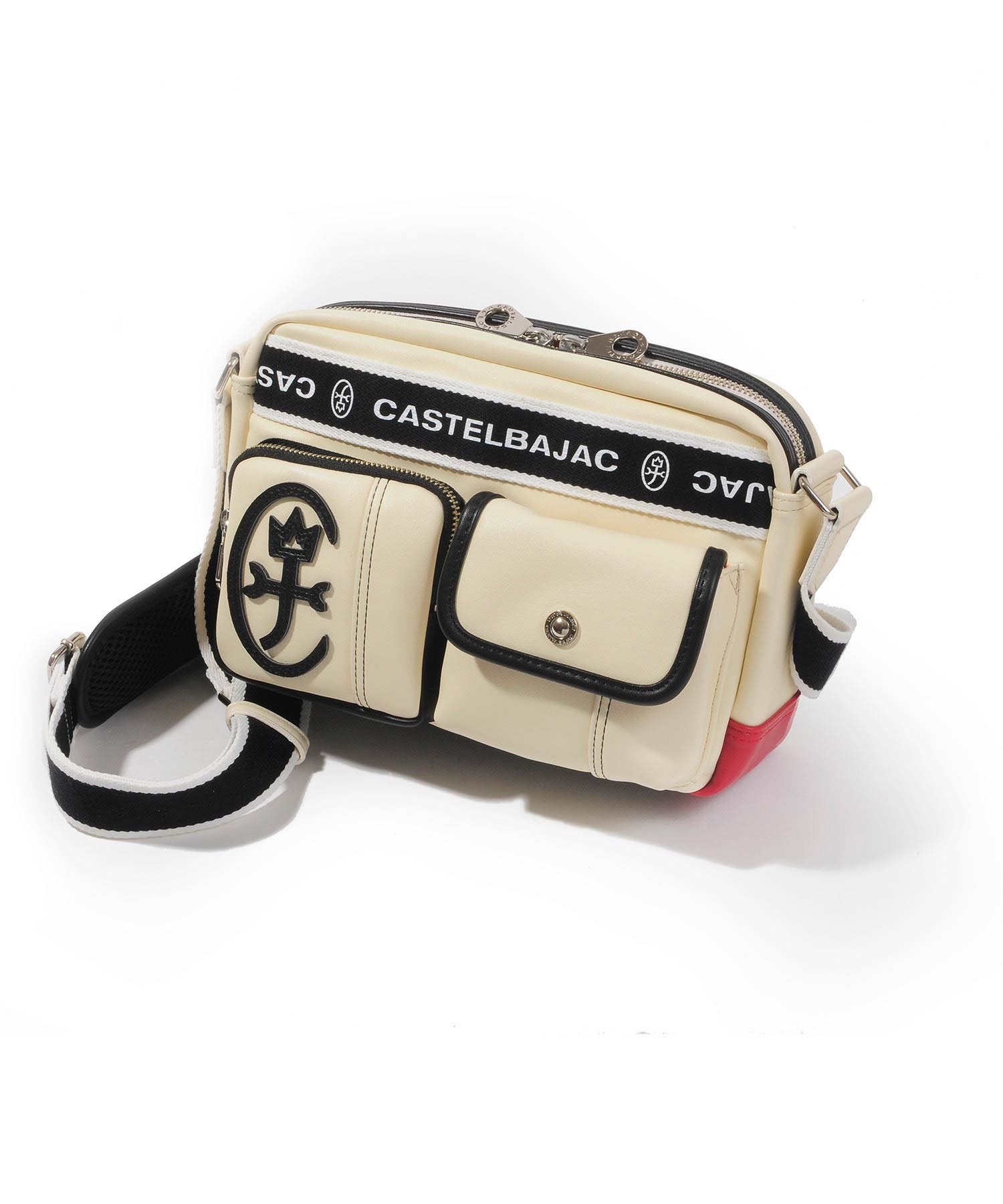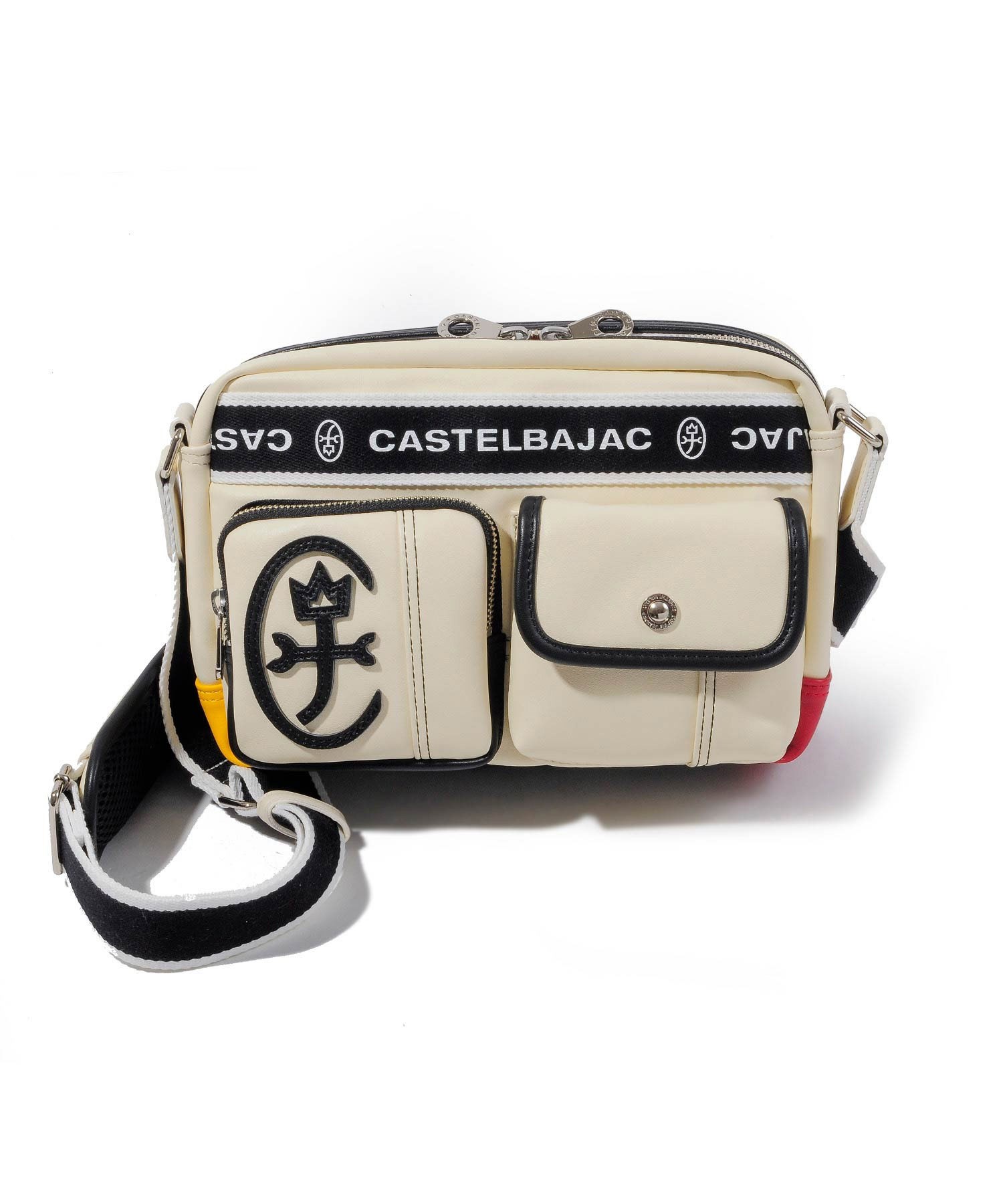 ベーシックな本体カラーにカステルバジャックらしい4原色がちらりとのぞく配色がポイントのドミネシリーズのカジュアルショルダーバッグ。マチ付きの便利な外ポケットや580gと軽量な仕様も魅力です。