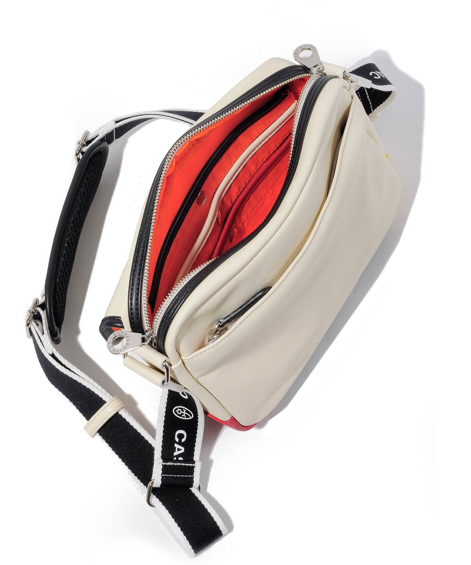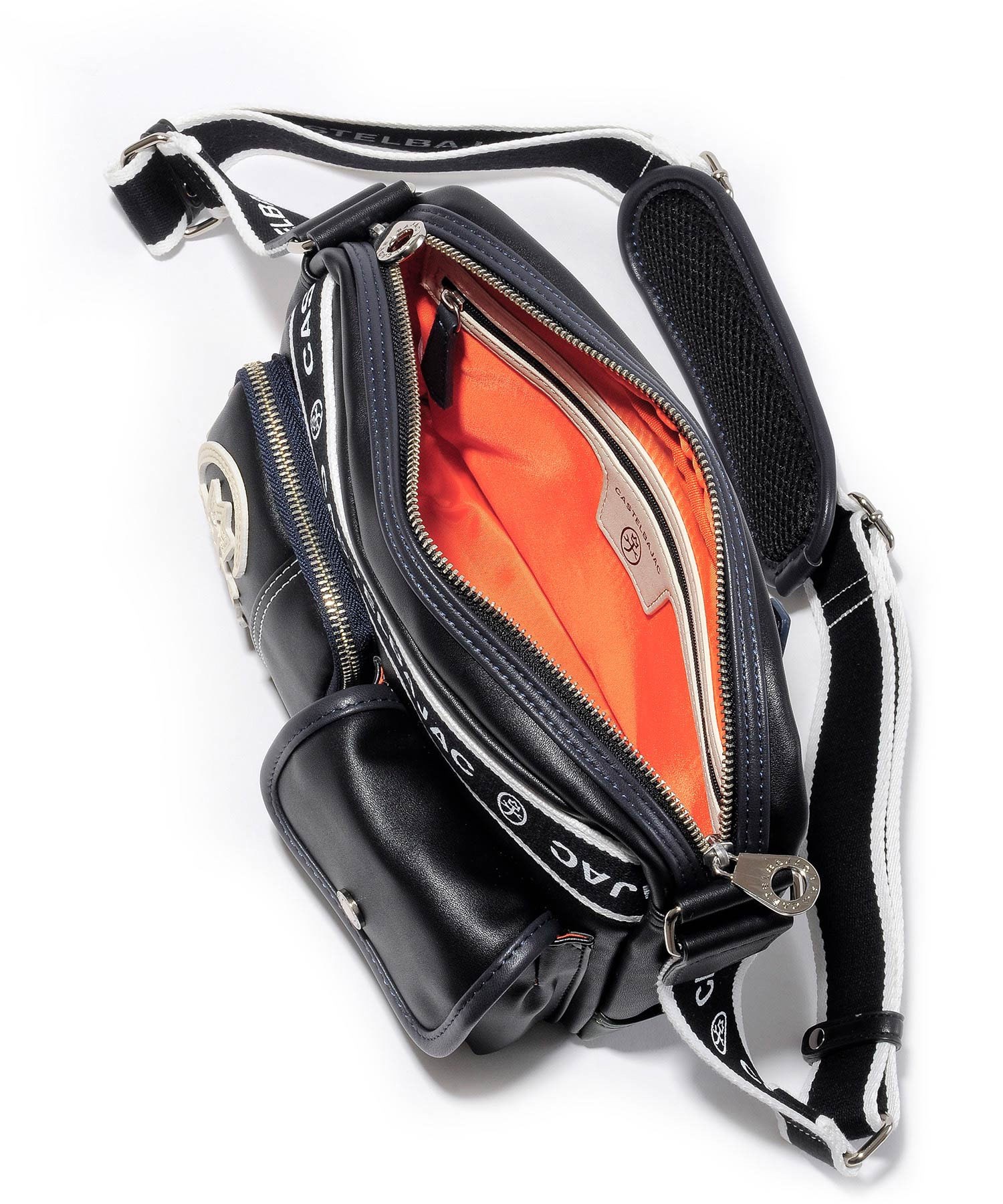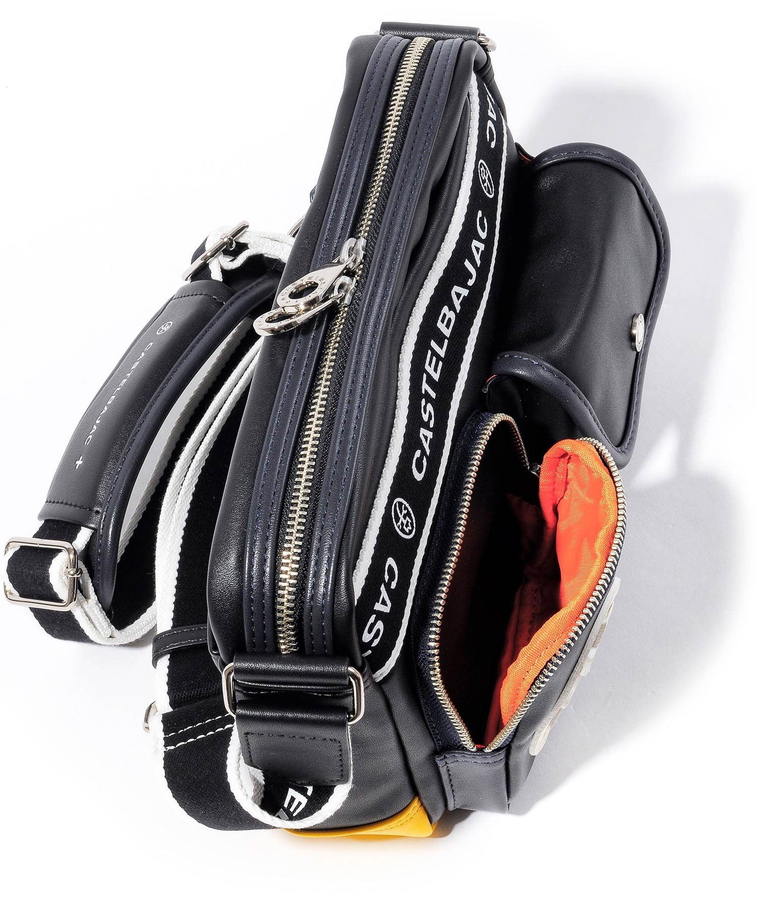 カステルバジャックオリジナルのショルダーテープは、ロゴがあえて内側になるように取り付けてあり、本体でのロゴ表現とは逆にシンプルに仕上げられています。