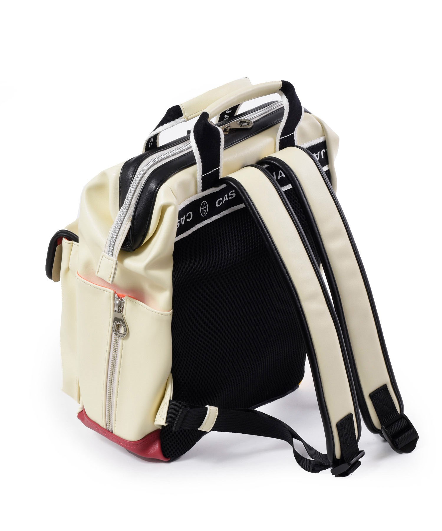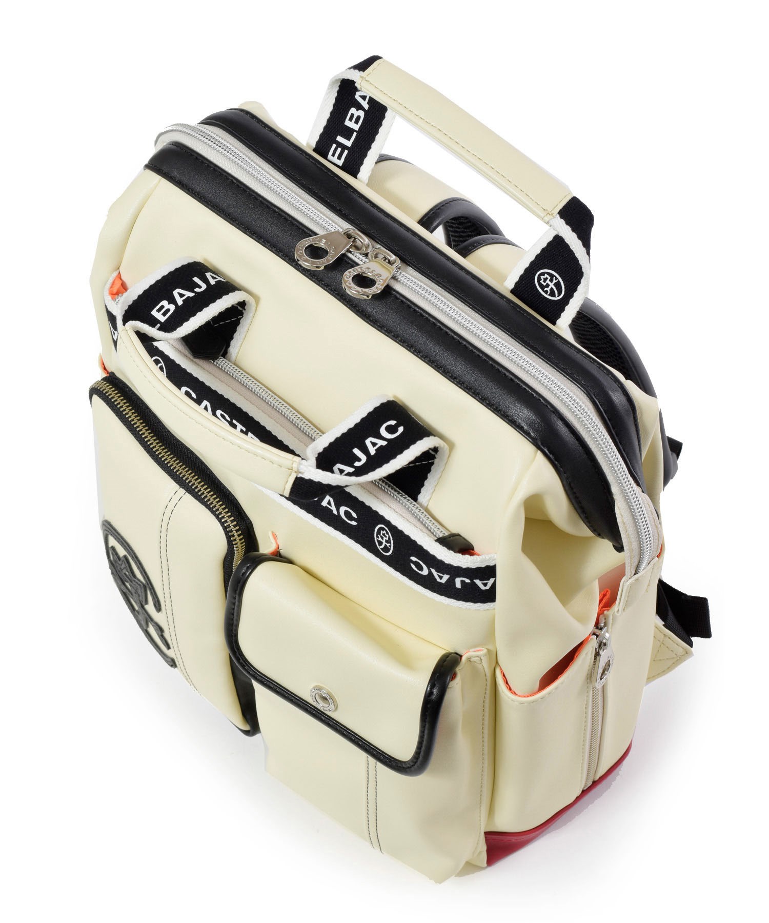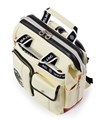前面ファスナーポケット 前面ファスナーアウトポケット (約 幅12.5x高20.5cm) 前面カブセアウトポケット(約 幅12.5x高20.5 cm) 両サイドポケット(約 幅12x高20 cm) ファスナーポケット 3段仕切りポケット