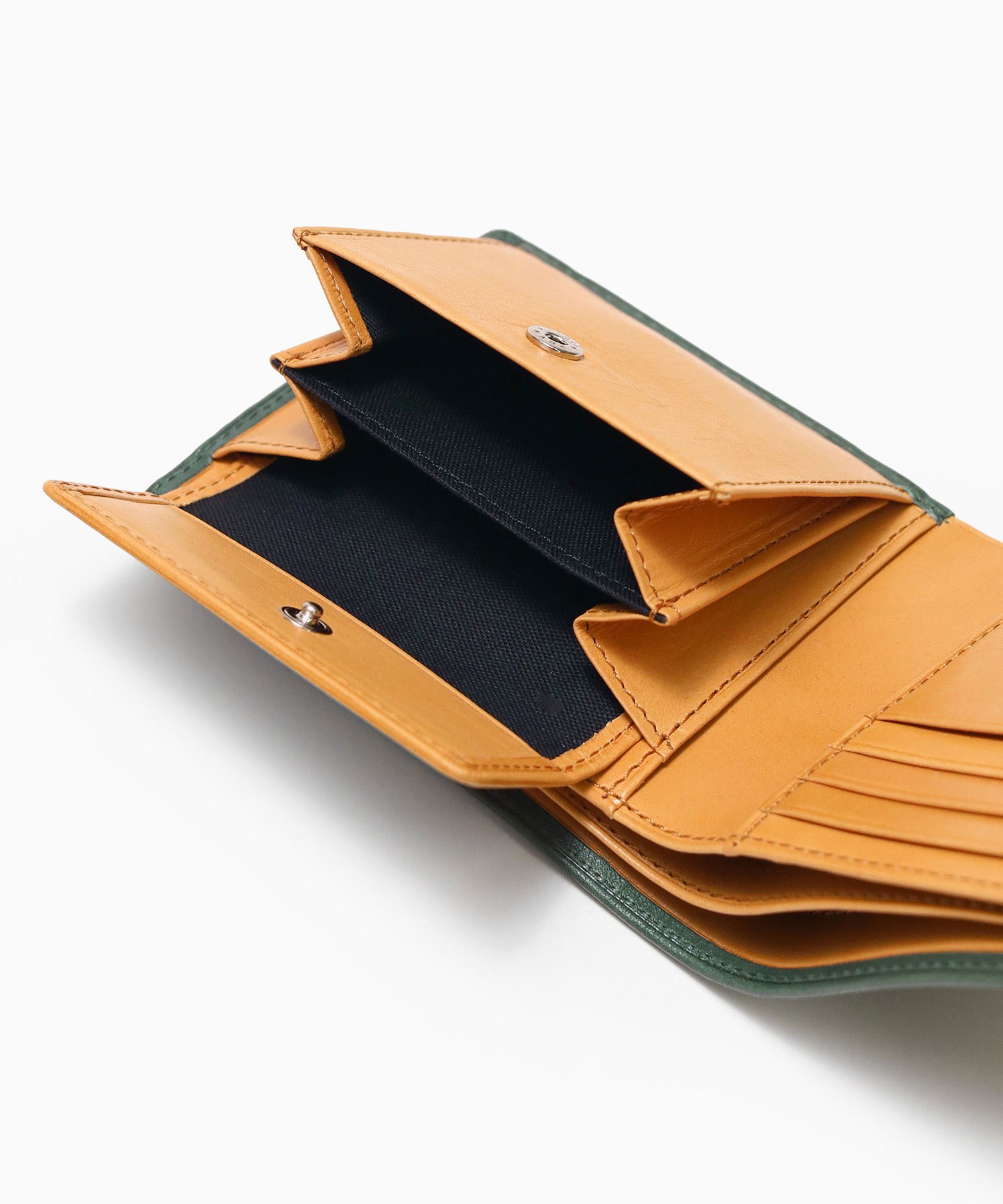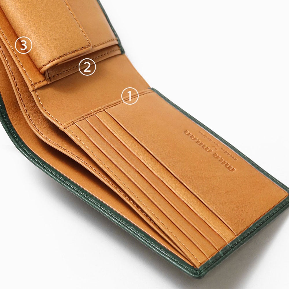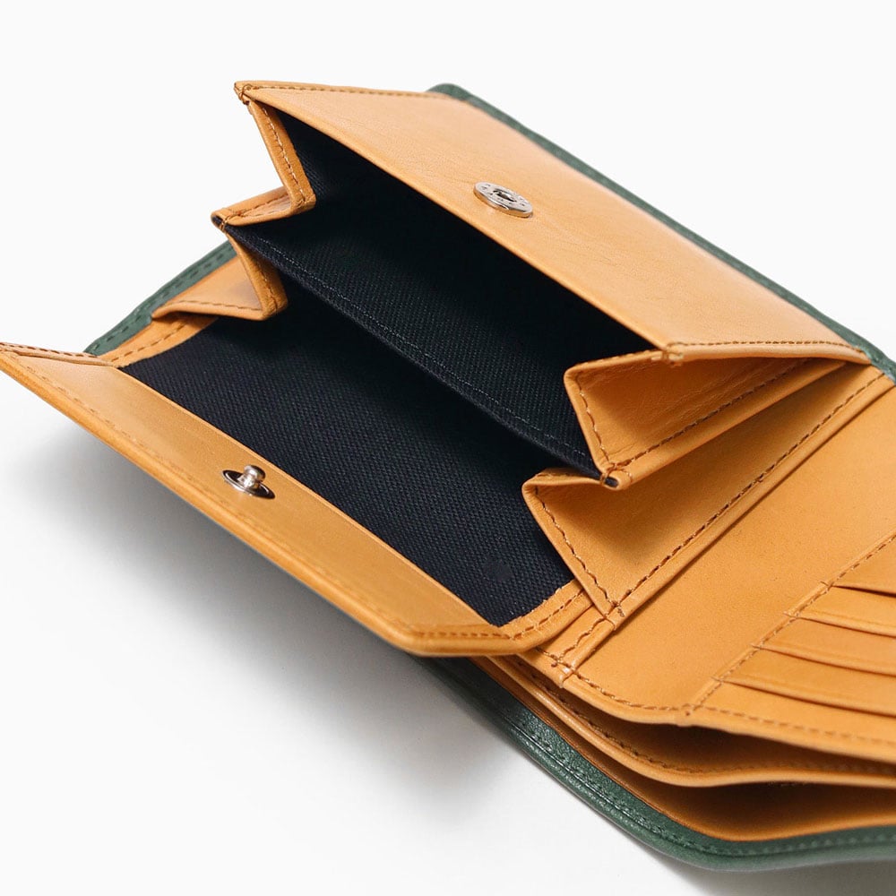 革本来の風合いが楽しめる二つ折り財布。本体素材にはクロムフリーで仕上げたヌメ革を採用。仕上げ材をほぼ使用していないため、アニリン仕上げの透明感がより活かされた表情となっております。