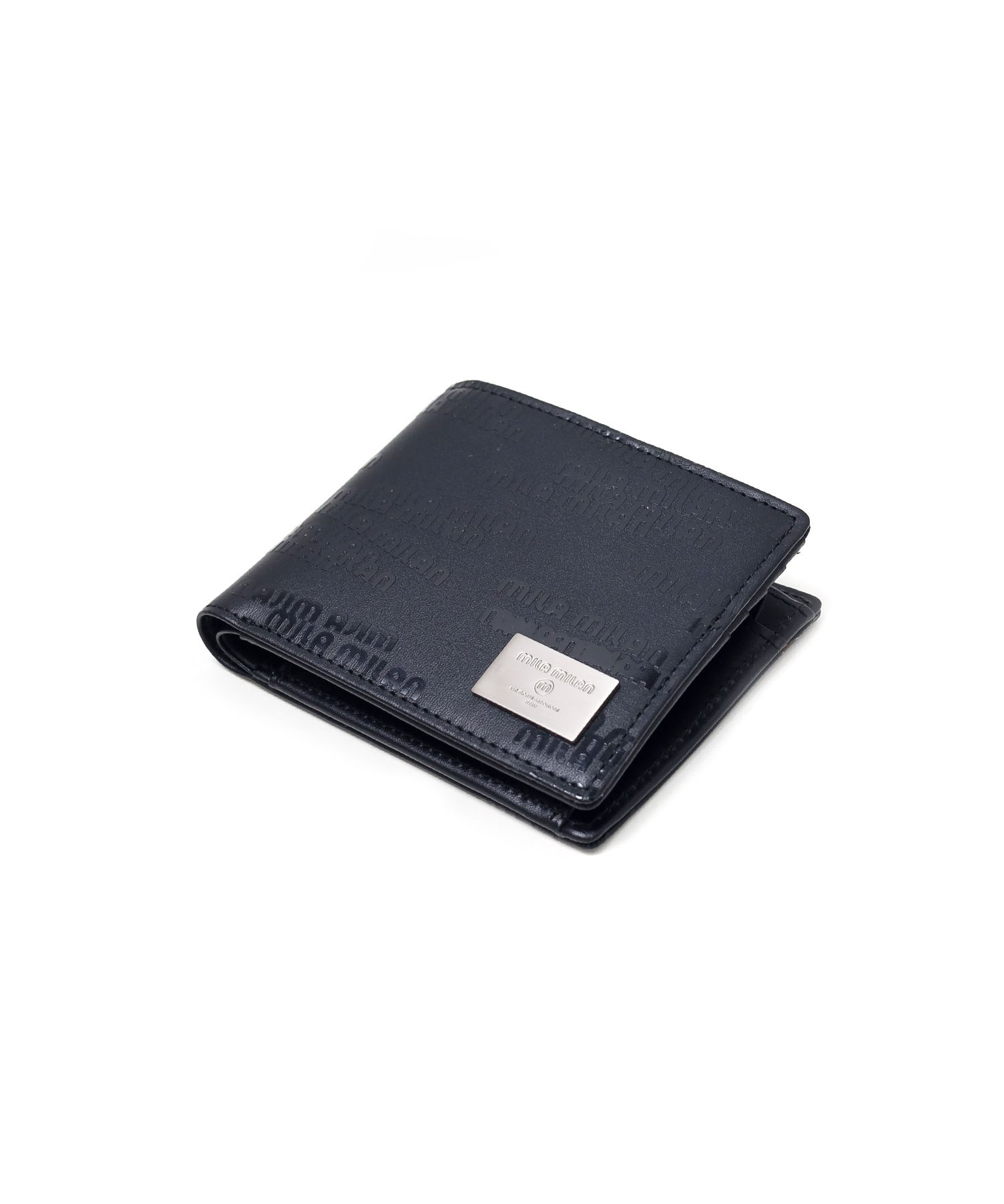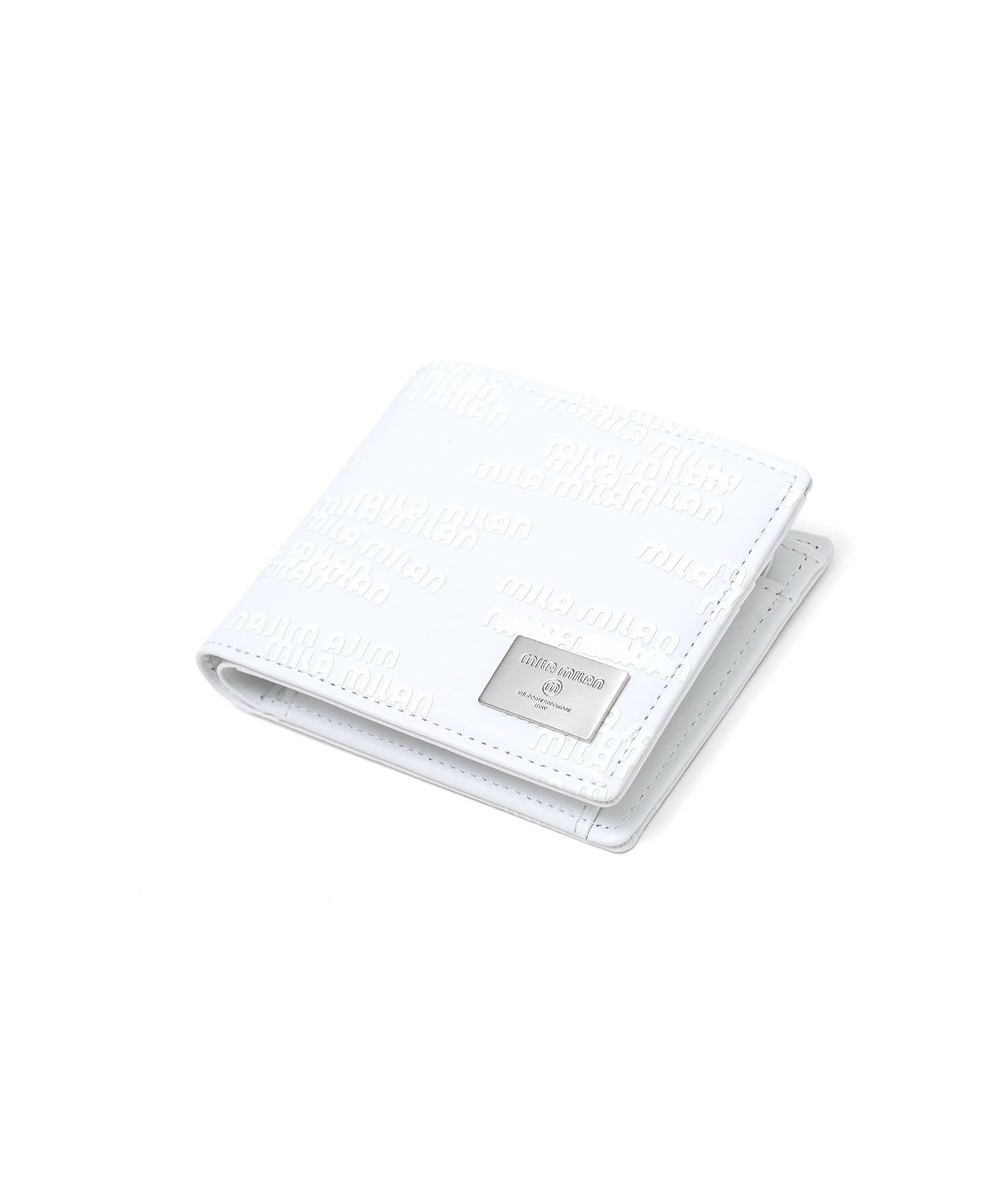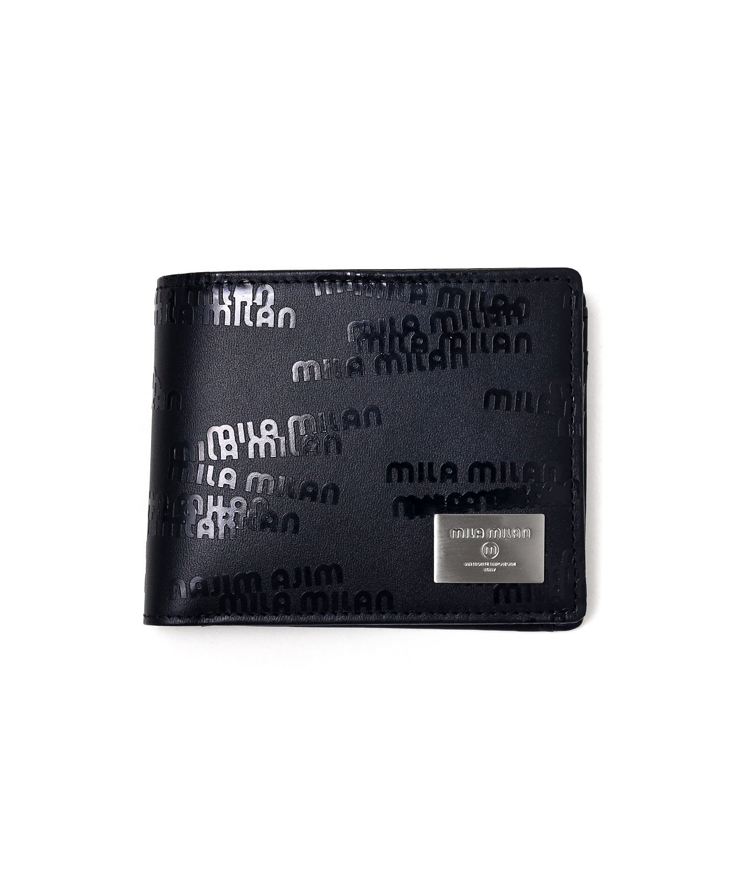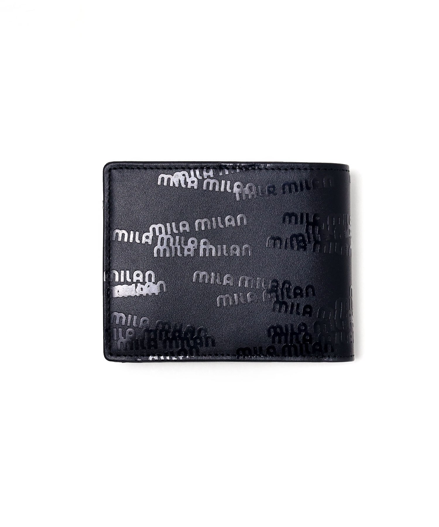 全面プリントのインパクトあるミラ・ミランの二つ折り財布。トーンオントーンにツヤ感のあるロゴがプリントされているため、一見シンプルに見えますが光の加減でいろいろな表情に変化します。男女ともに使っていただける、シンプルすぎず派手すぎないデザインです。