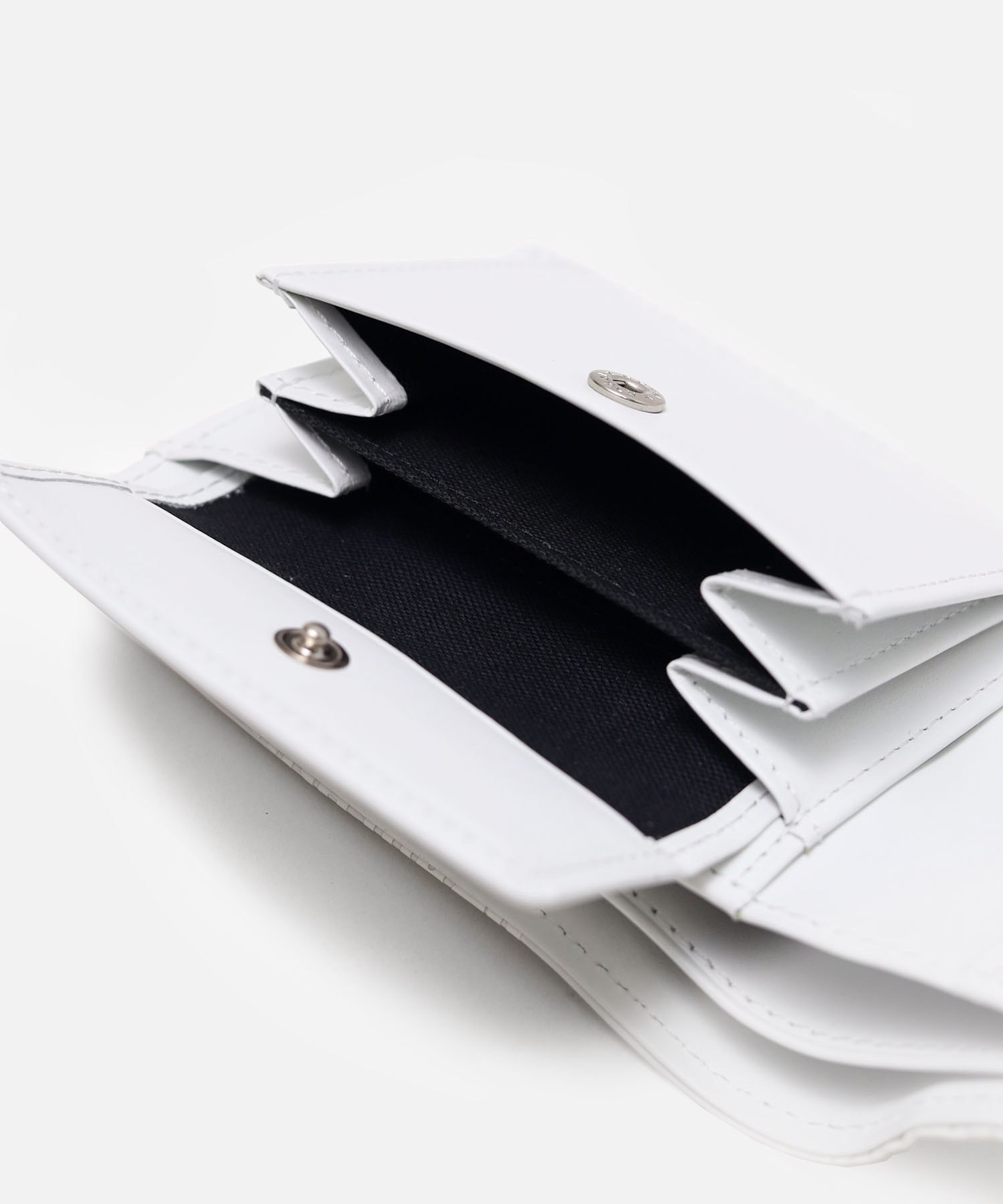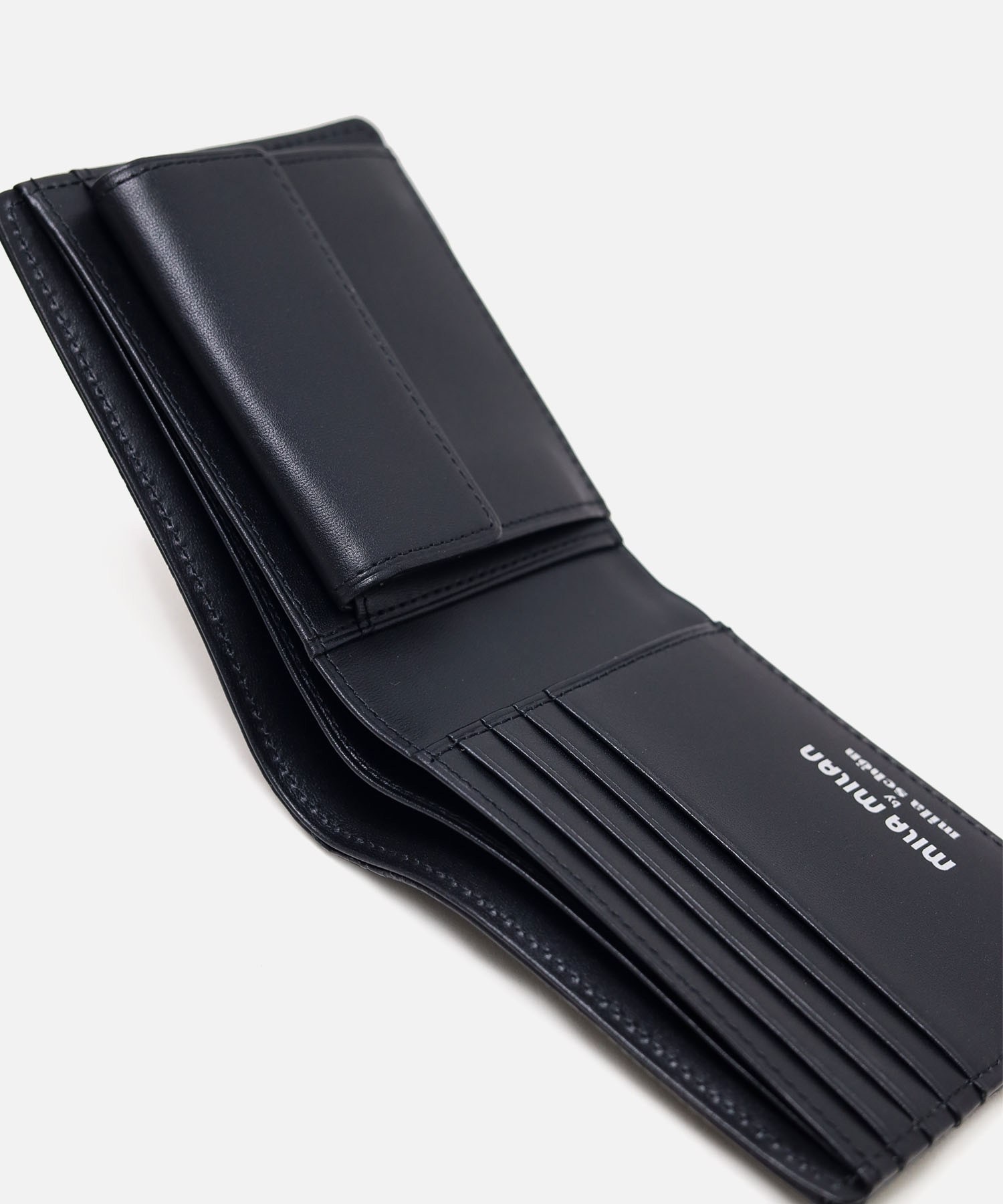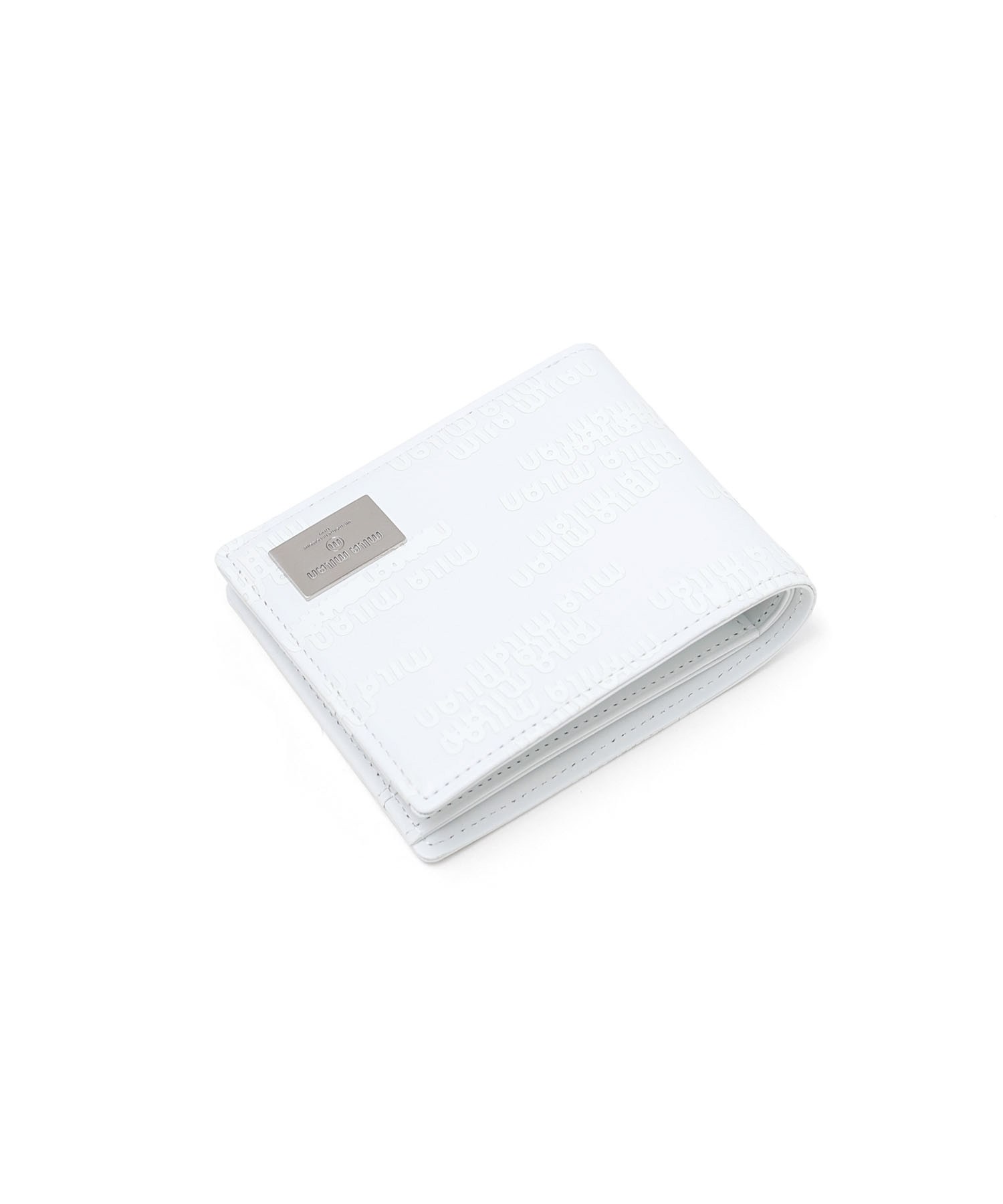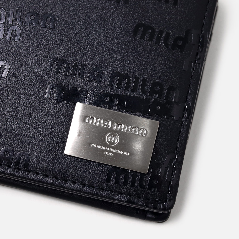 全面プリントのインパクトあるミラ・ミランの二つ折り財布。トーンオントーンにツヤ感のあるロゴがプリントされているため、一見シンプルに見えますが光の加減でいろいろな表情に変化します。男女ともに使っていただける、シンプルすぎず派手すぎないデザインです。
