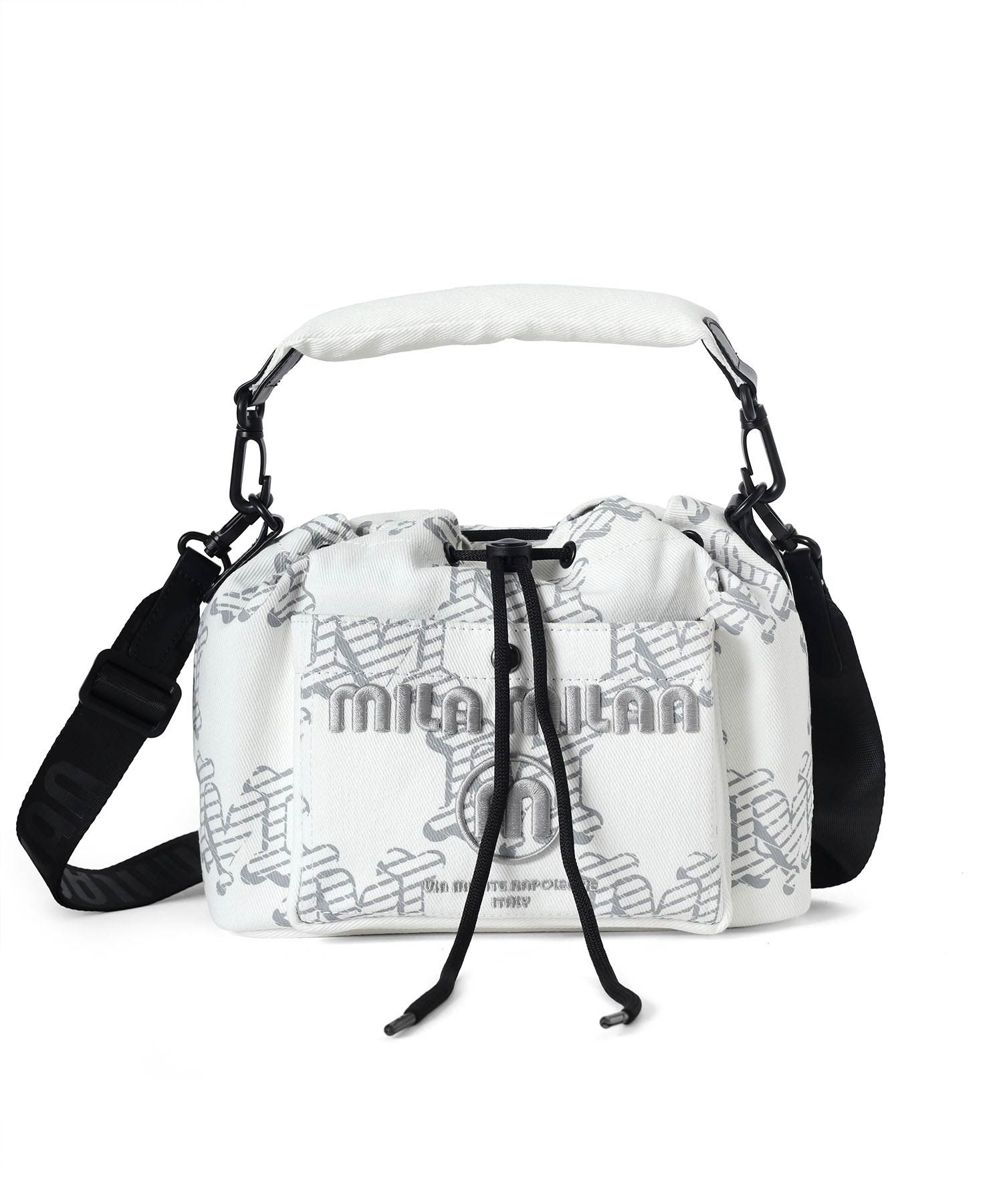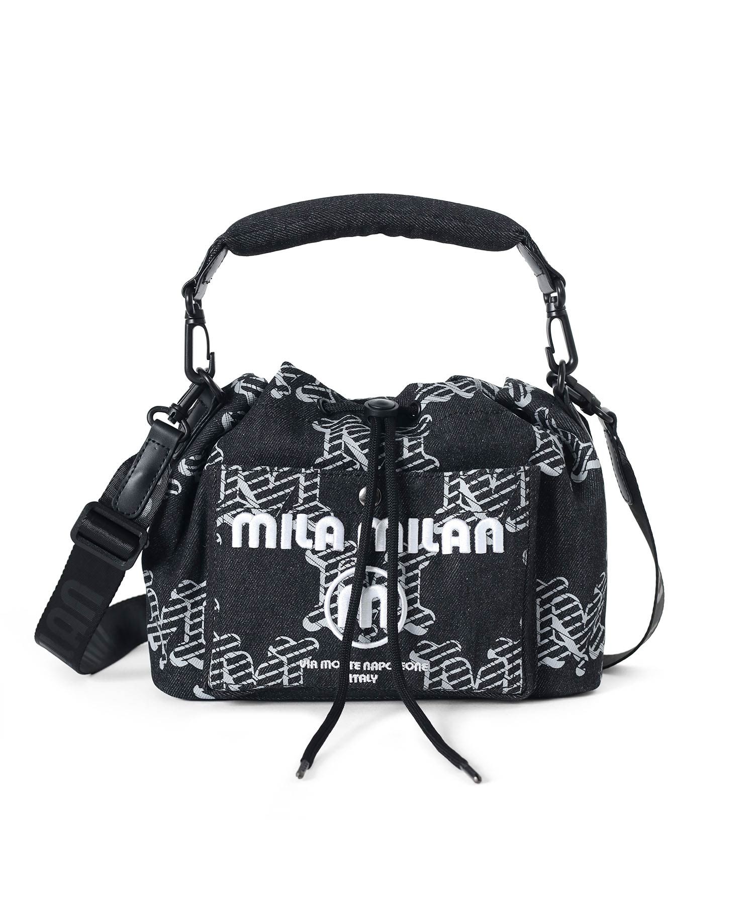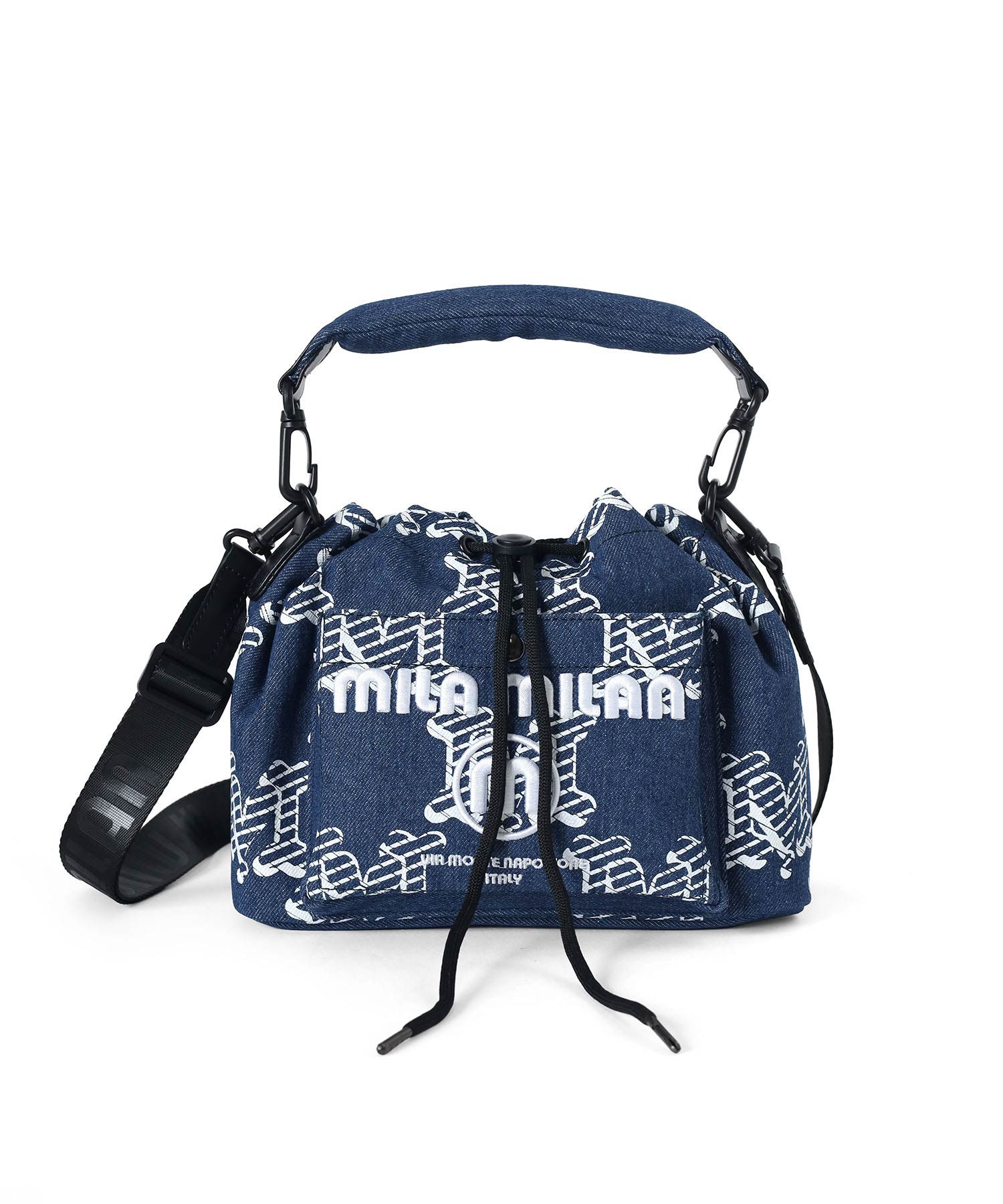 デニムのようにエイジングがかった生地に、ジャガード風プリントのモノグラム柄がポイントのmila milanの巾着ショルダーバッグ。 とても軽量に仕上げており、日常使いに活躍するカジュアルバッグです。