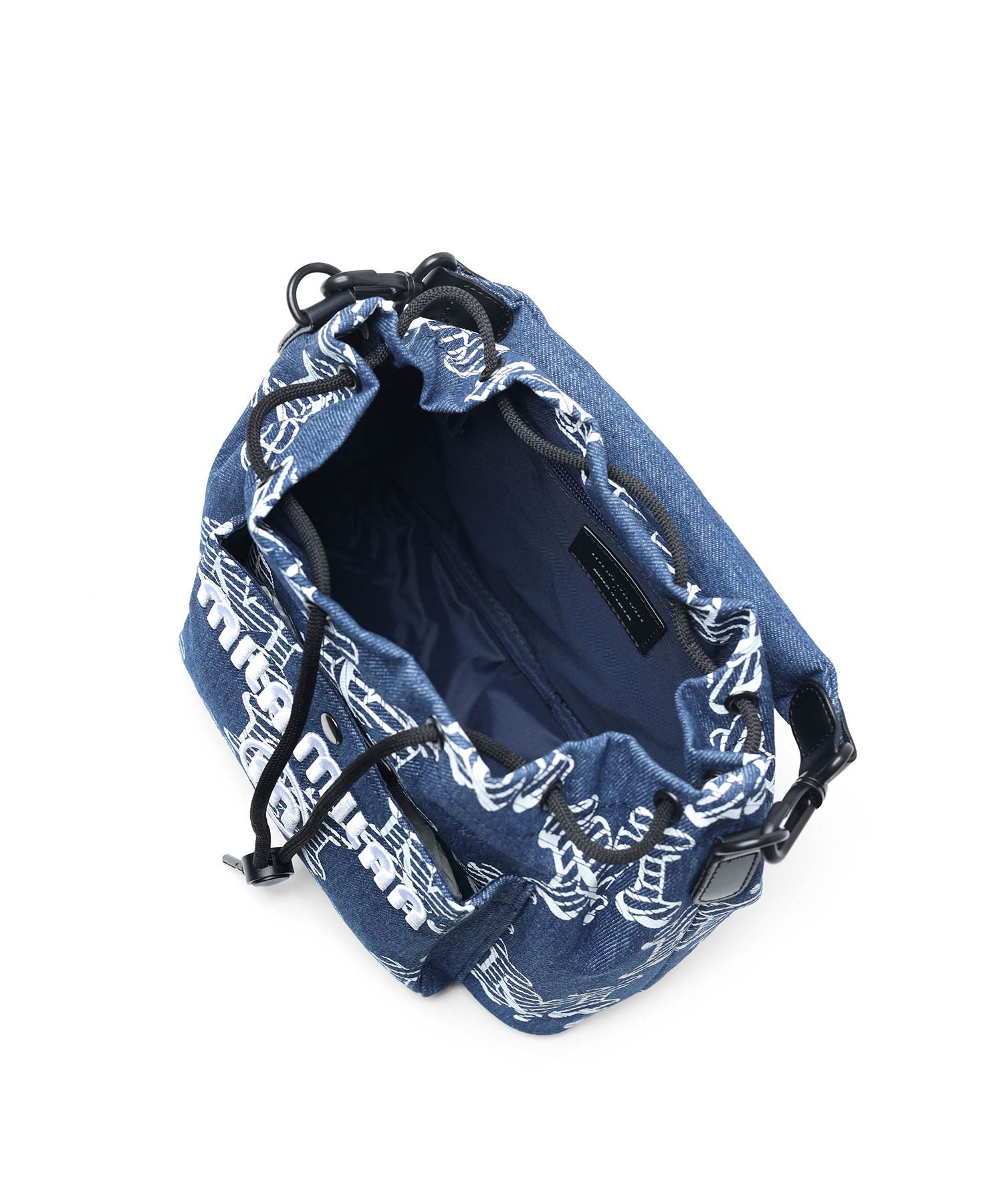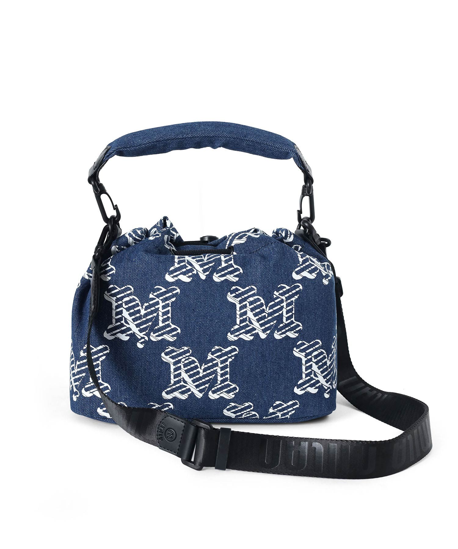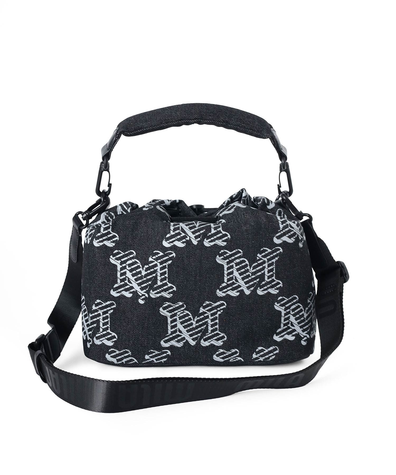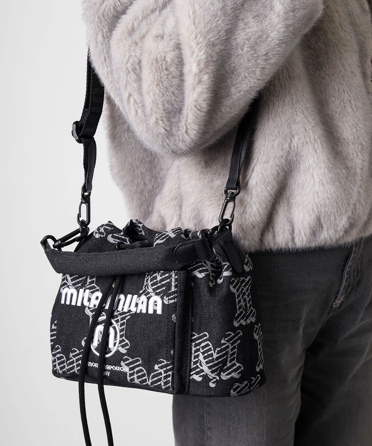 ミラミランの軽量デニムショルダーバッグ。口を絞る巾着タイプで手持ちも斜め掛けも可能です。洗いをかけて少しエイジングがかったような生地に、ジャガード風にプリントしたブランドモノグラム柄がポイントです。ポリエステル混紡素材なので、とても軽量に仕上がっています。