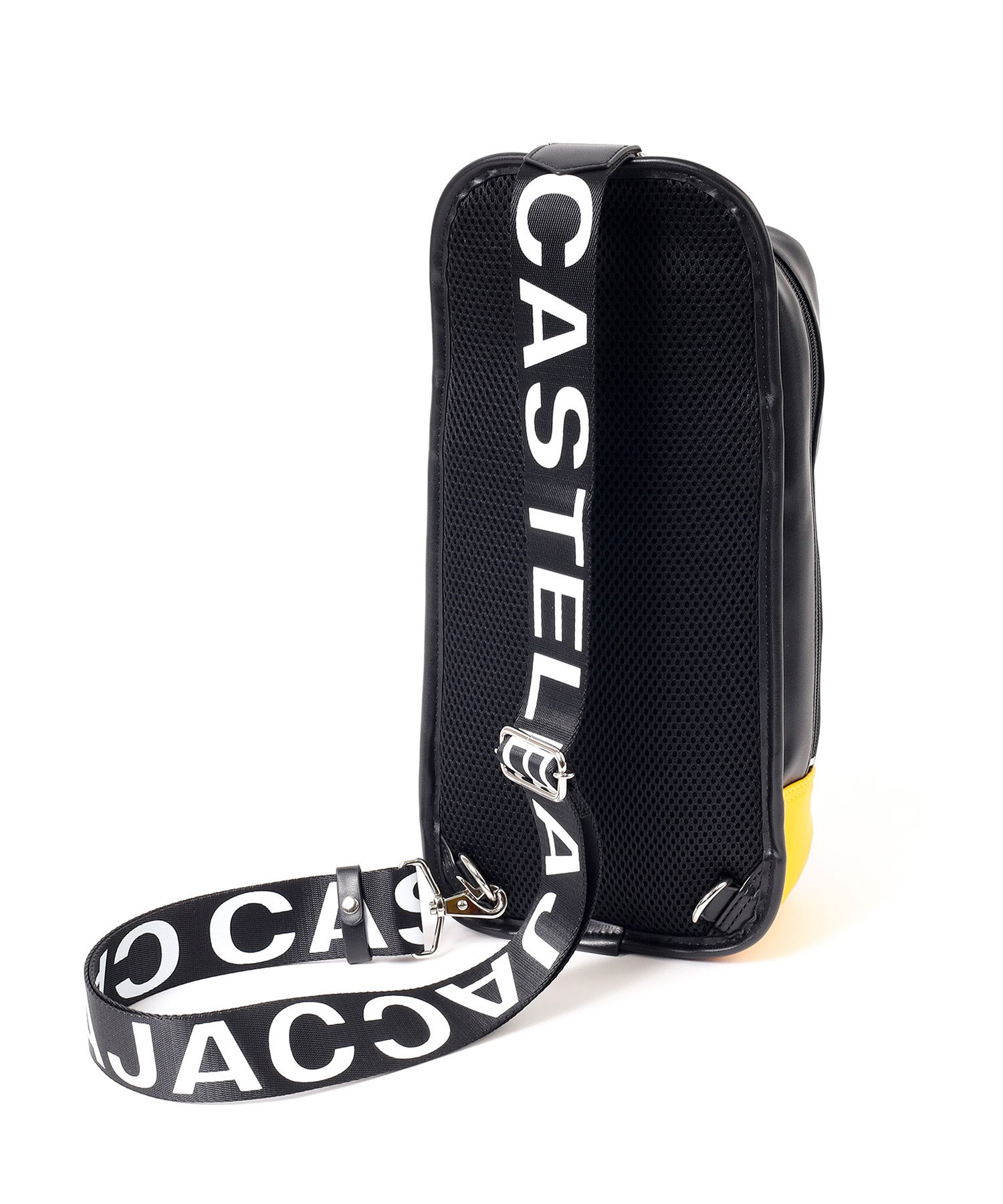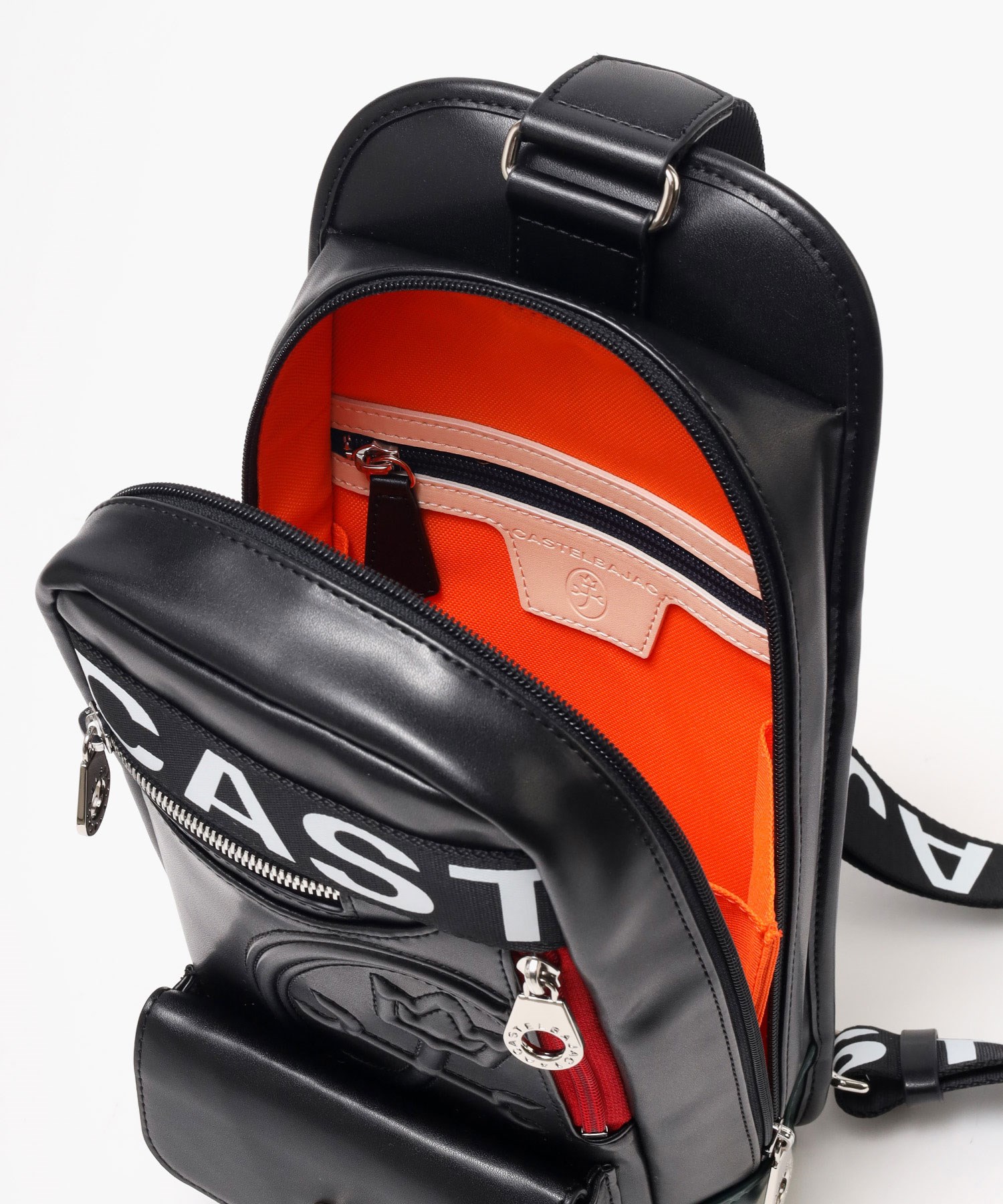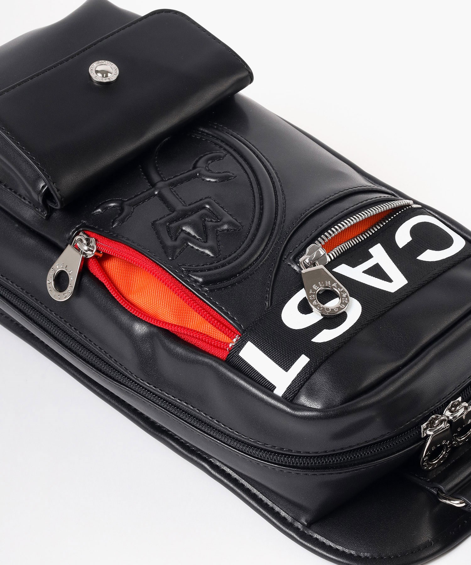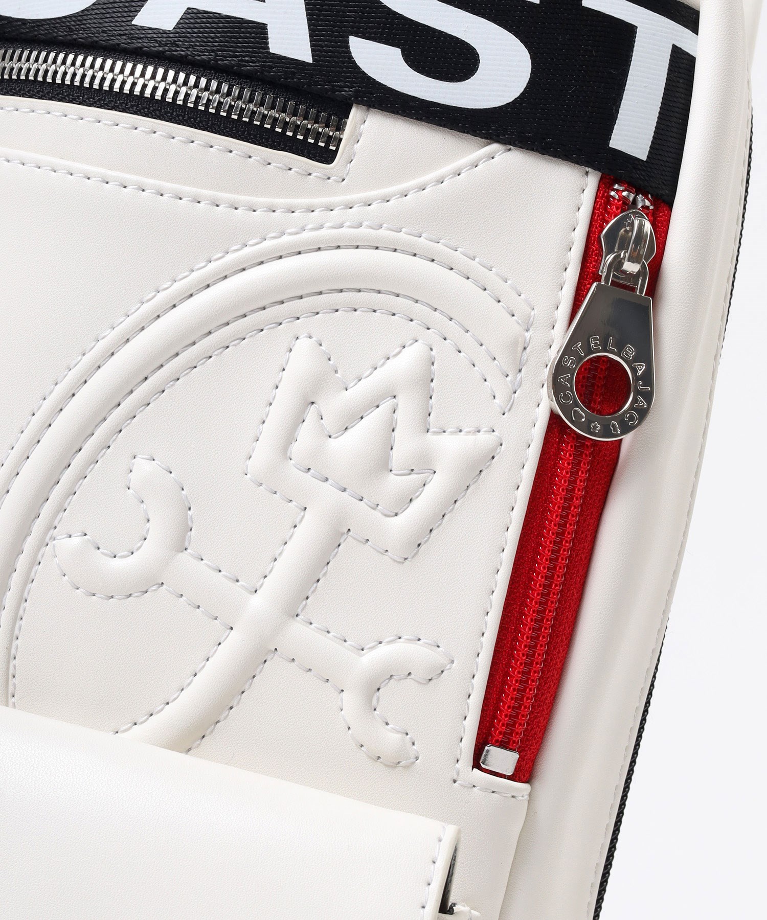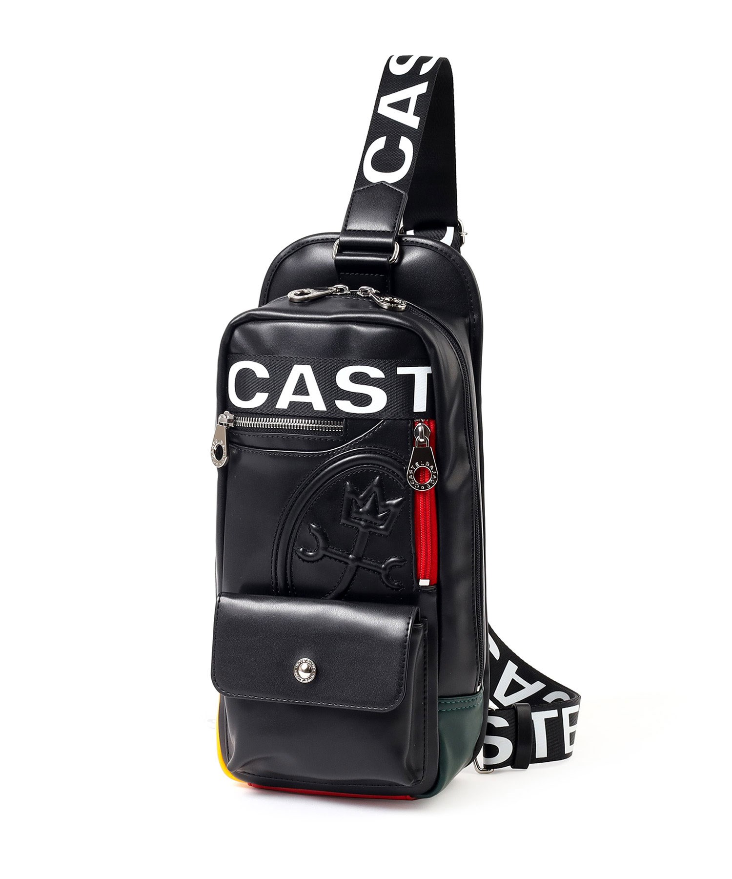 大きな盛り上げブランド家紋が目を引く、カステルバジャックのワンショルダーバッグ。赤色のファスナーや、底面のアカ・グリーン・イエローの鮮やかなブランドカラーがアクセントとなっており、バッグ全体が一層際立つデザインとなっています。