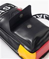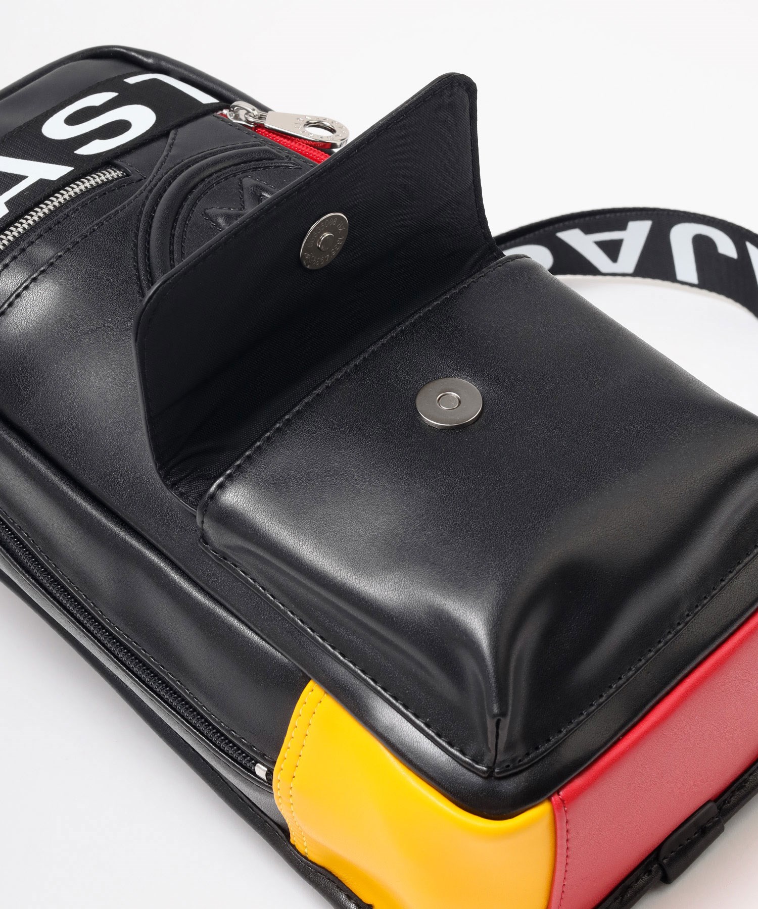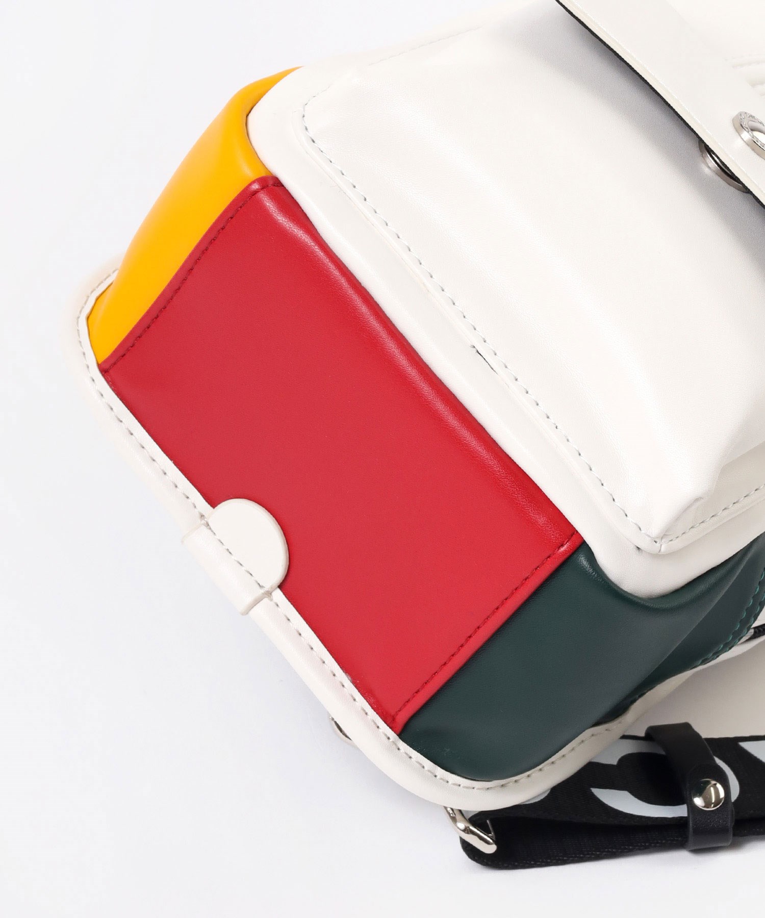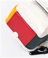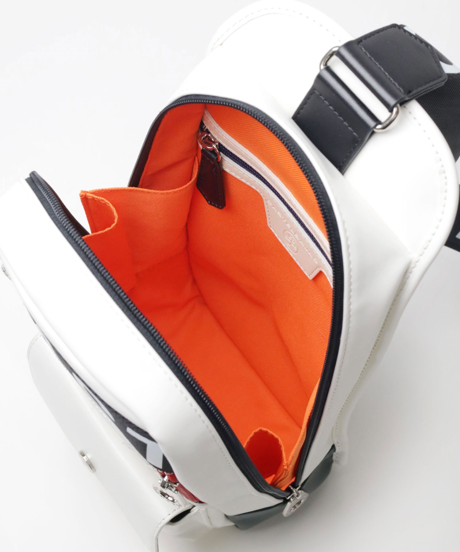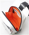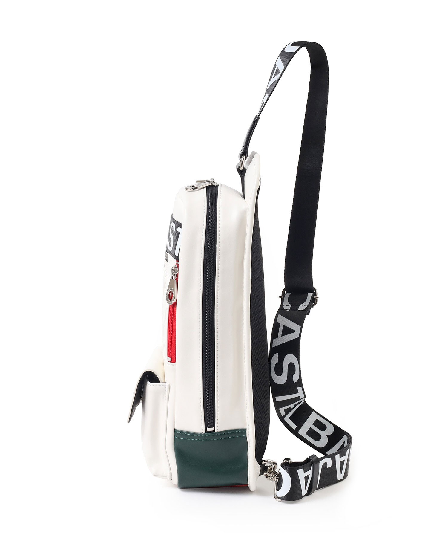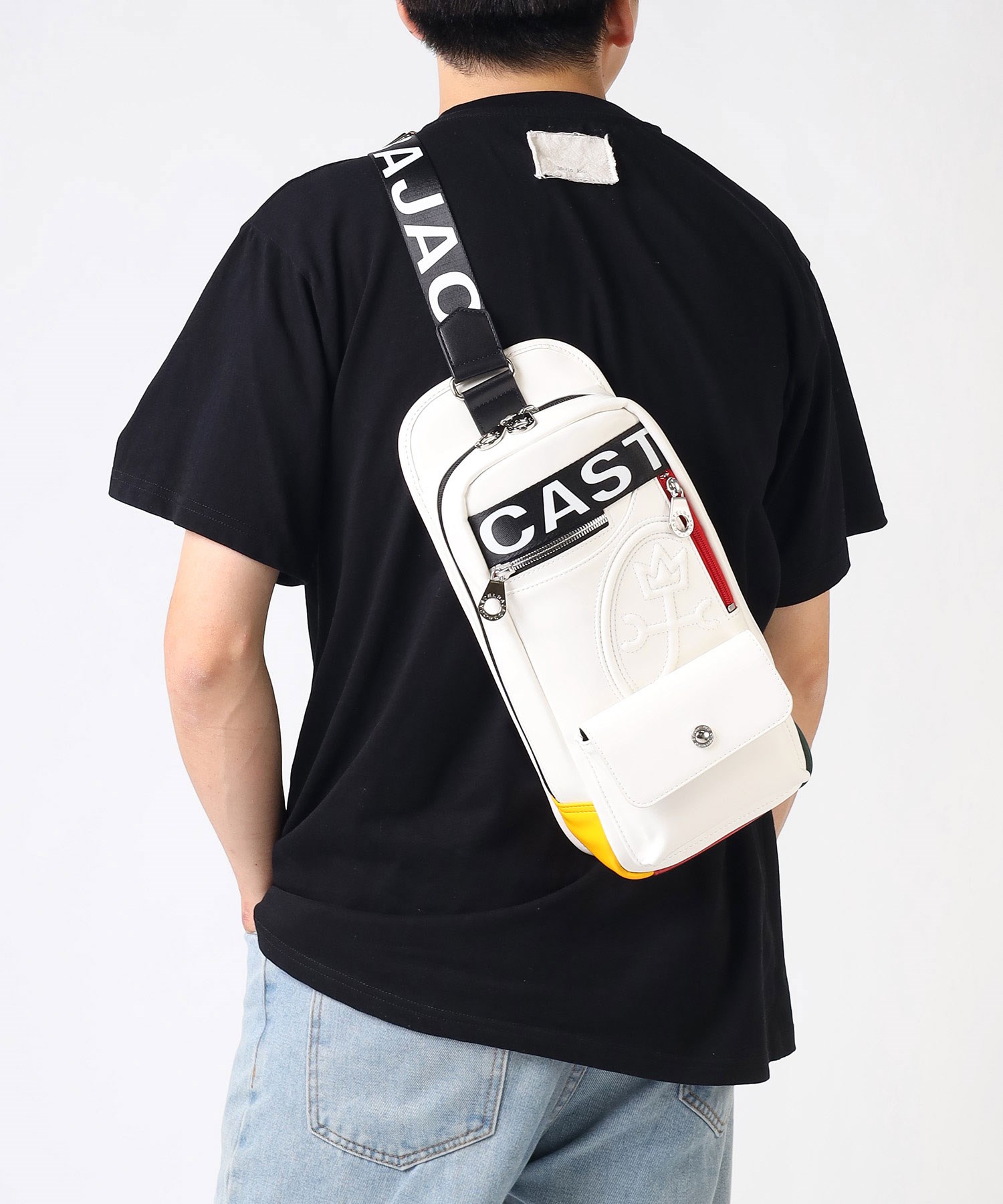 大きな盛り上げブランド家紋が目を引く、カステルバジャックのワンショルダーバッグ。赤色のファスナーや、底面のアカ・グリーン・イエローの鮮やかなブランドカラーがアクセントとなっており、バッグ全体が一層際立つデザインとなっています。
