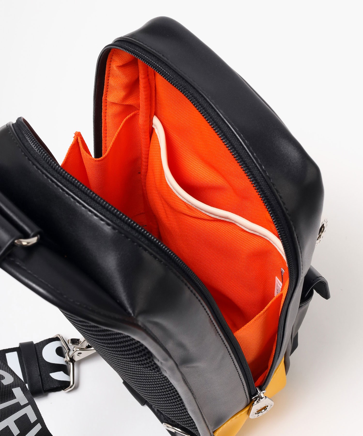 メインルームは500mlのペットボトルを立てて収納可能なサイズで、ファスナーポケットが1つとオープンポケットが1つあり、整理整頓がしやすい設計です。前面にはマグホックポケットが1つとファスナーポケットが2つあり、すぐに取り出したい物の収納に便利です。