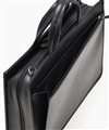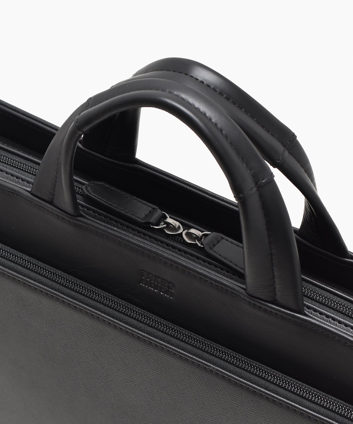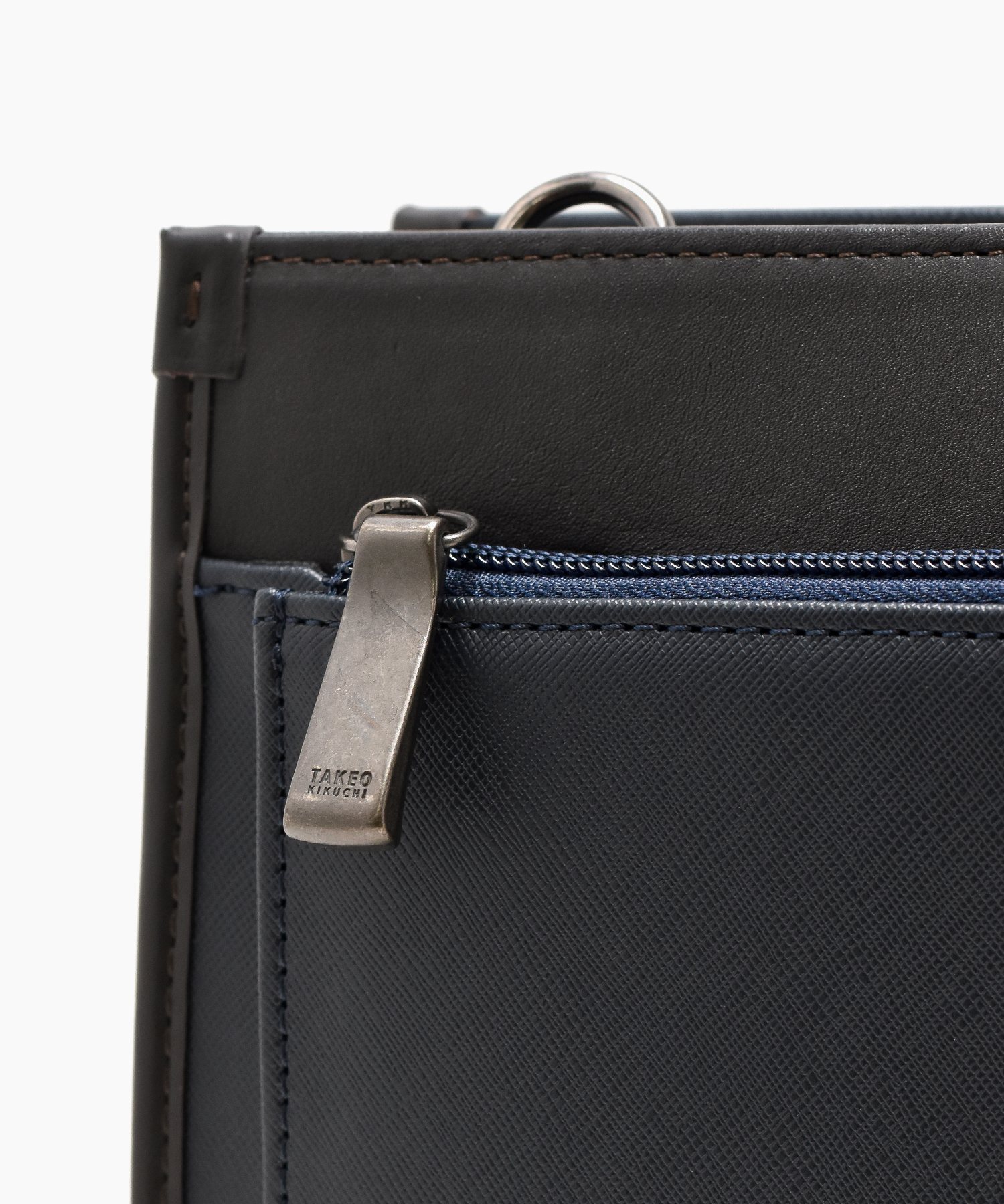 撥水力のある、革のような雰囲気の加工を施したポリ塩化ビニルを使用した、タケオキクチのA4サイズビジネスバッグ。 ポケットが多く、収納が充実した機能的な作りです。