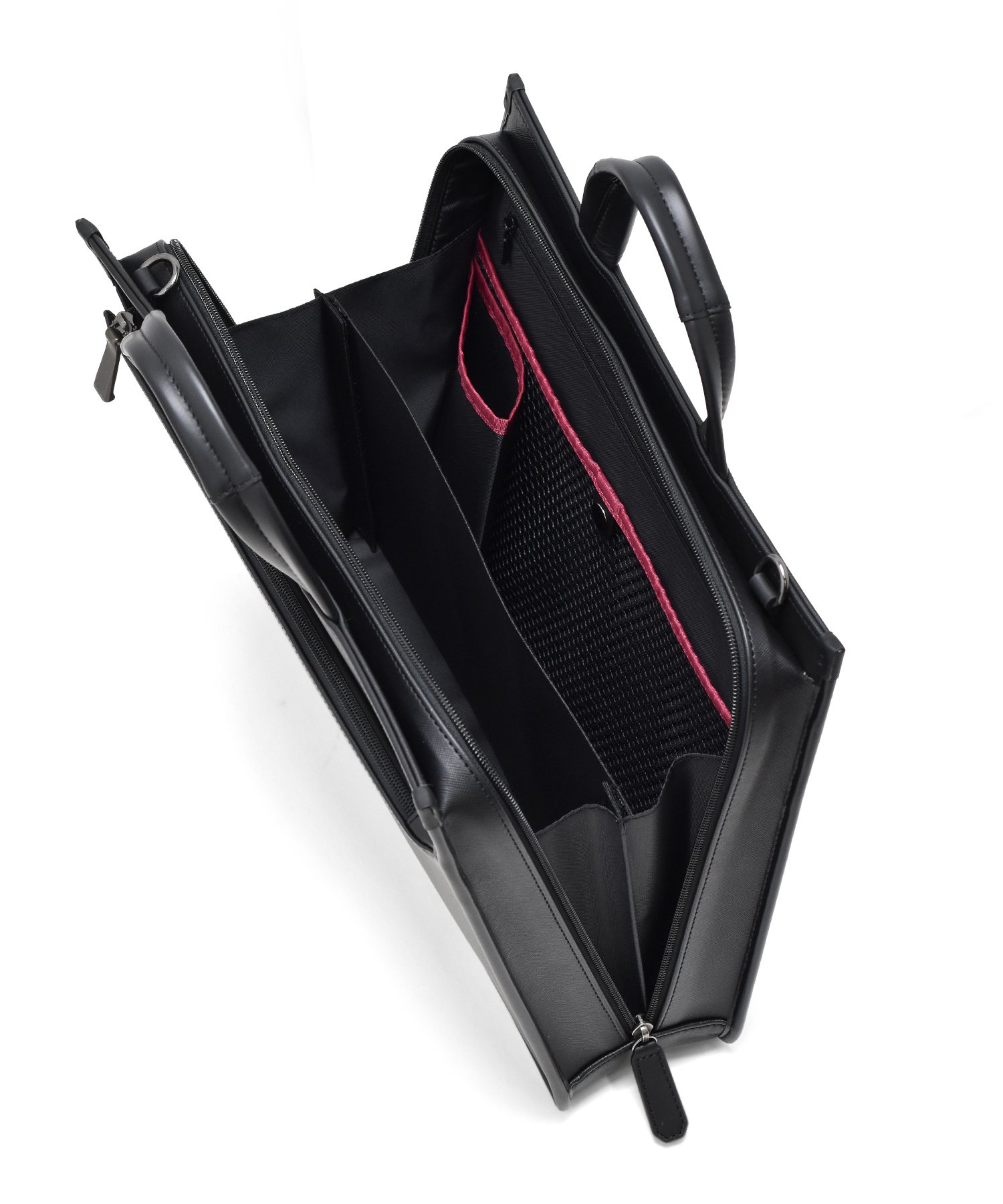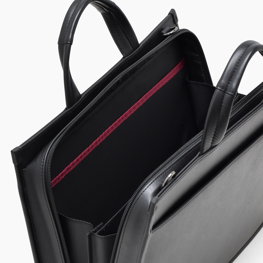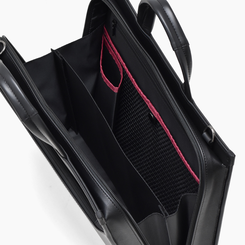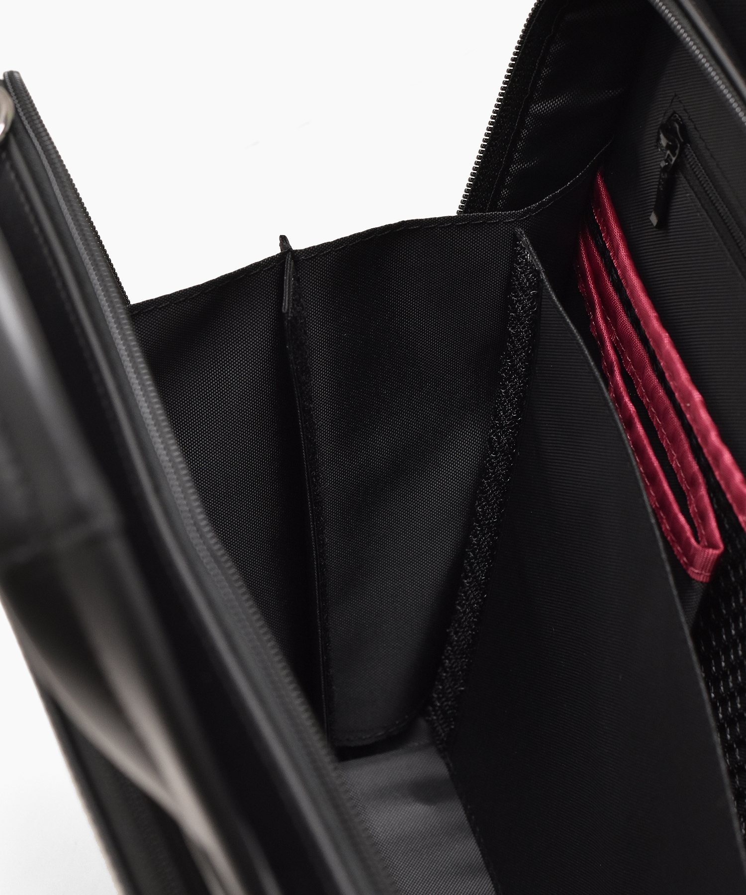 メインルームにはA4ファイルがすっぽり収まる余裕のあるサイズ感になっています。また、ペットボトル専用のホルダーが備わっているので、鞄の中をすっきりと整理整頓できます。中の仕切りは取り外しが可能ですので、お弁当箱などマチのある物を収納する際には取り外すと便利です。