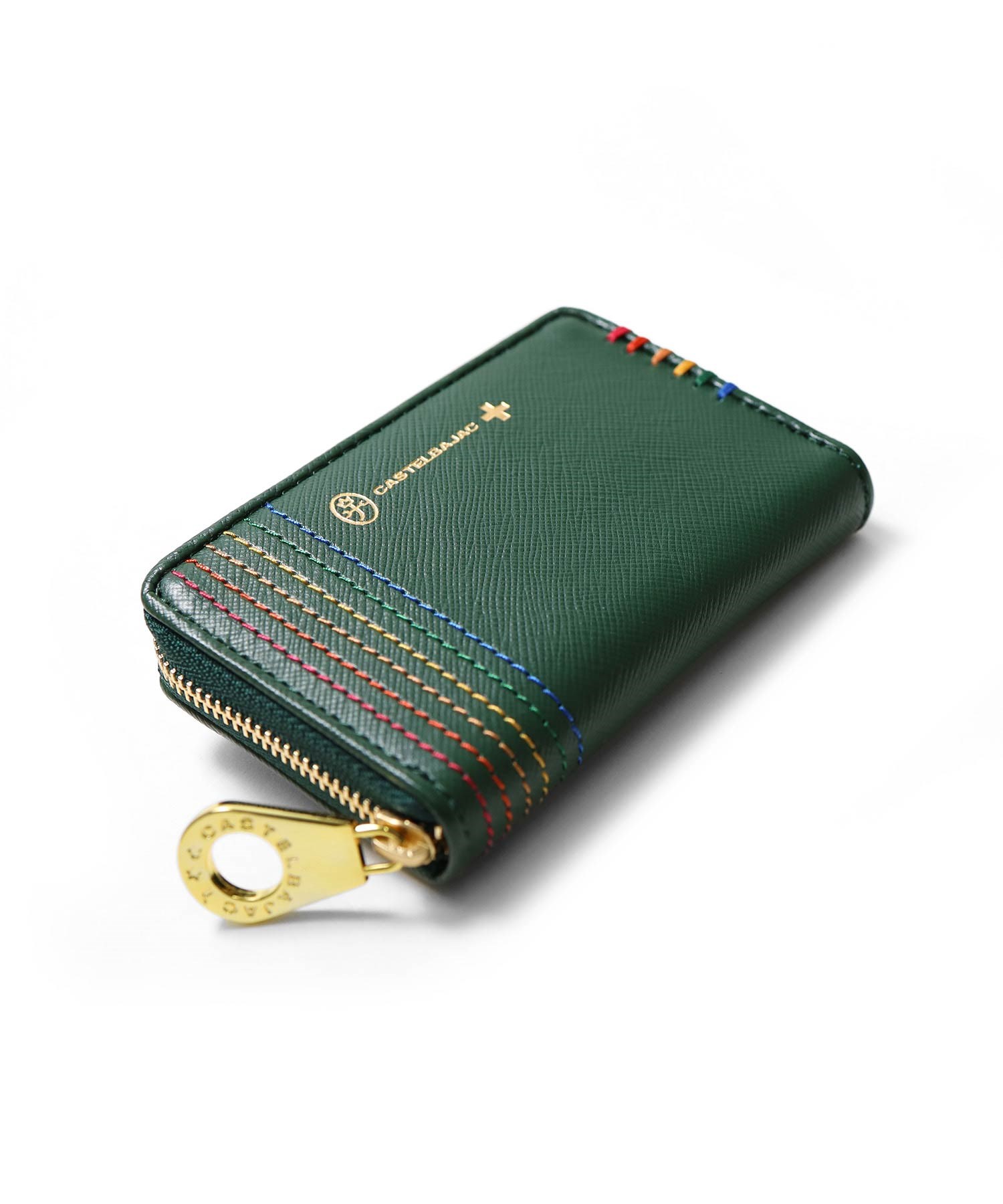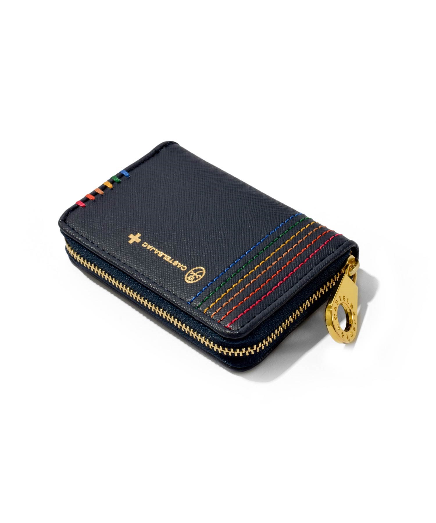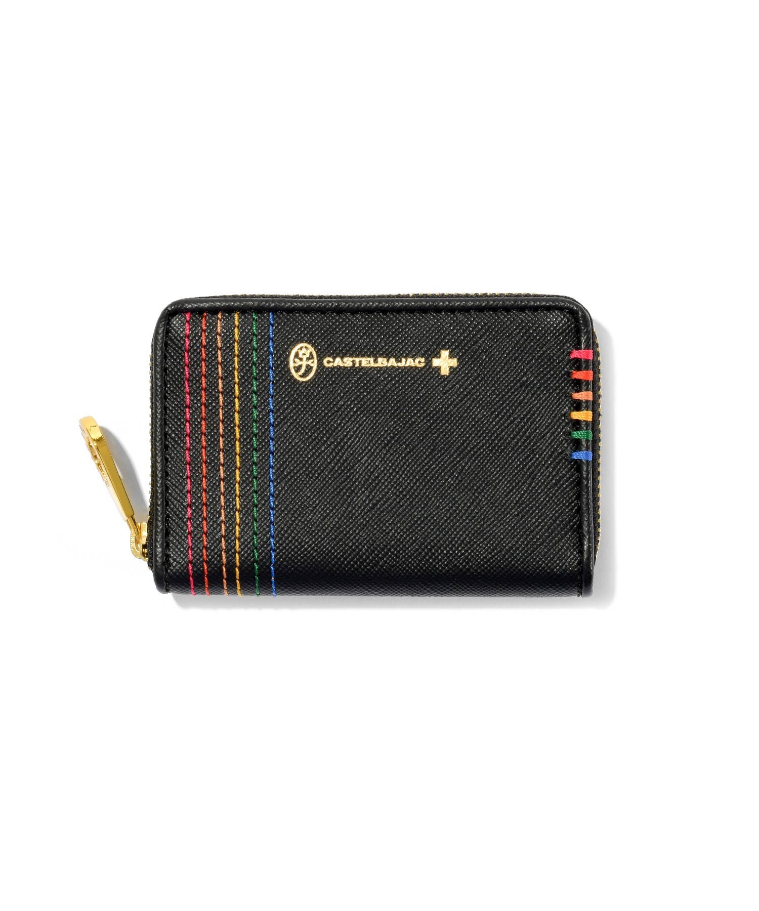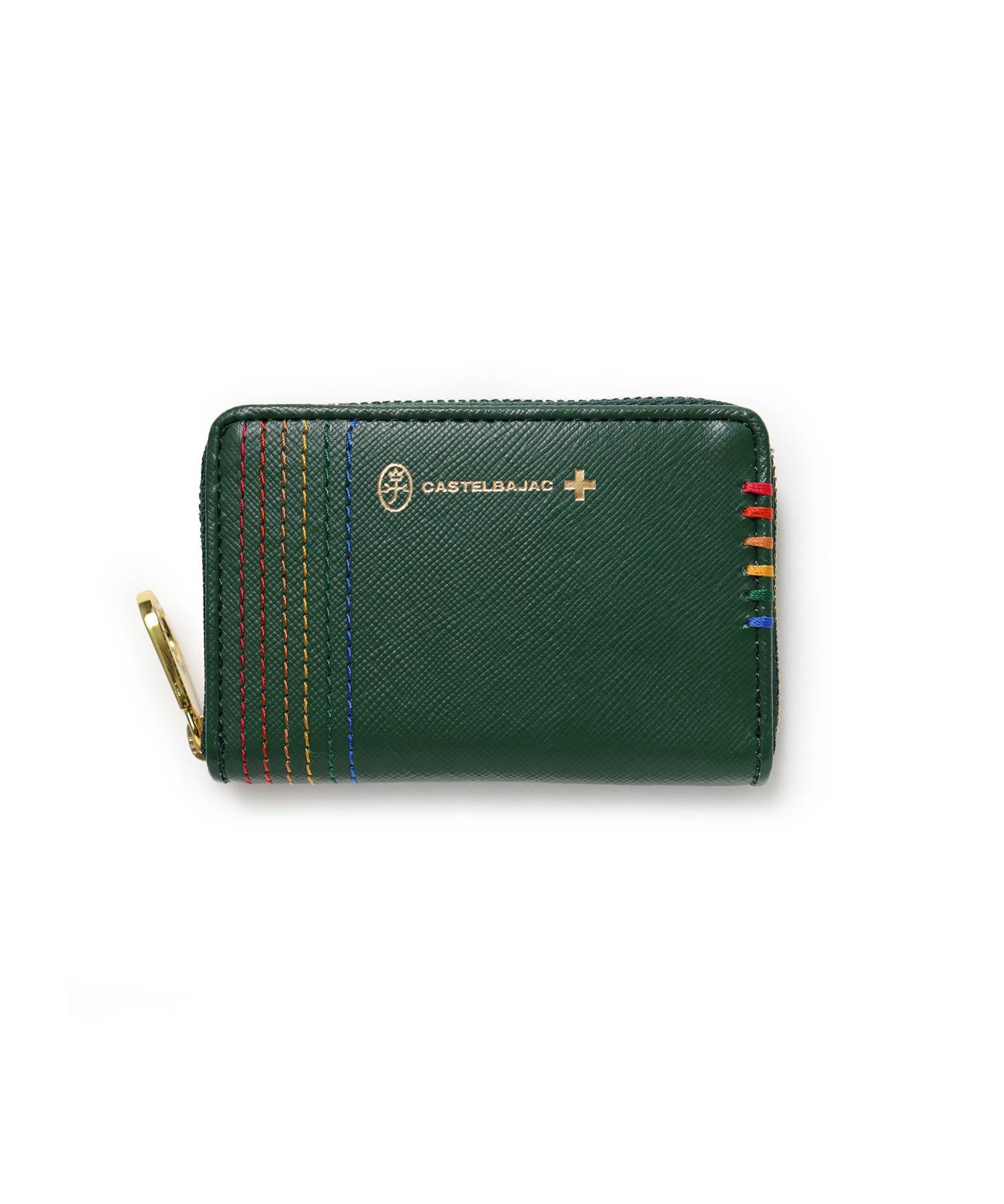 カステルバジャックで使用される6色のイメージカラーを飾りステッチと手かがりステッチで表現したシェストシリーズの小銭入れ。光沢のあるゴールド色ファスナー、金具そしてネーム表現と、小銭入れの裏地にもゴールド色のサテン生地を使用し、ユニセックスな感覚に仕上がっています。
