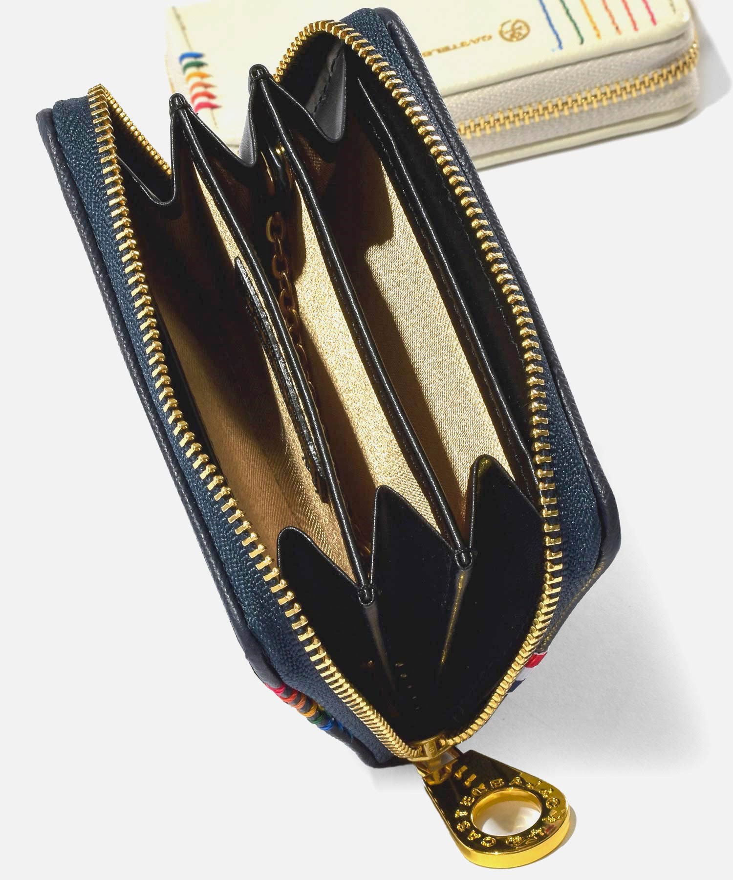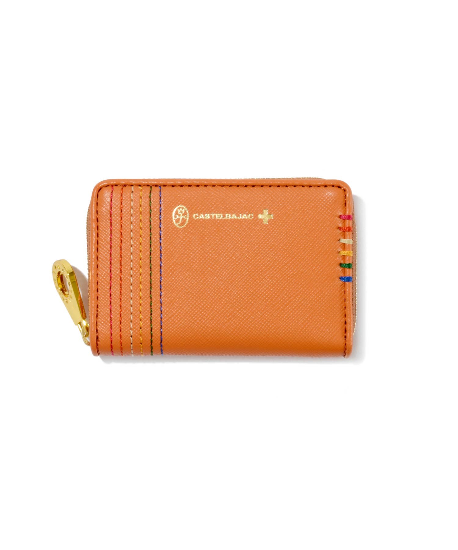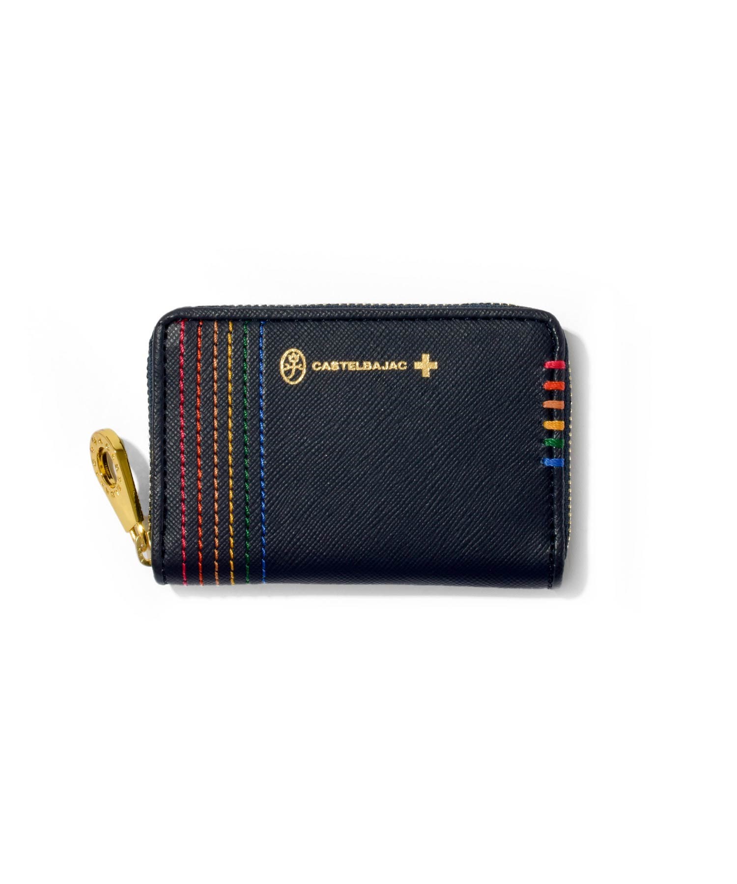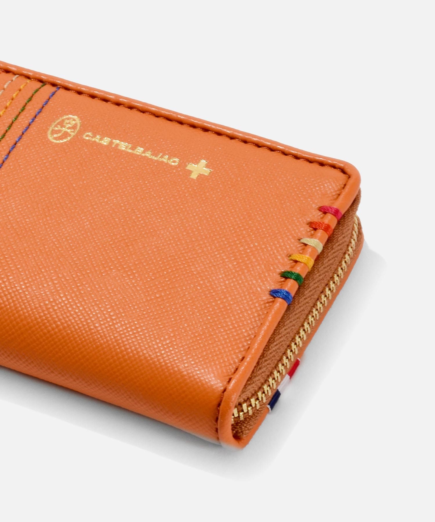 カステルバジャックで使用される6色のイメージカラーを飾りステッチと手かがりステッチで表現したシェストシリーズの小銭入れ。光沢のあるゴールド色ファスナー、金具そしてネーム表現と、小銭入れの裏地にもゴールド色のサテン生地を使用し、ユニセックスな感覚に仕上がっています。