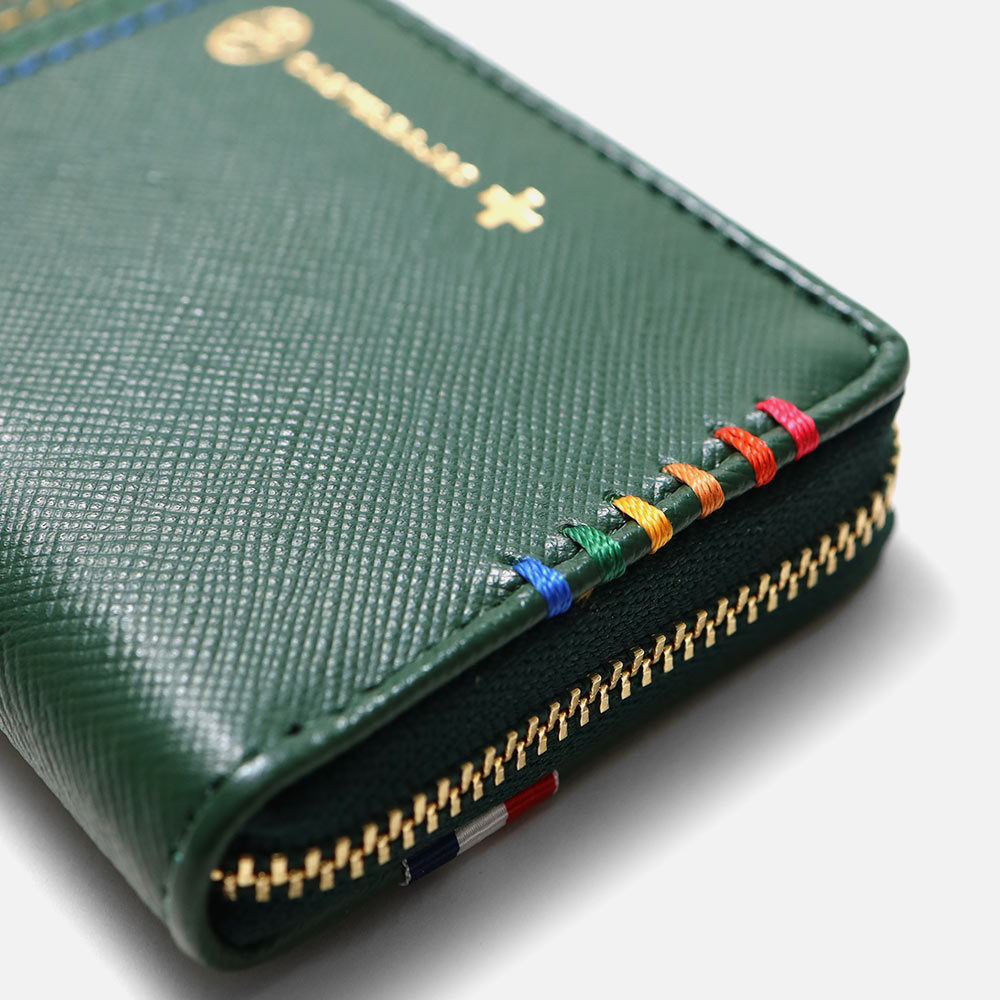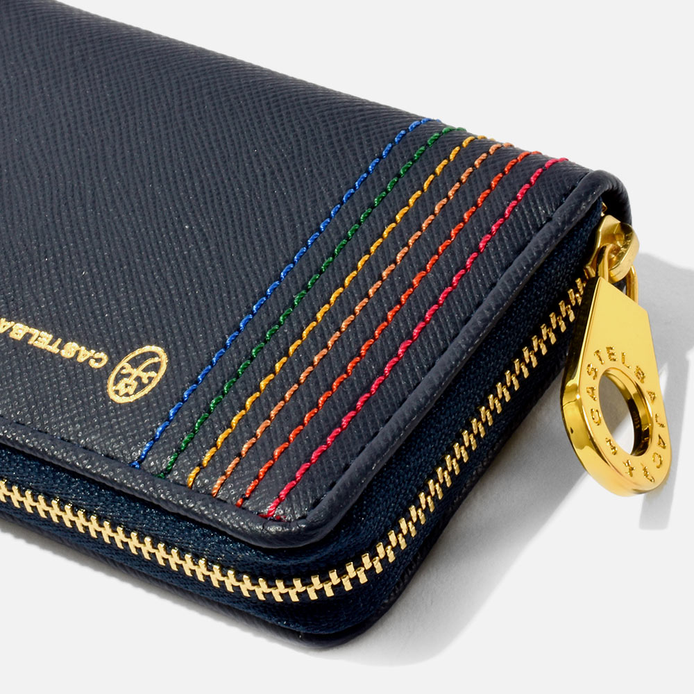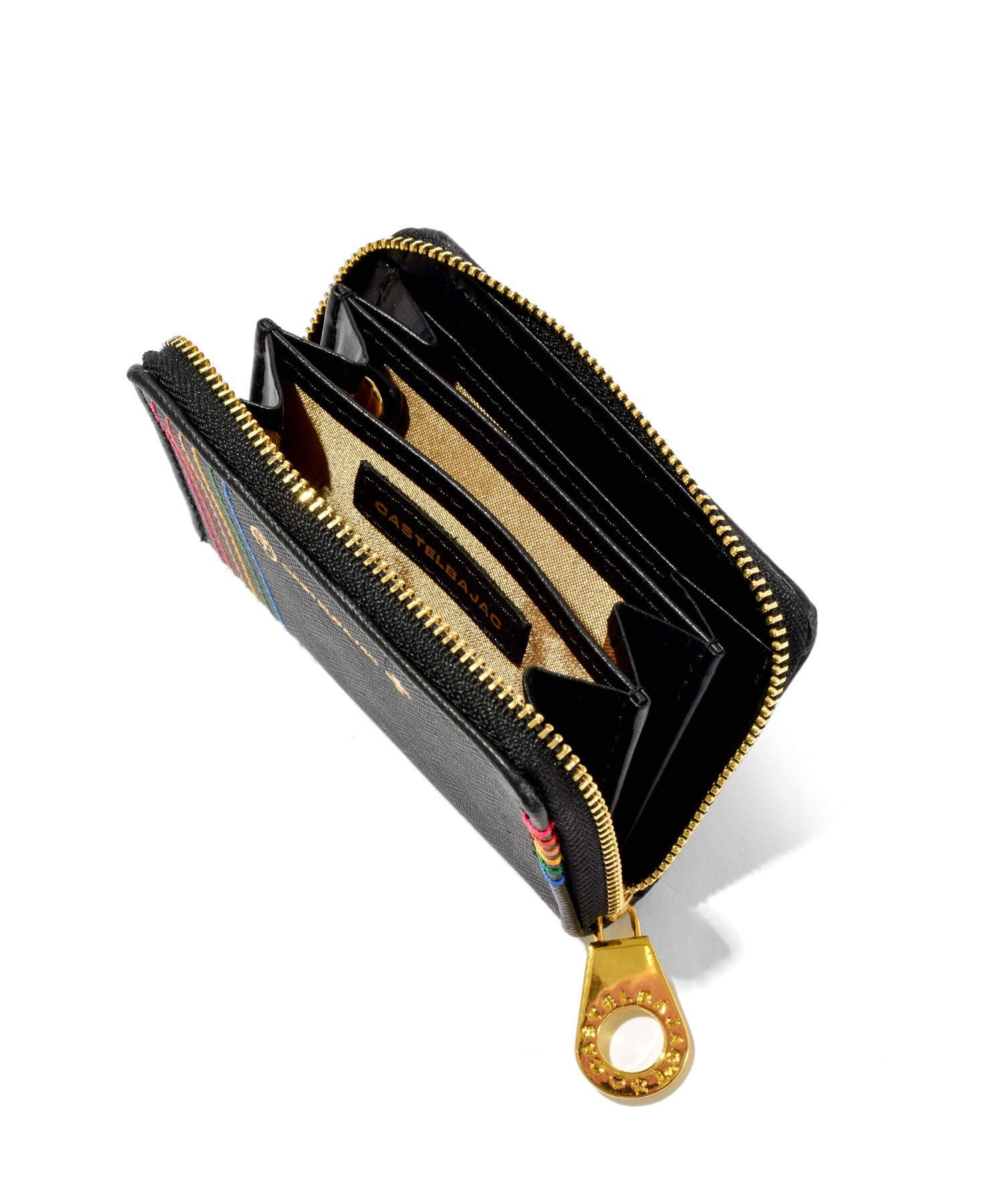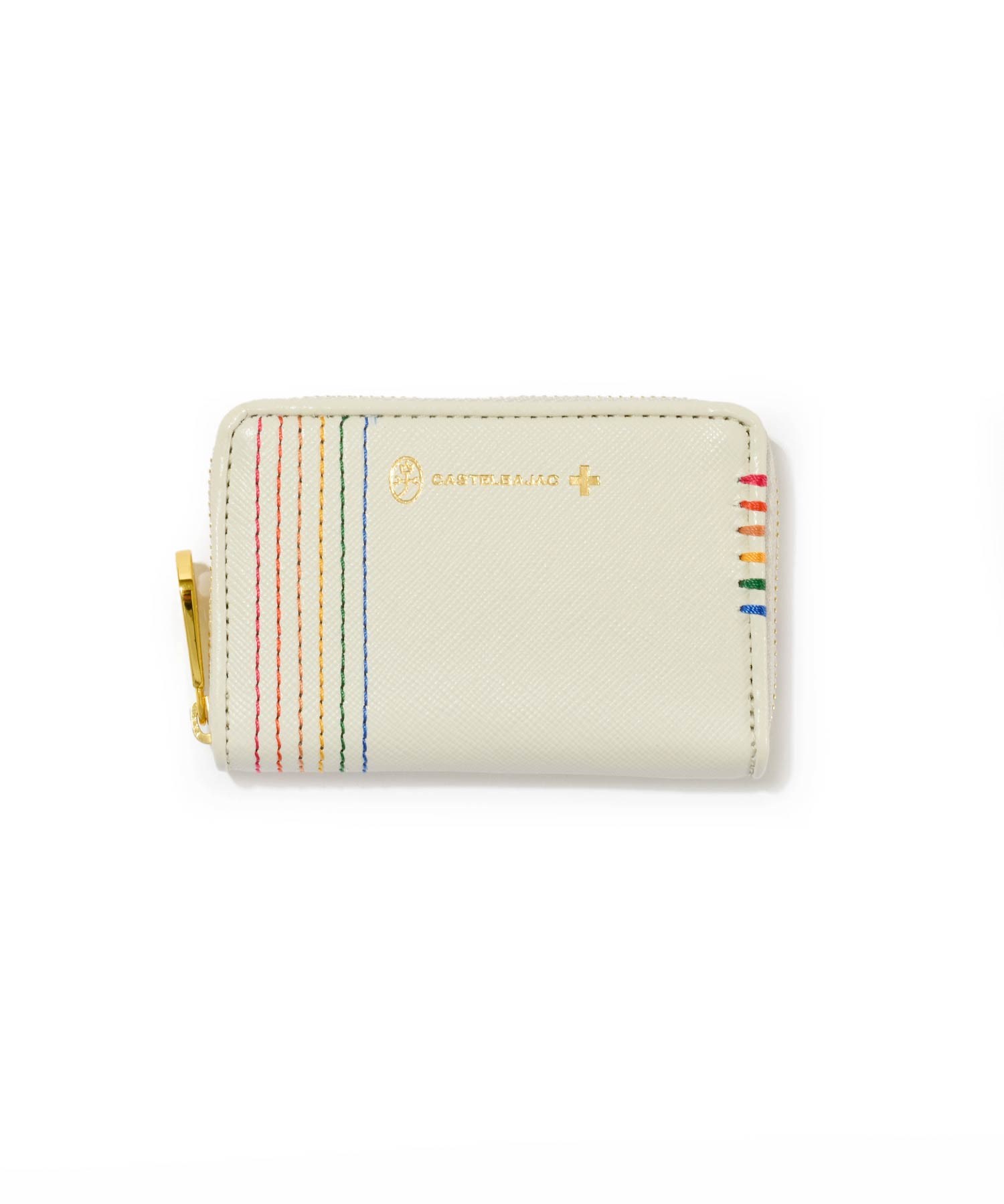 カステルバジャックで使用される6色のイメージカラーを飾りステッチと手かがりステッチで表現したシェストシリーズの小銭入れ。光沢のあるゴールド色ファスナー、金具そしてネーム表現と、小銭入れの裏地にもゴールド色のサテン生地を使用し、ユニセックスな感覚に仕上がっています。