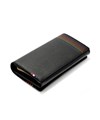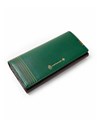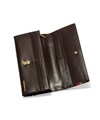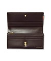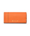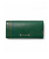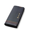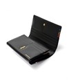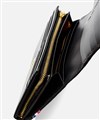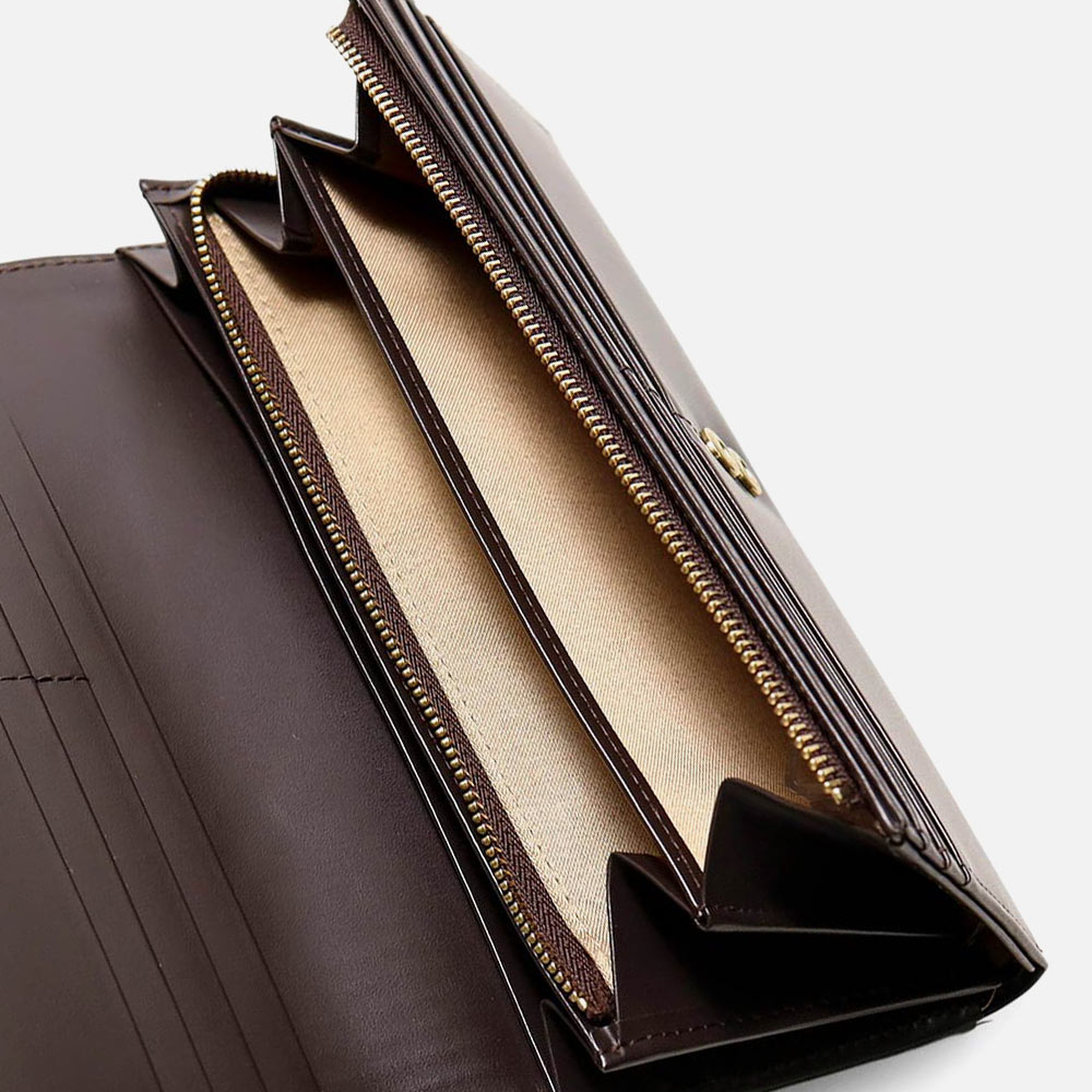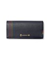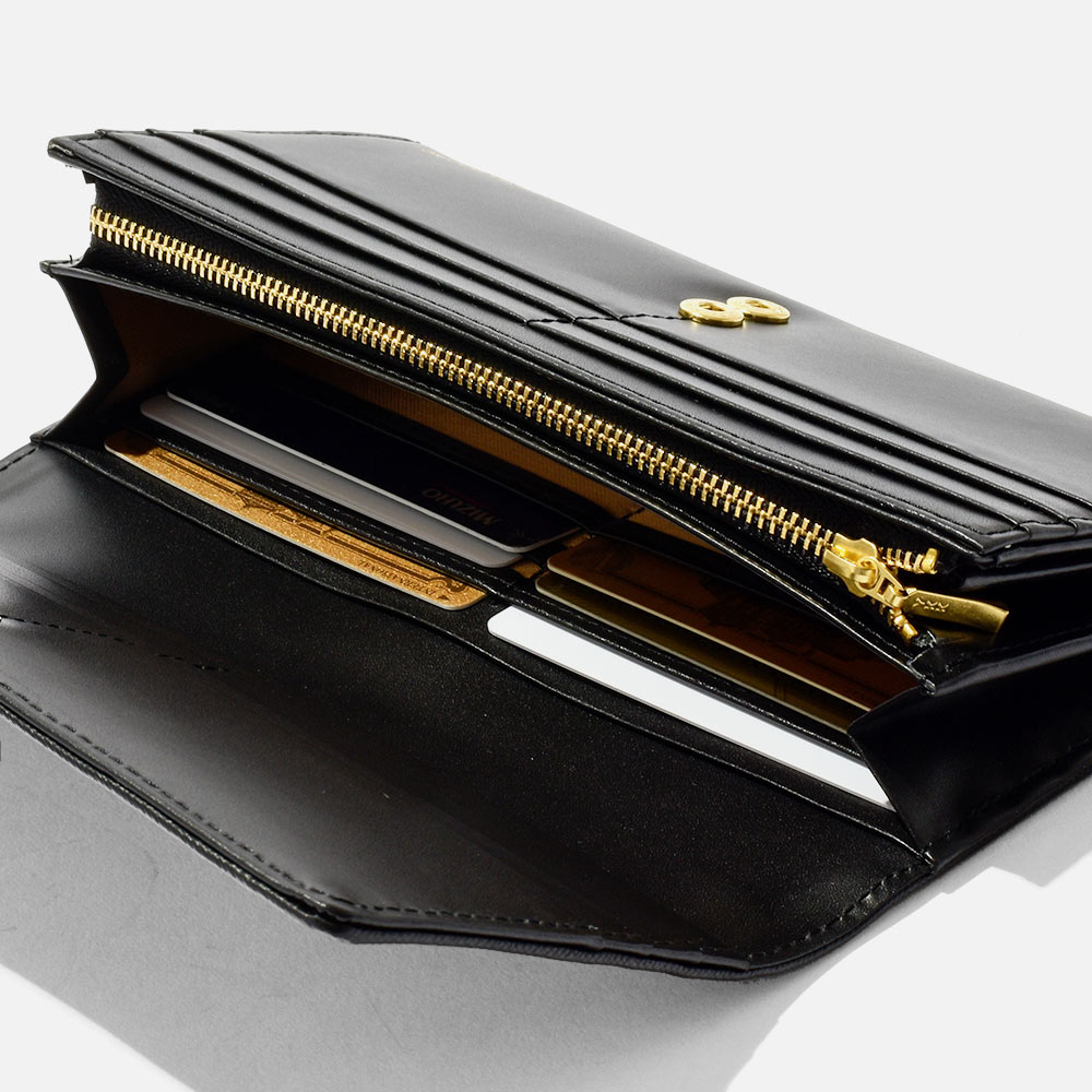 かぶせタイプの長財布はホックで開け閉めする仕様です。正面のカード段12の他に、札入れの内側にはカード段が6つあります。ファスナー小銭入れは仕切り付きで硬貨を分けて収納が可能。L字ファスナーとなっているため、硬貨の出し入れも容易です。小銭入れ内側のサテン生地にはすべてのカラーでゴールド色使用し、ユニセックスな感覚に仕上げています。