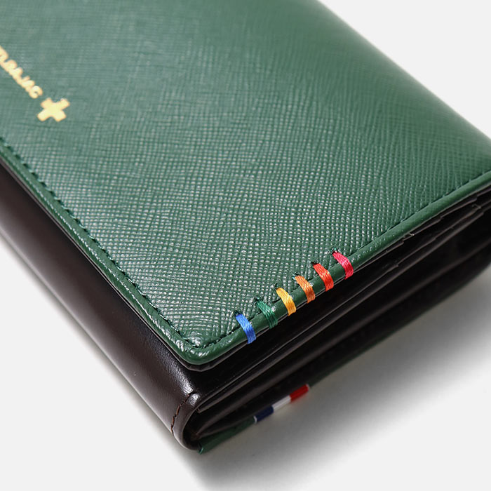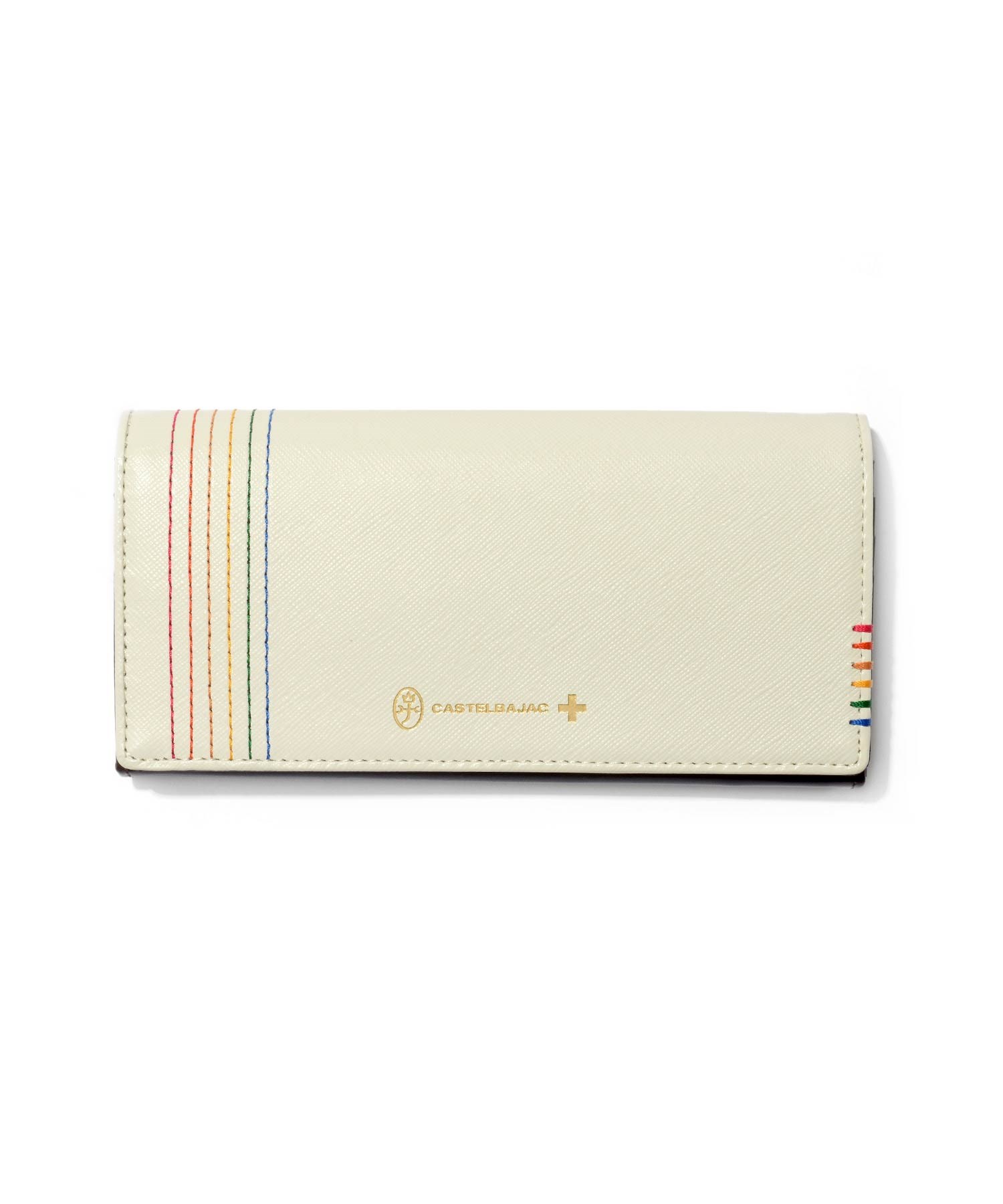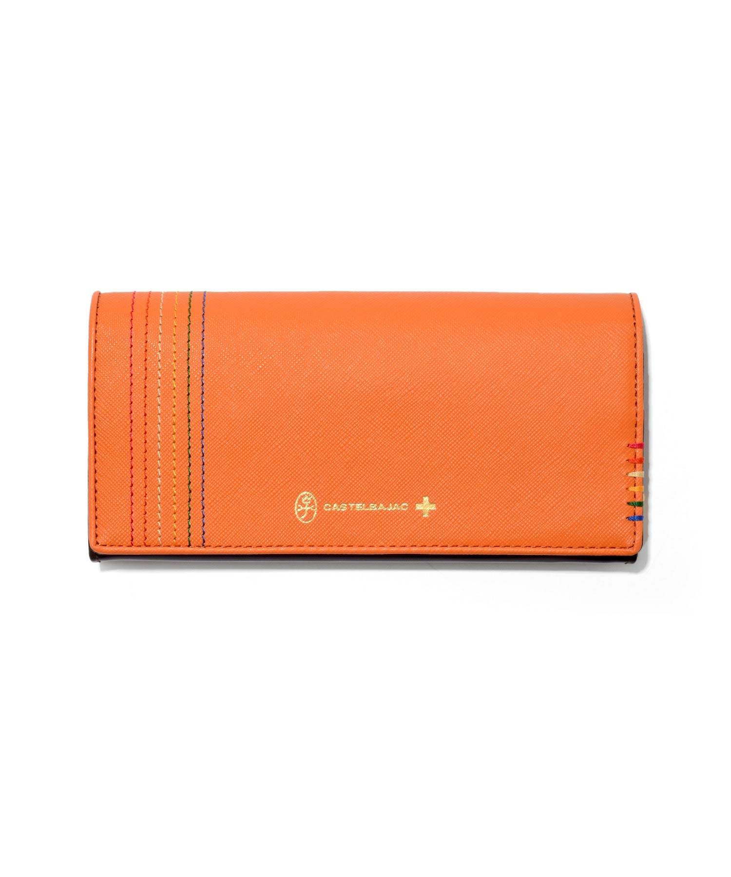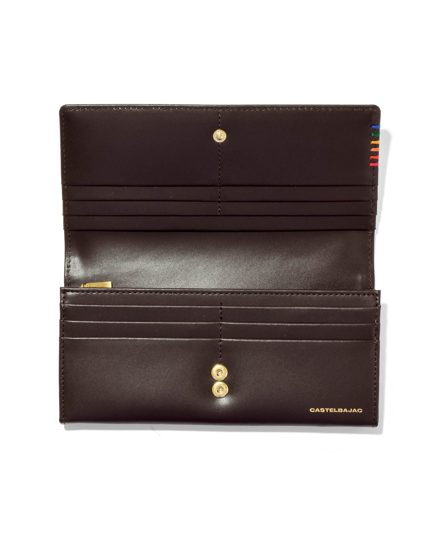 カステルバジャックで使用される6色のイメージカラーを飾りステッチと手かがりステッチで表現したシェストシリーズのかぶせ長財布。光沢のあるゴールド色ファスナー、金具そしてネーム表現と、小銭入れの裏地にもゴールド色のサテン生地を使用し、ユニセックスな感覚に仕上がっています。