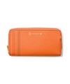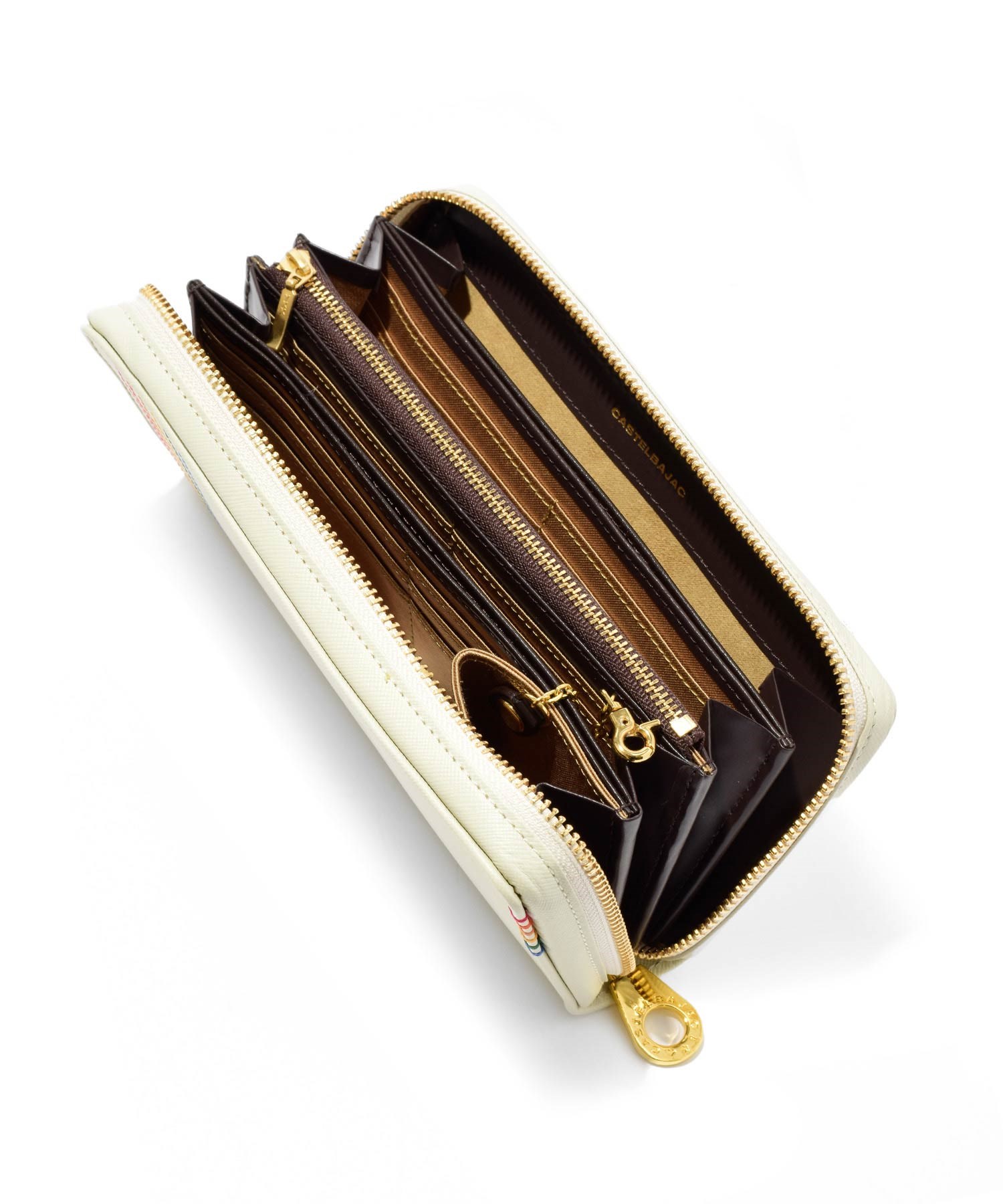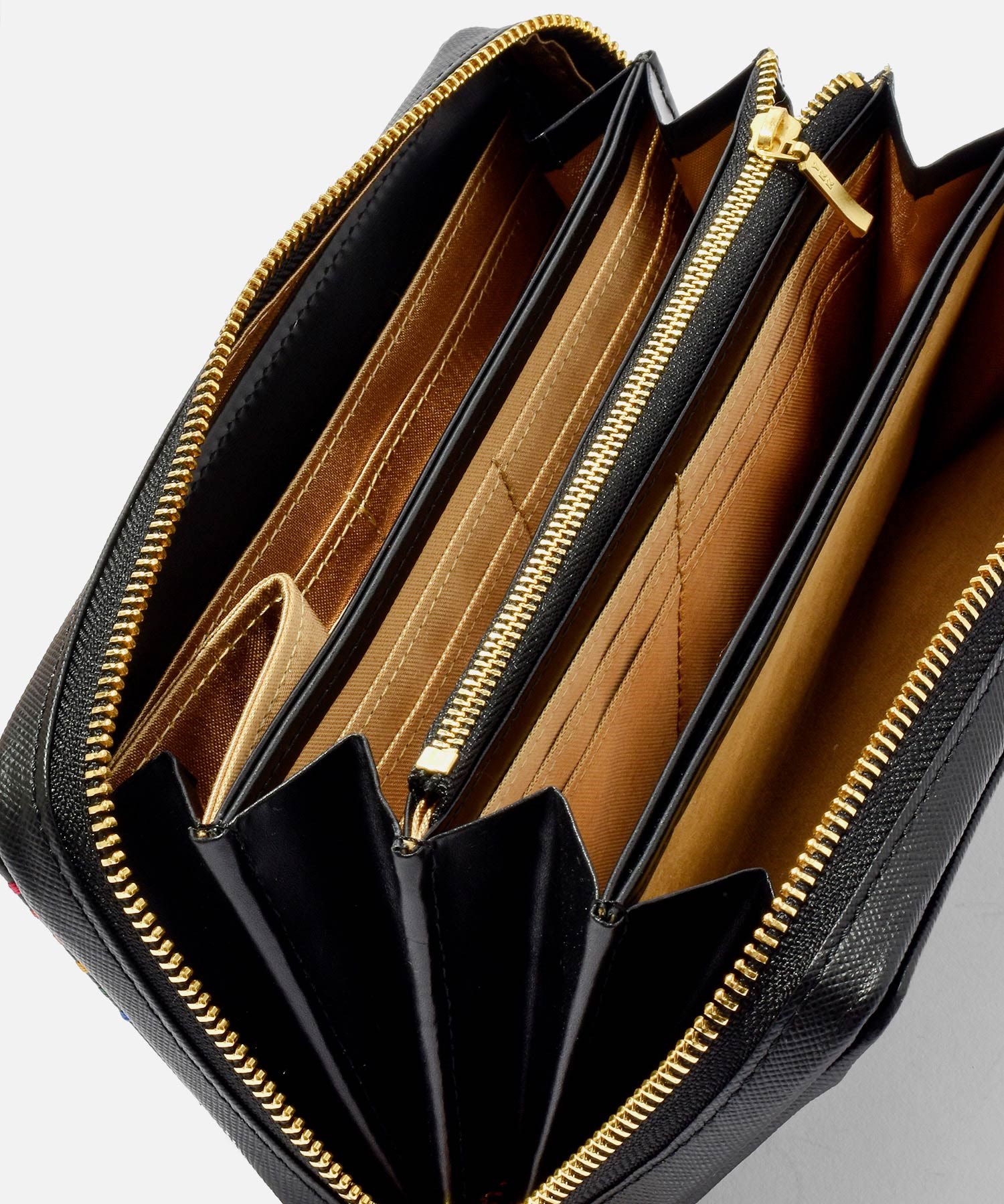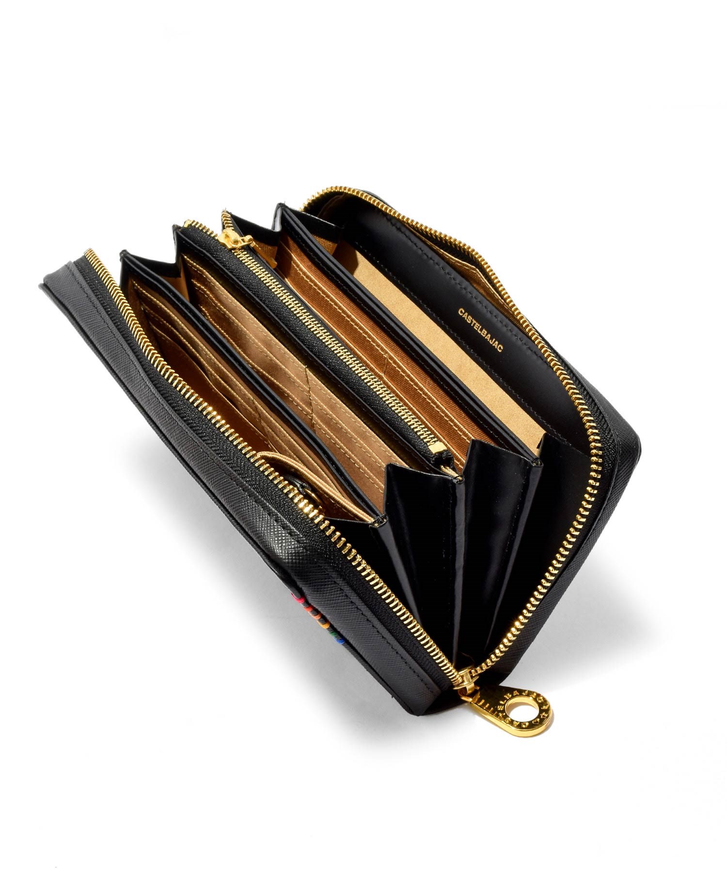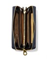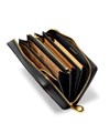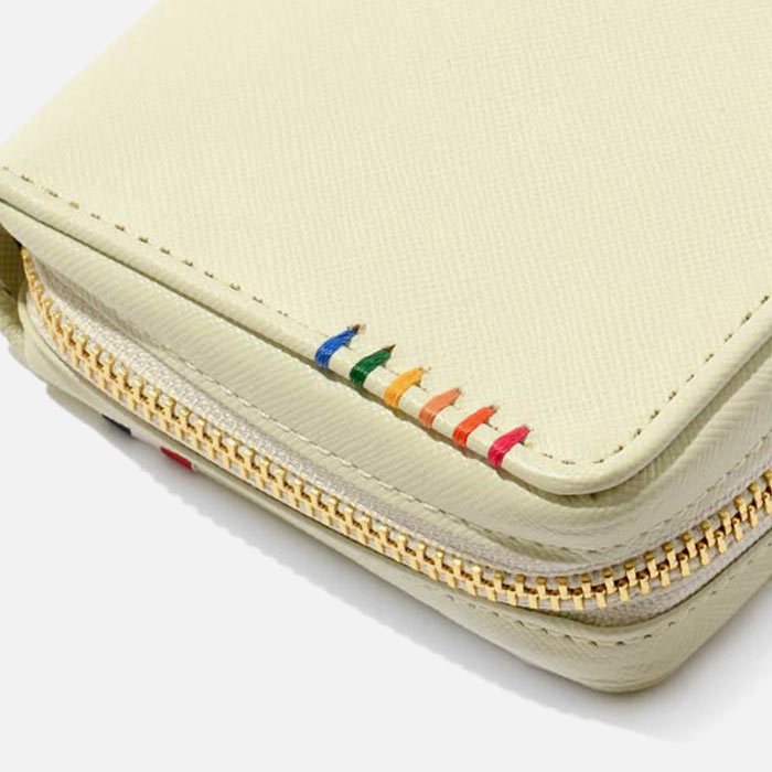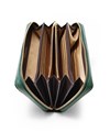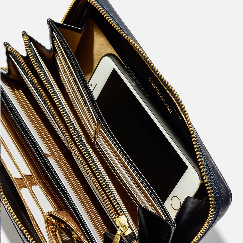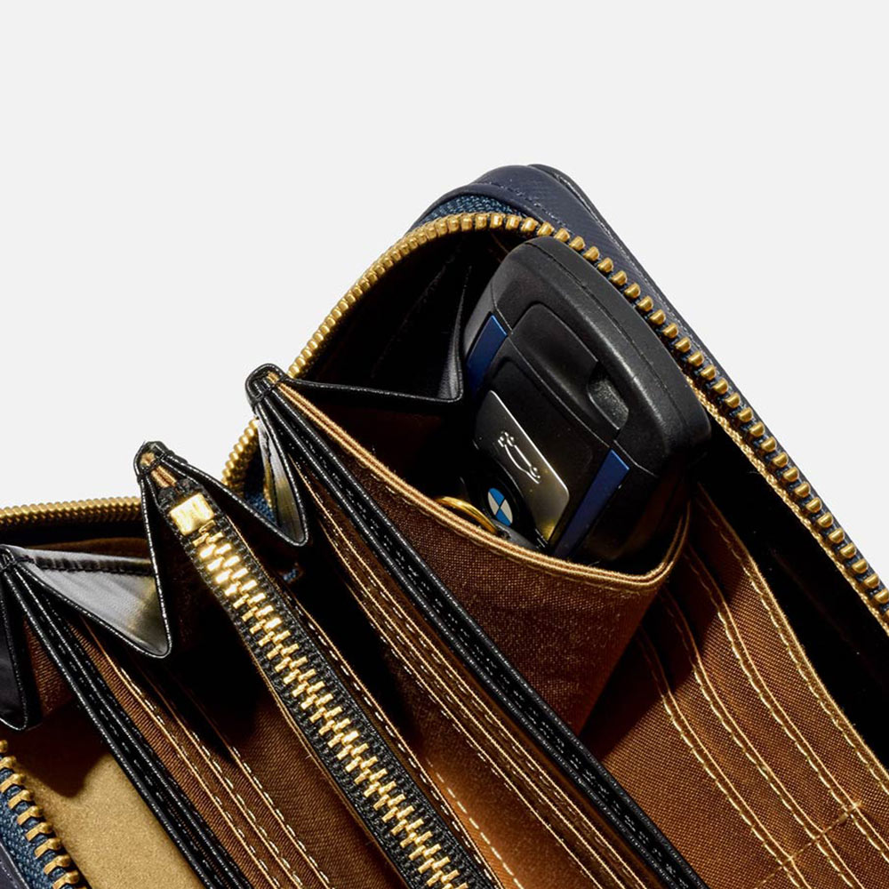 パスポート収納も可能なサイズで、磁気防止シールド付きのスマホポケットも設けられています。カード段は全36と収納機能も抜群。片側のお札室の端には取り外し可能なキーチェーン付きキーポケットも設けられています。日本円と外貨、航空チケット等を分けて入れられる3札室仕様です。