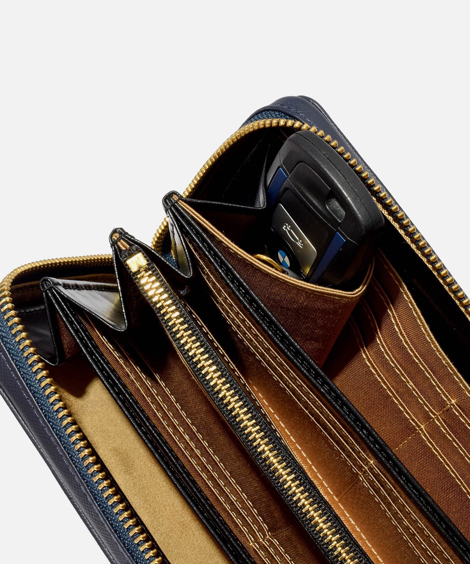 ※キーポケットは車のスマートキーも収納可能なサイズですが、スマートキー収納・スマホ収納と多数のカード段を併用すると収納時に財布が歪む恐れがございますのでご注意ください。