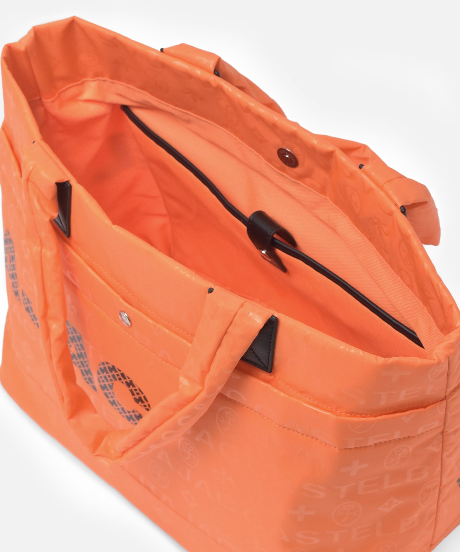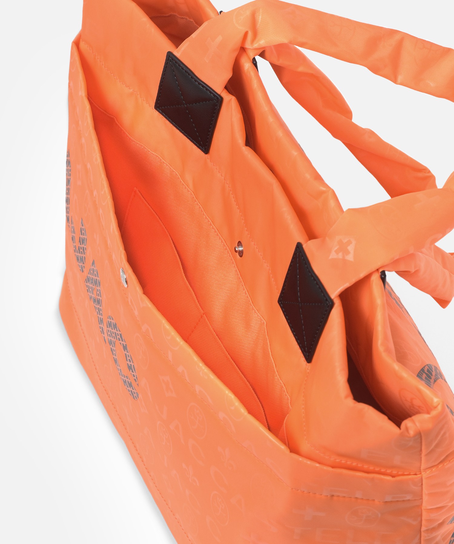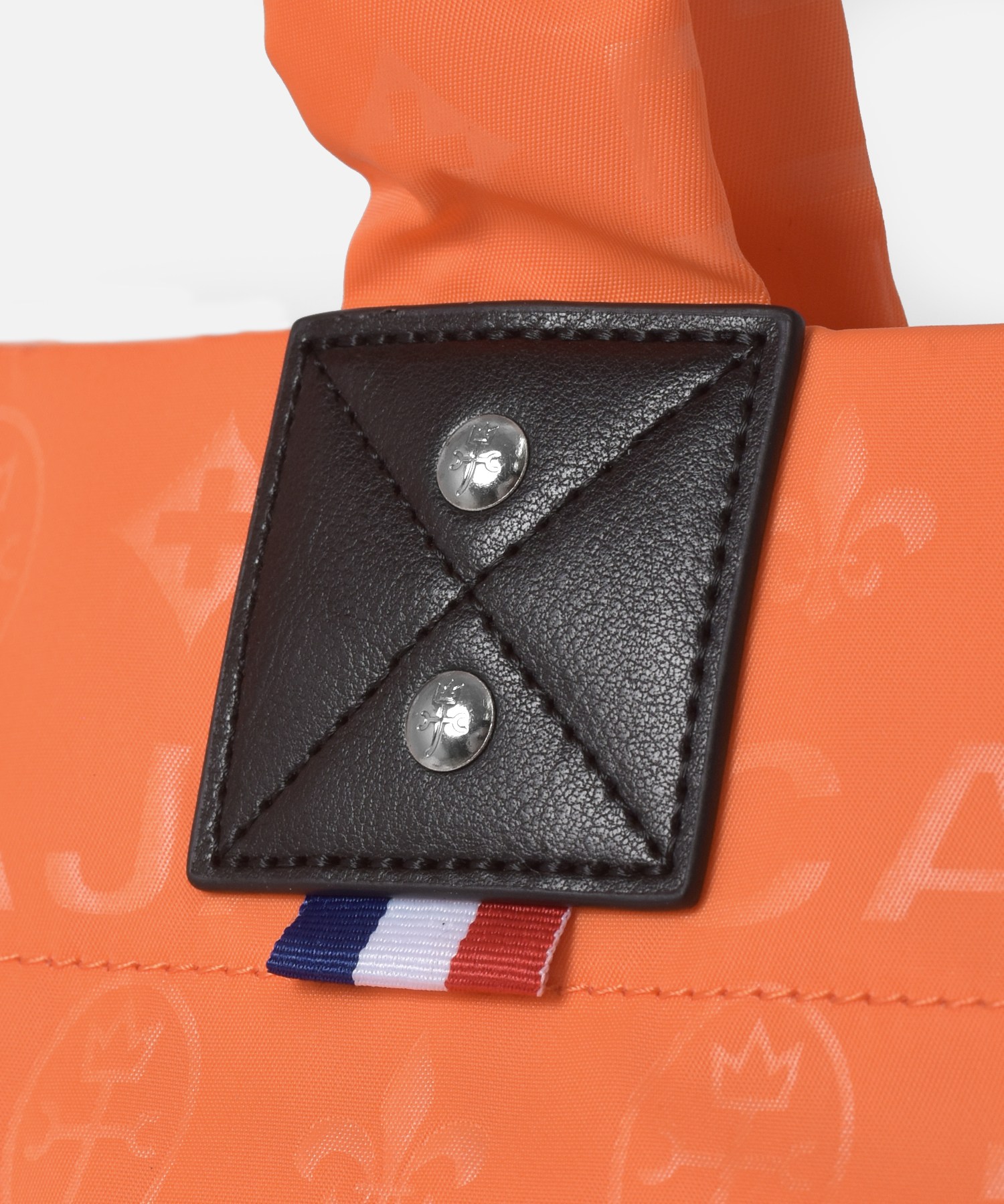 本体素材は軽くて使いやすいソフトなナイロン生地を使用しています。この生地は二重プリントの透かしを入れた本体全体を覆う大きなロゴが特徴です。ロゴの背面には上品に光るモノグラムのプリントが施されており、見る角度によって表情を変えることができます。