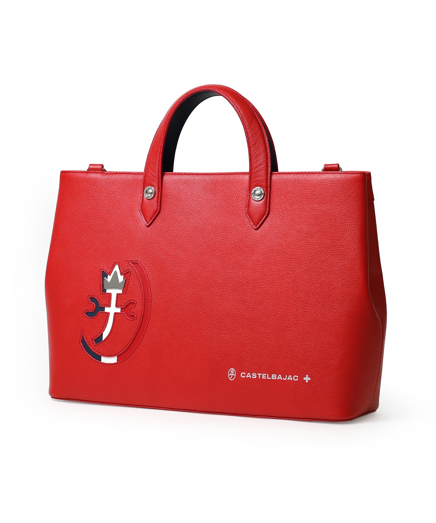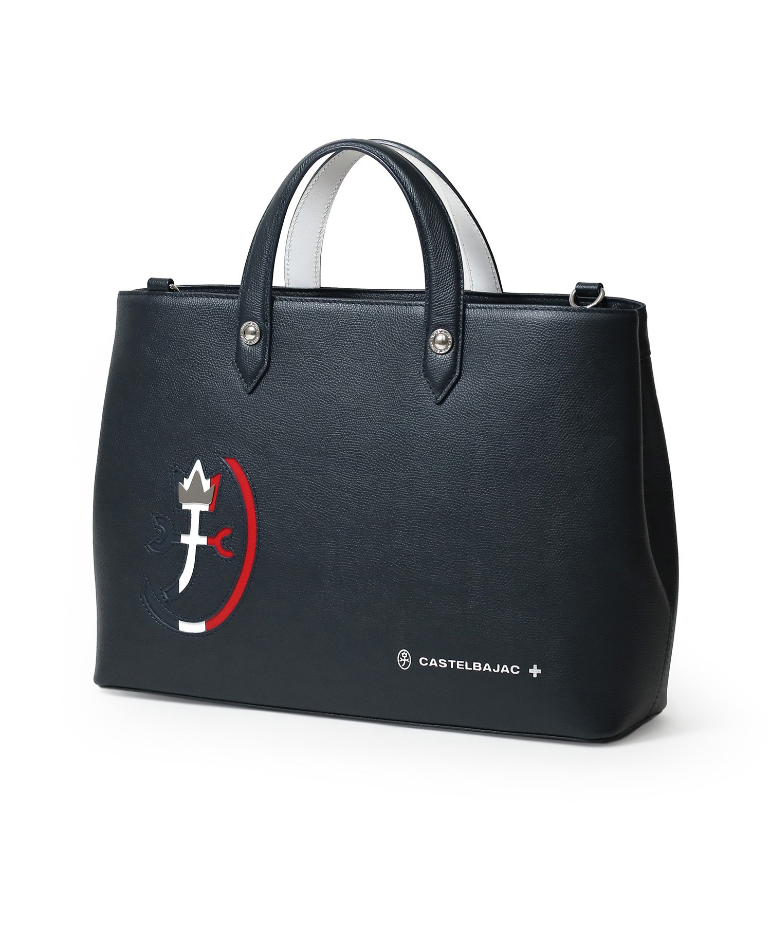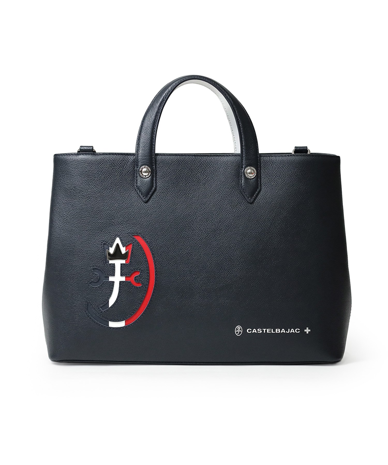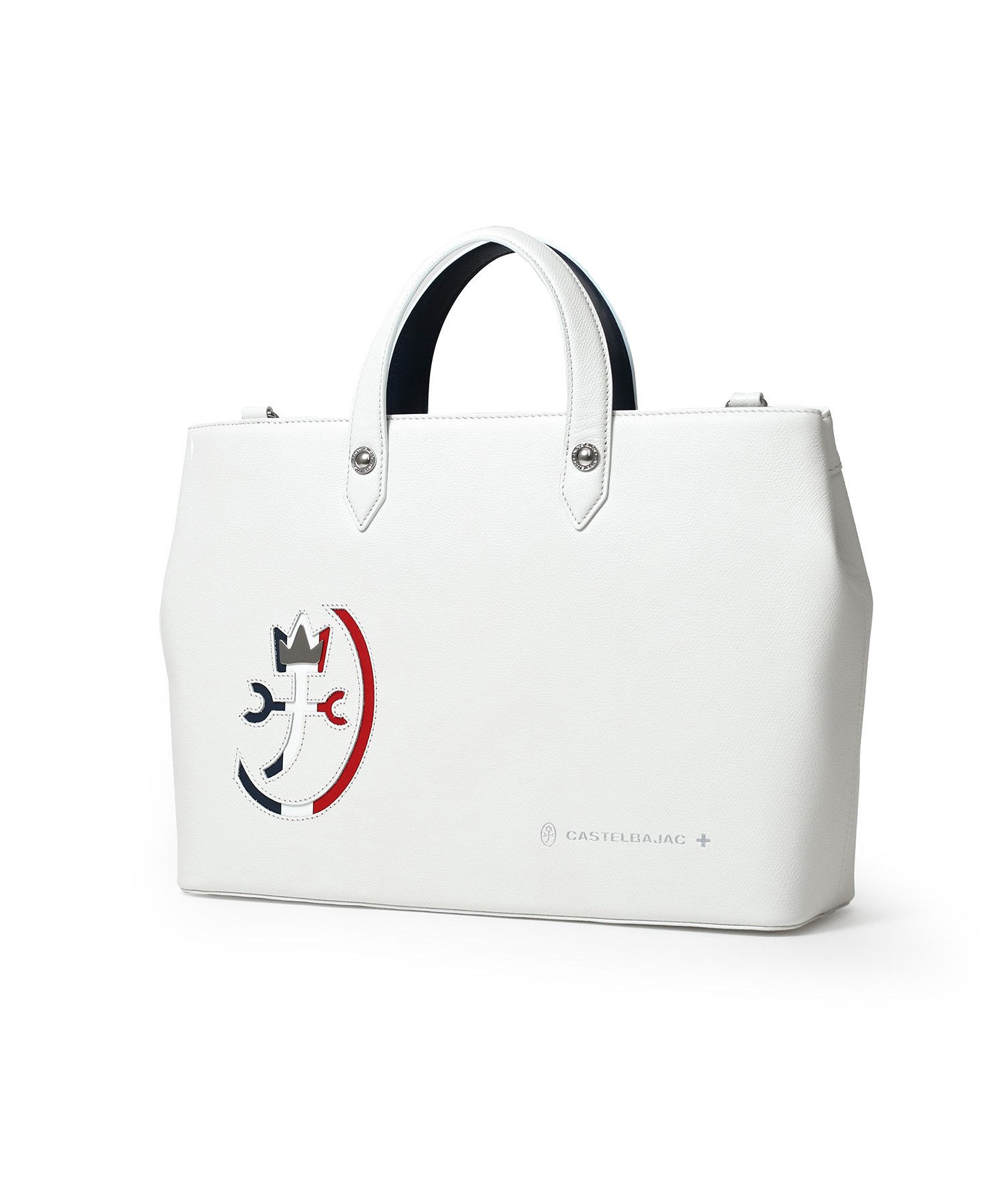 カステルバジャックらしいデザインのレザートートバッグ。トリコロールカラーの家紋に王冠のメタルパーツがポイントです。エンボス加工を施したオリジナル牛革に、シルバー箔押しのブランドロゴを入れることで高級感を演出しています。