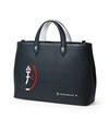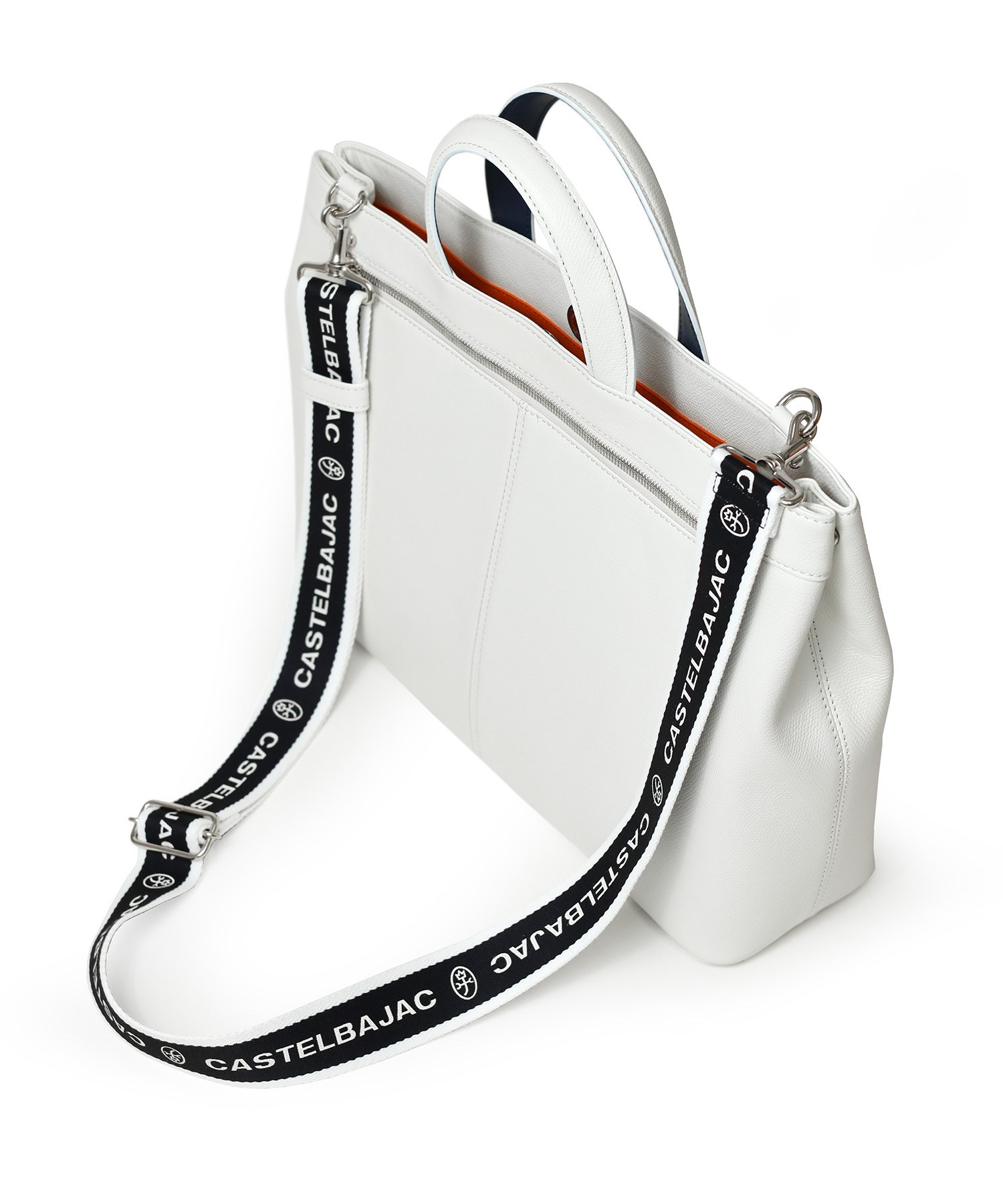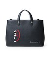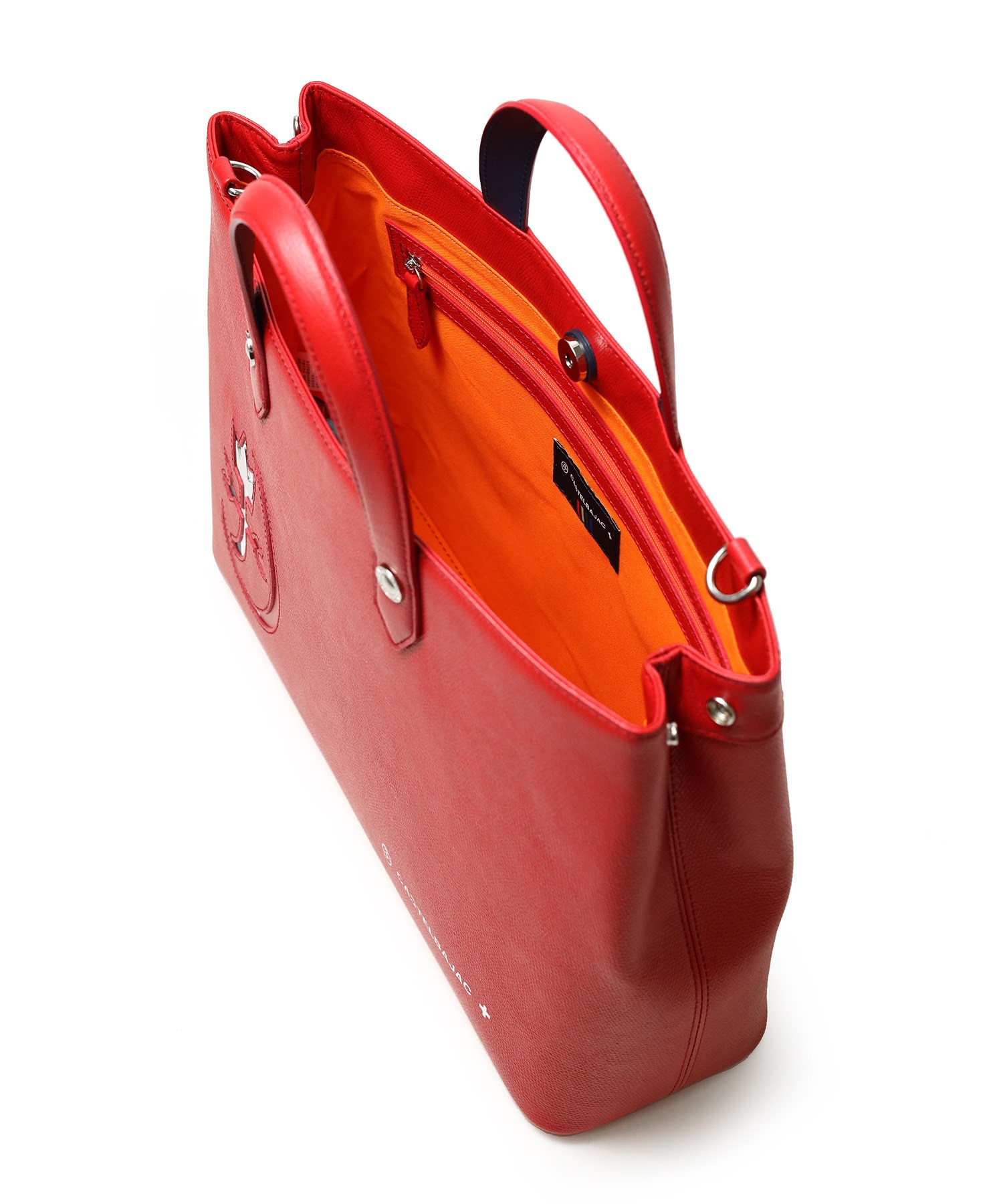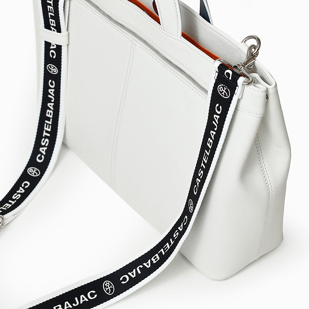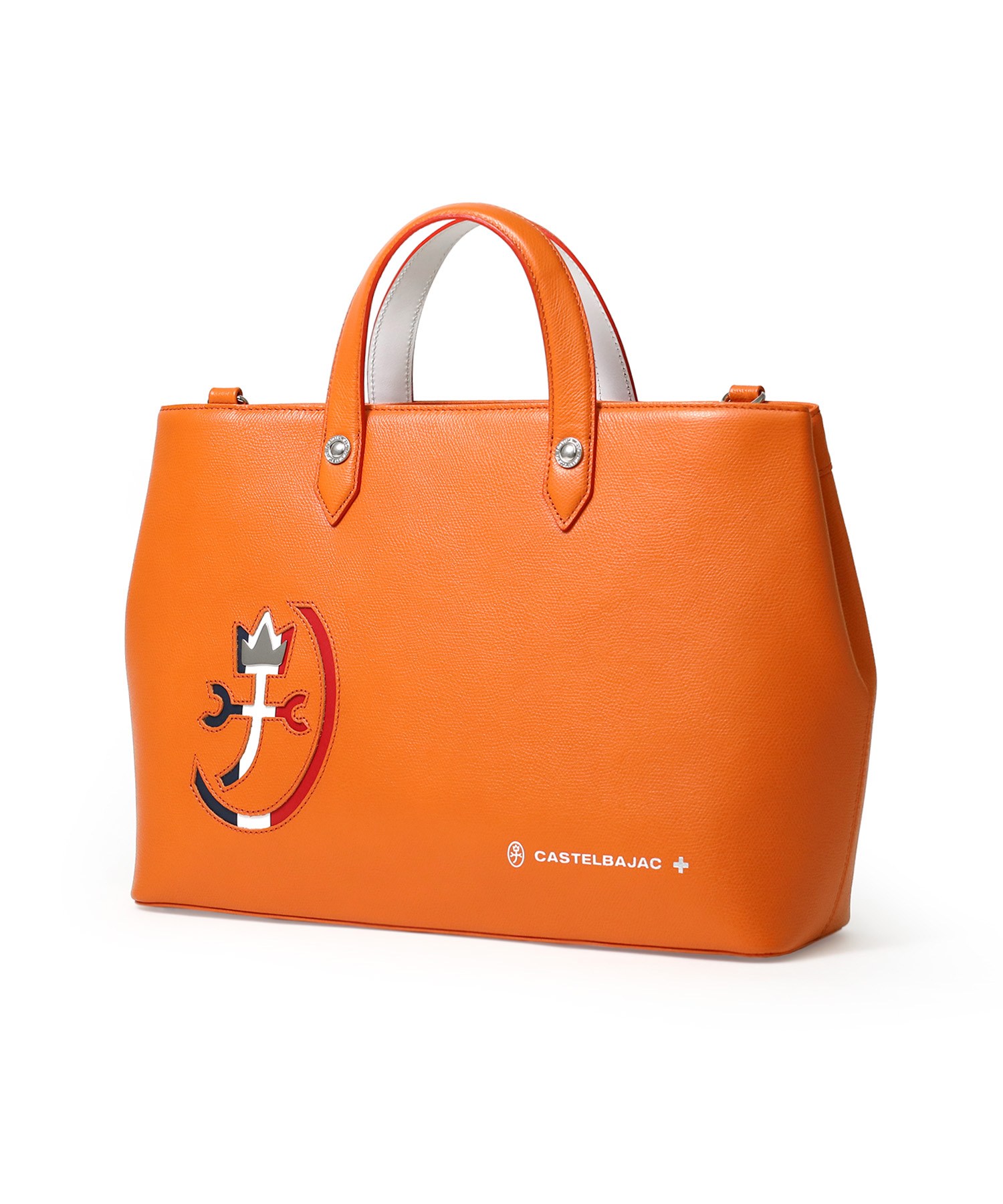 カステルバジャックらしいデザインのレザートートバッグ。トリコロールカラーの家紋に王冠のメタルパーツがポイントです。エンボス加工を施したオリジナル牛革に、シルバー箔押しのブランドロゴを入れることで高級感を演出しています。