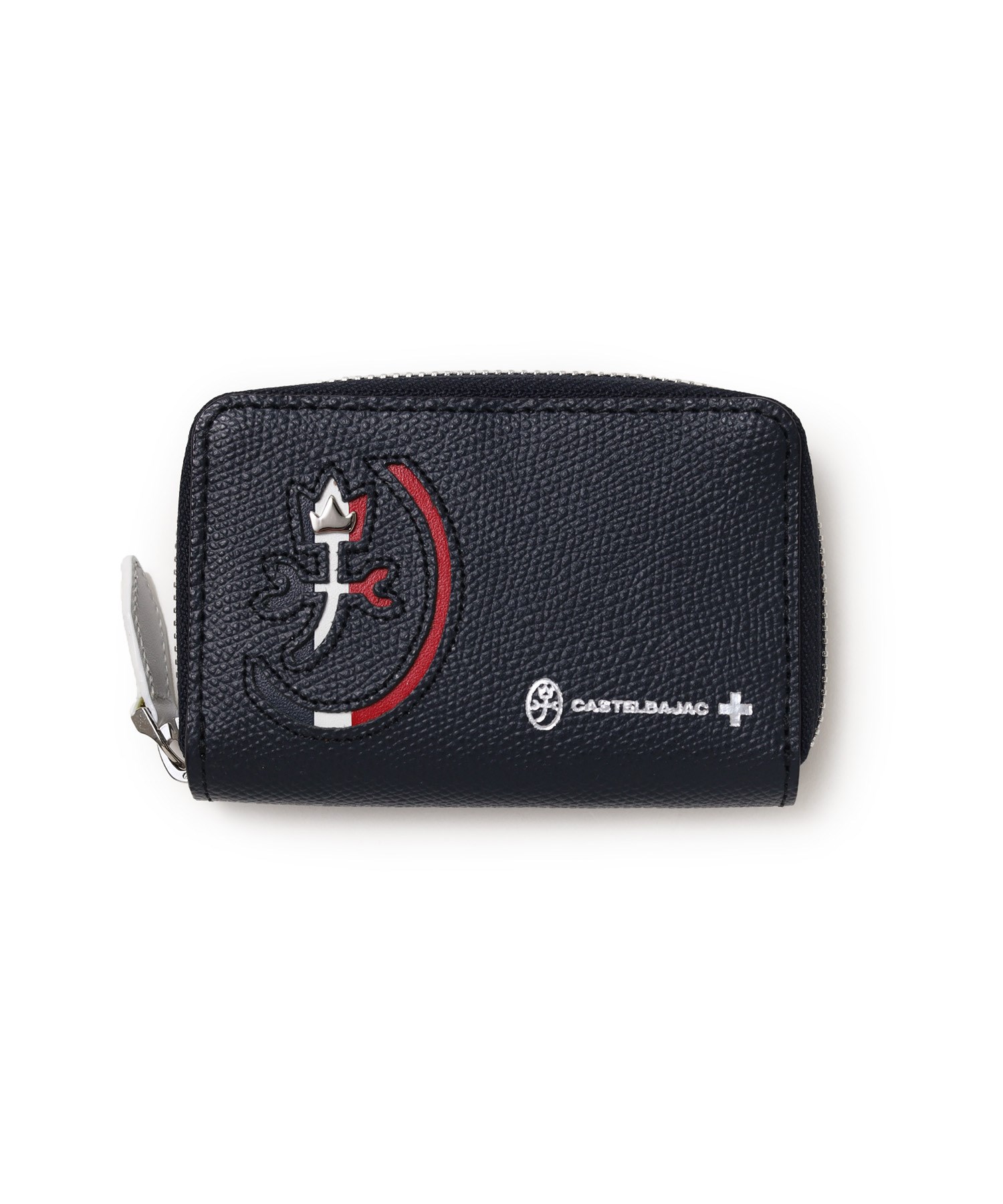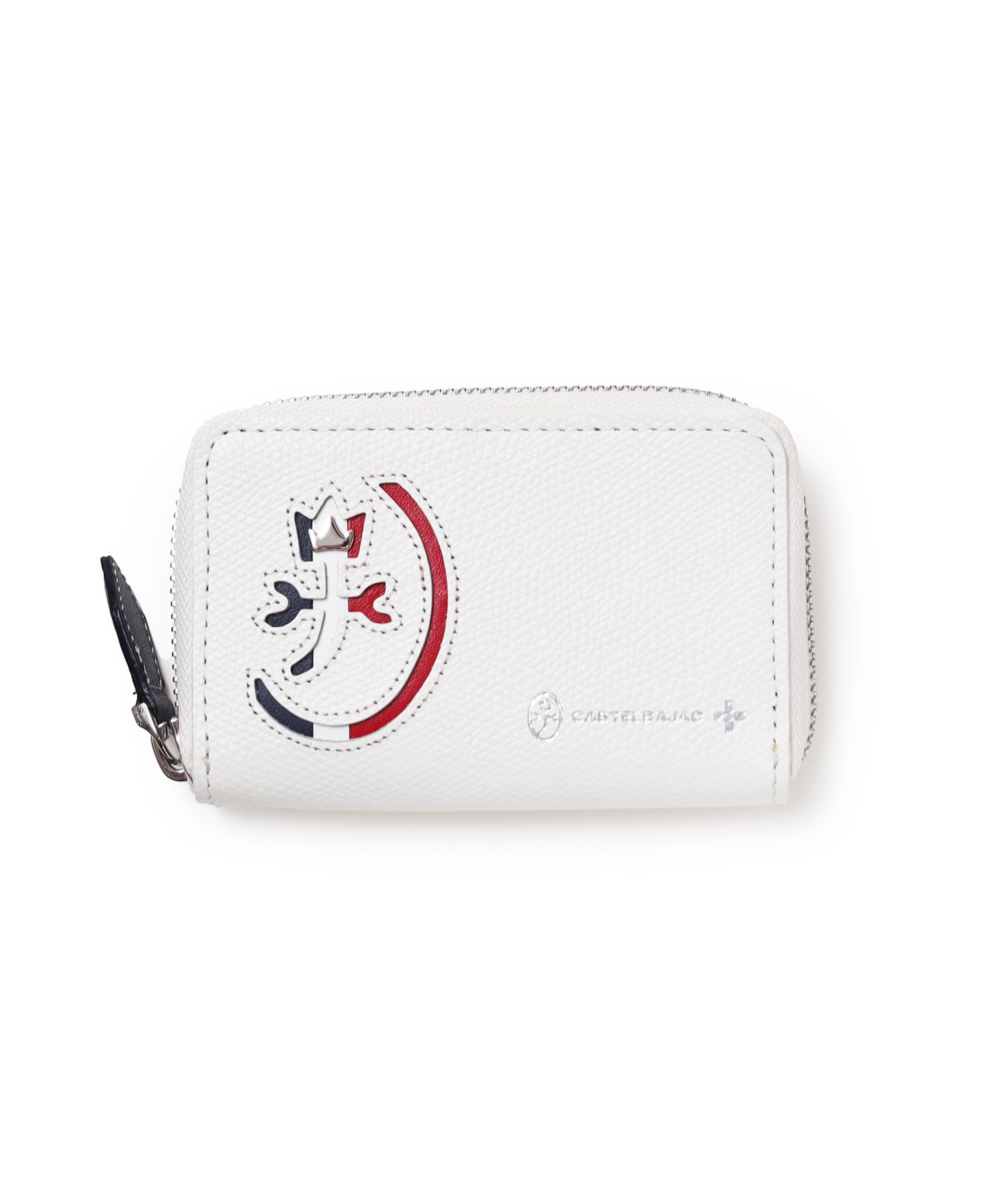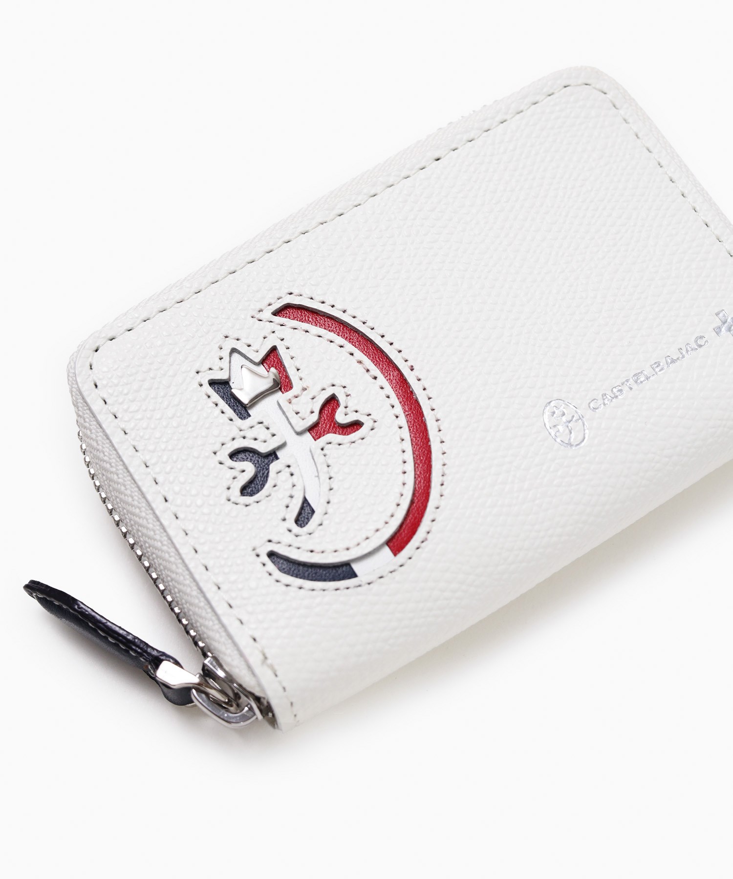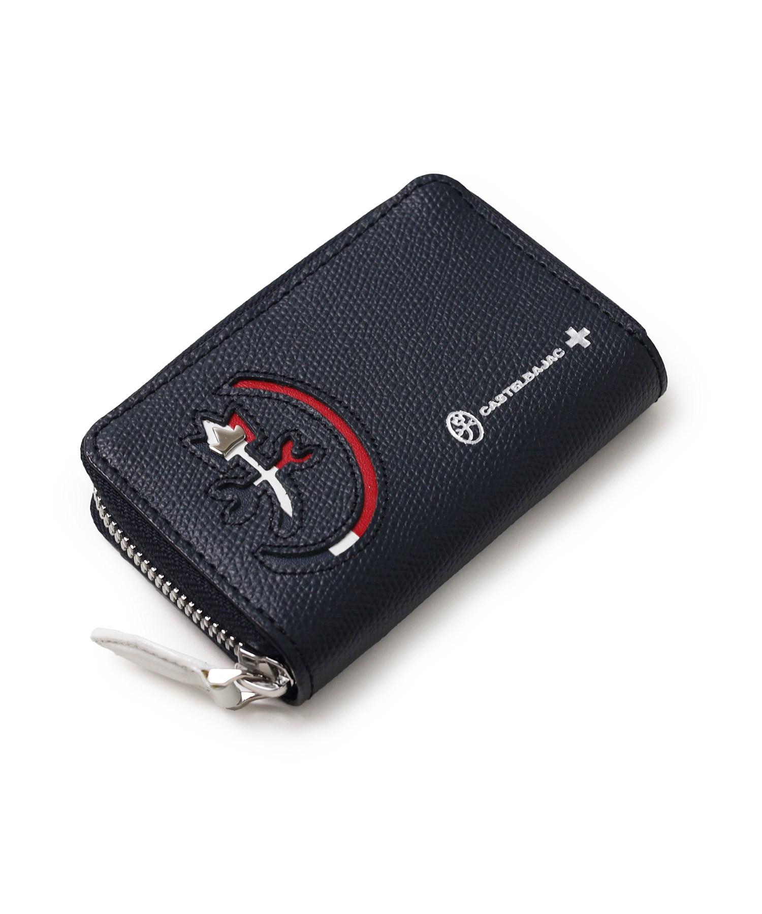 カステルバジャックらしいデザインのスマートキー対応キーケース。ブランドアイコンである家紋をトリコロールカラーで表現し、王冠部分にはメタルパーツで立体感を出しています。エンボス加工を施したオリジナル牛革に、シルバー箔押しのブランドロゴを入れることで高級感を演出しています。