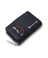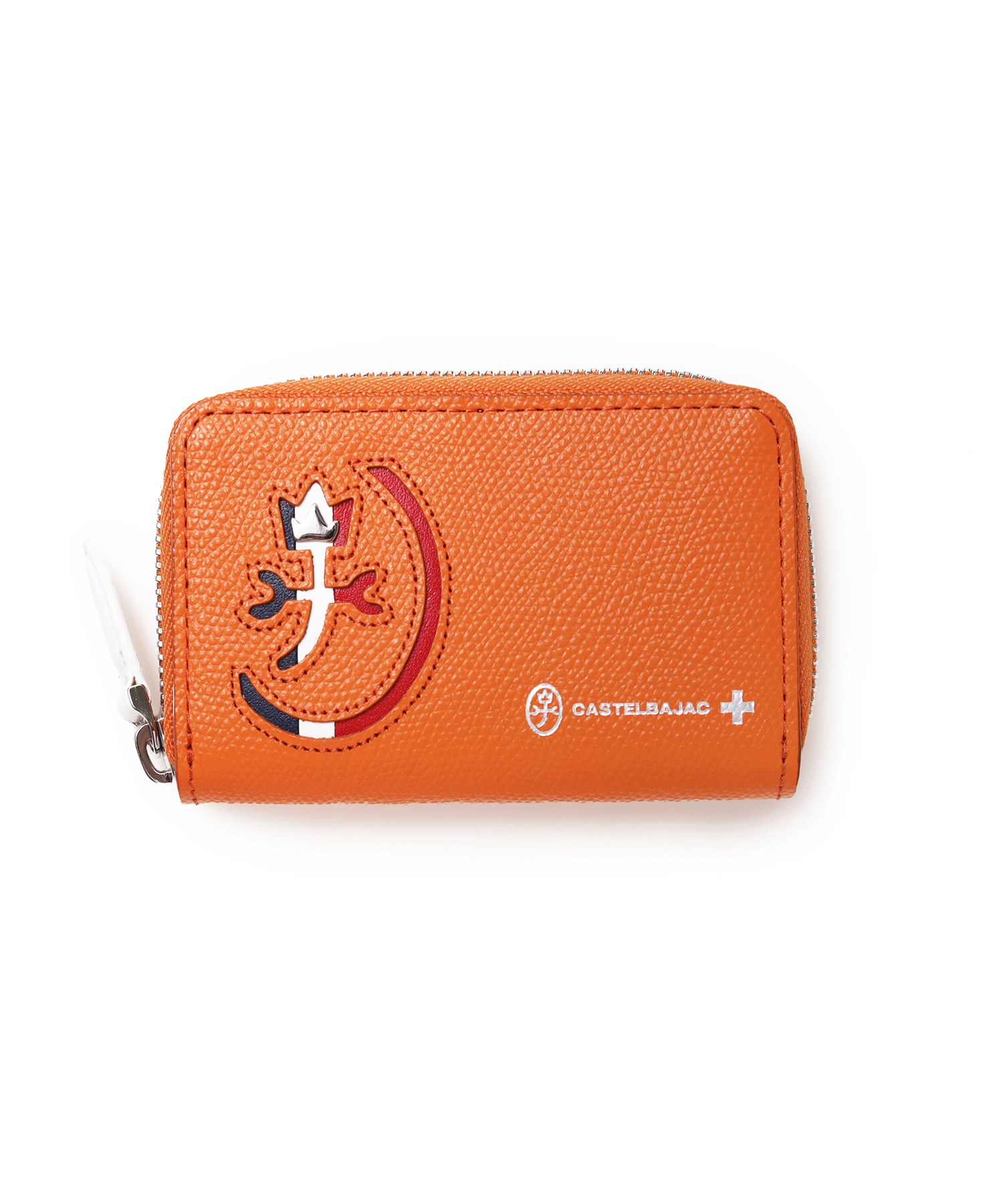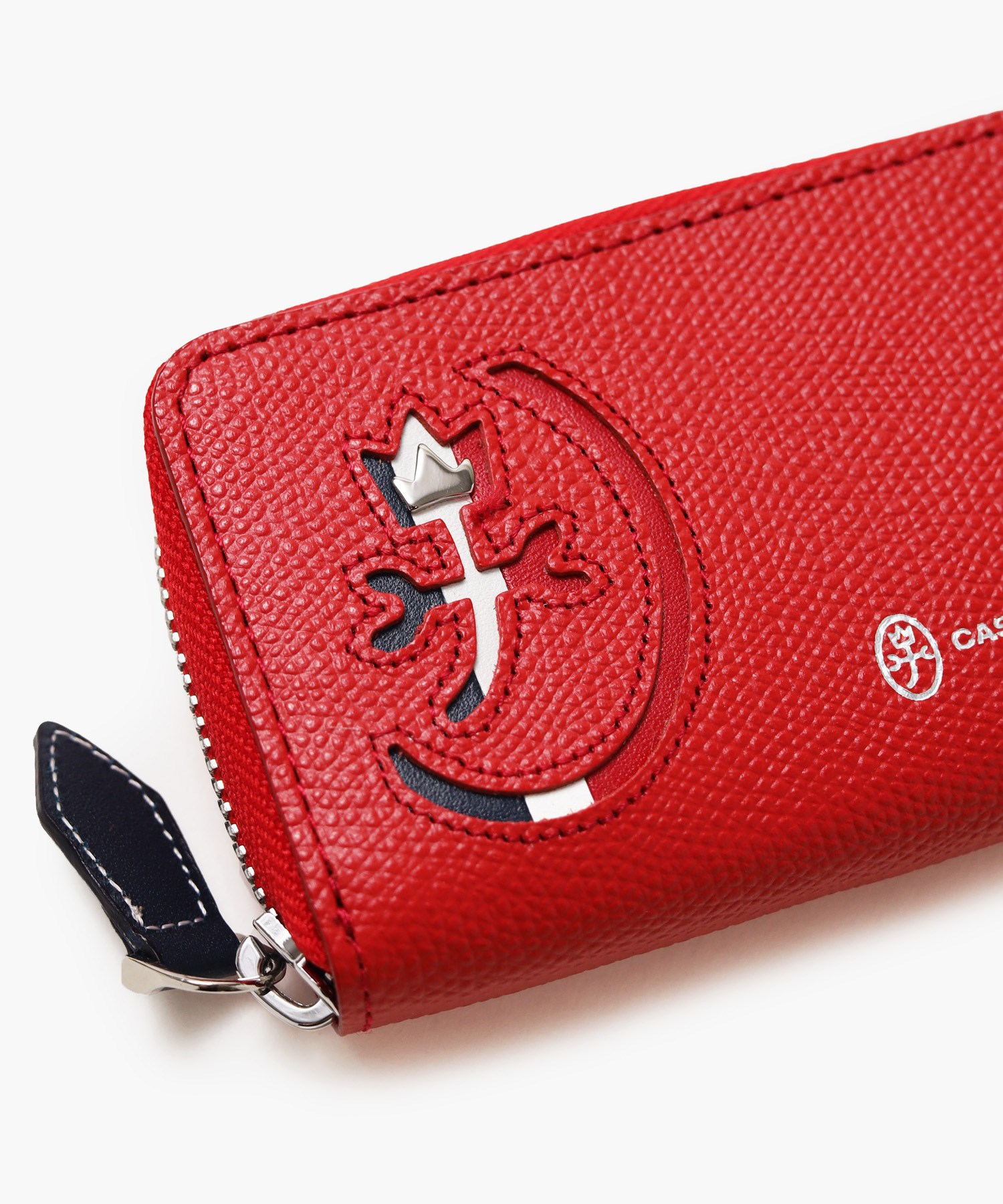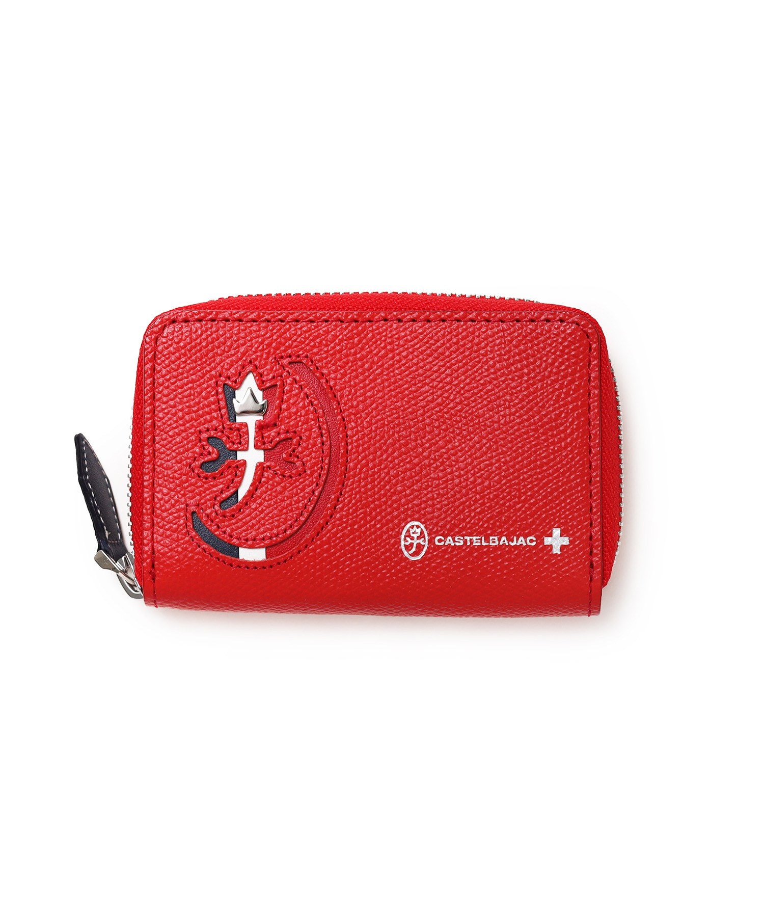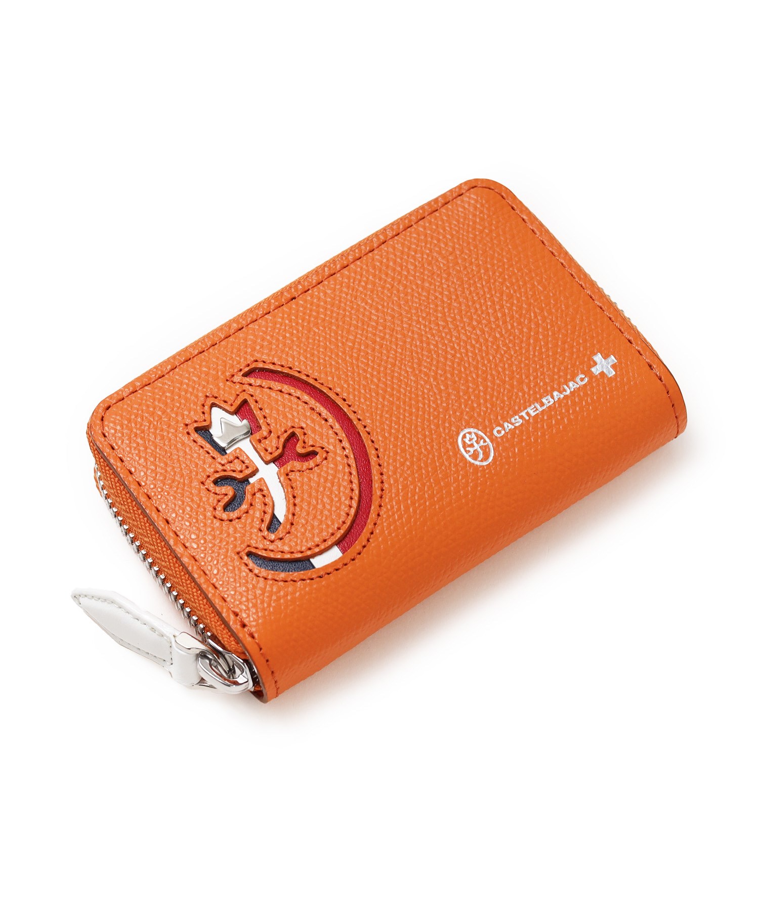 カステルバジャックらしいデザインのスマートキー対応キーケース。ブランドアイコンである家紋をトリコロールカラーで表現し、王冠部分にはメタルパーツで立体感を出しています。エンボス加工を施したオリジナル牛革に、シルバー箔押しのブランドロゴを入れることで高級感を演出しています。
