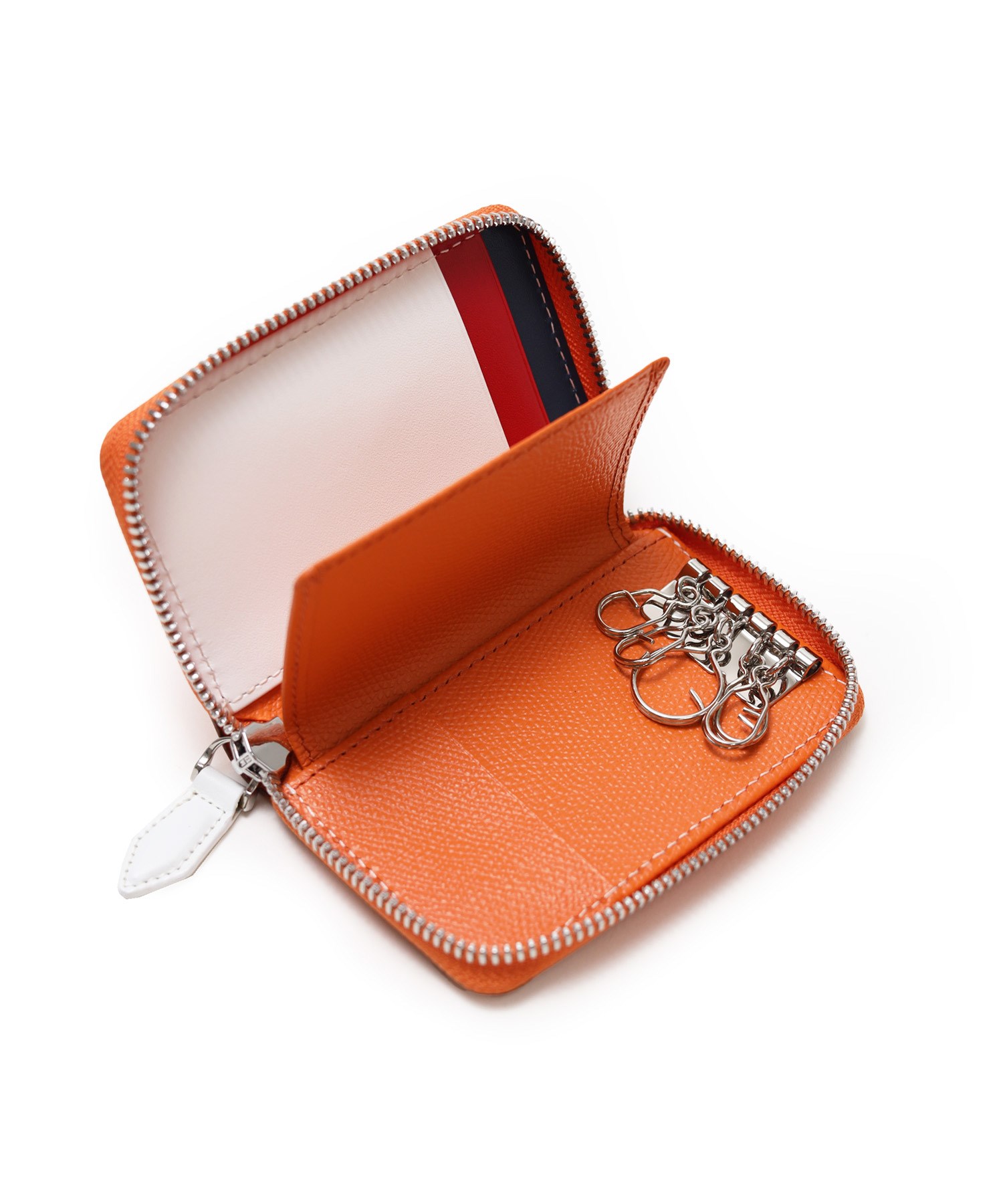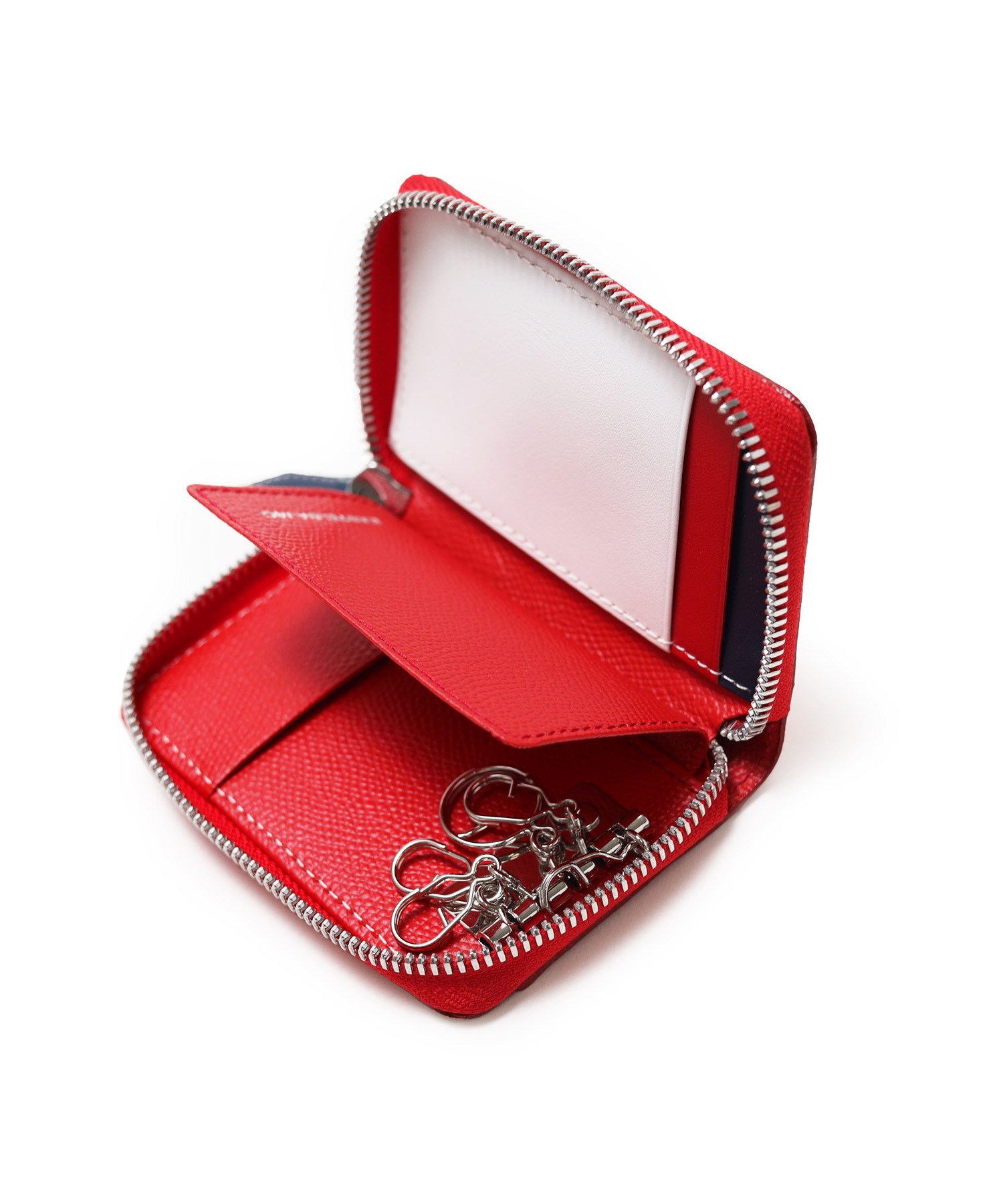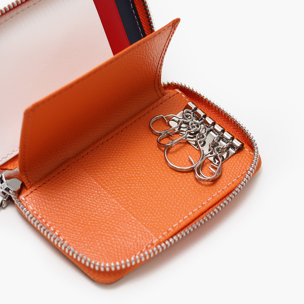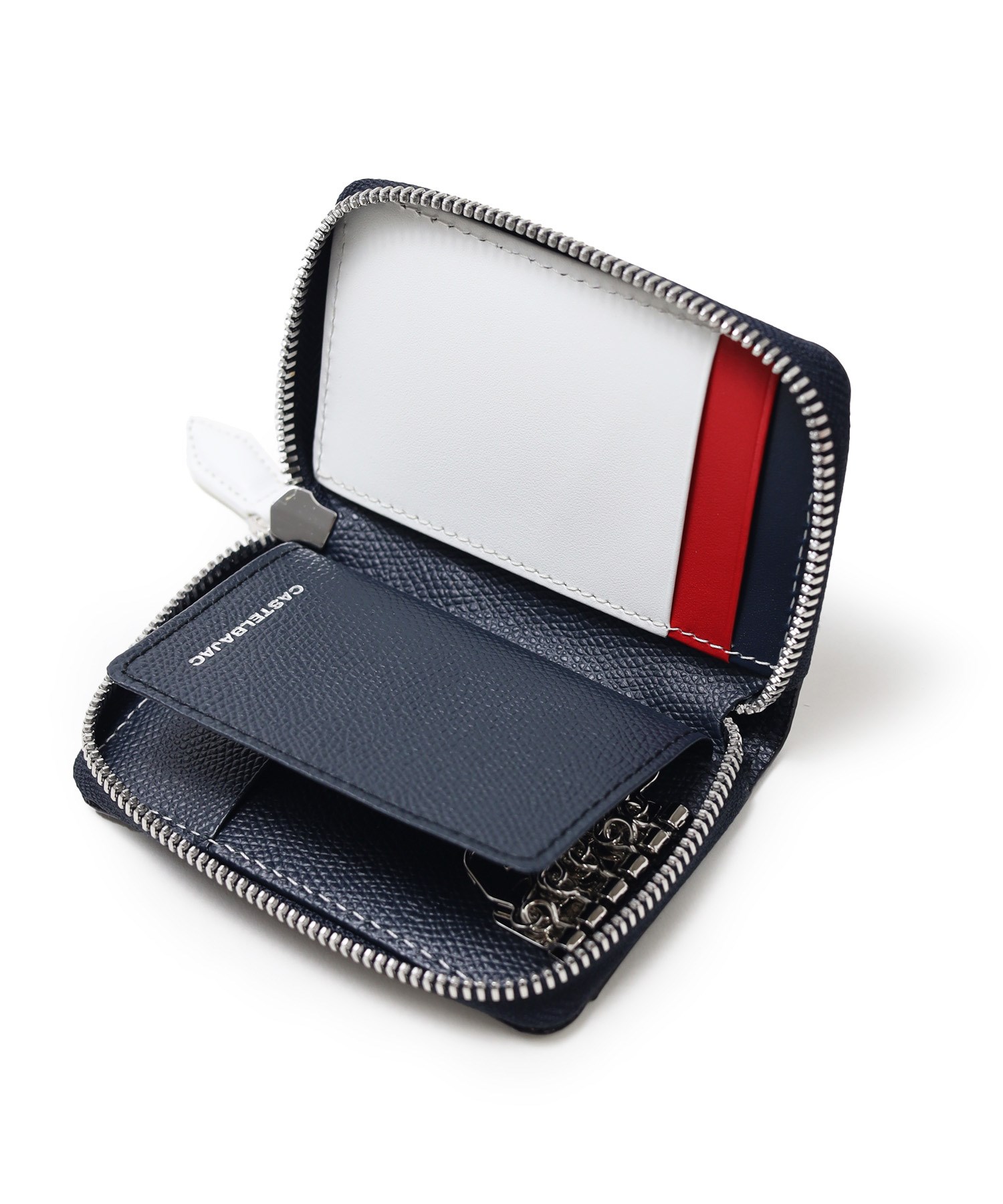 カステルバジャックらしいデザインのスマートキー対応キーケース。通常の鍵からスマートキーのような厚さのある鍵、カードキーまで収納可能で、大切なものを一つにまとめての管理が叶います。ブランドアイコンである家紋をトリコロールカラーで表現し、王冠部分にはメタルパーツで立体感を出しています。エンボス加工を施したオリジナル牛革に、シルバー箔押しのブランドロゴを入れることで高級感を演出しています。