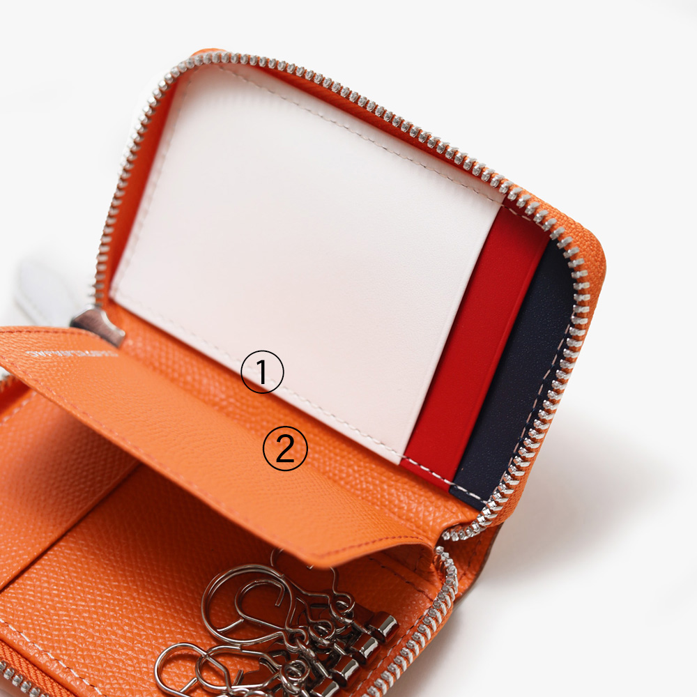 通常の鍵からスマートキーのような厚さのある鍵、カードキーまで収納可能。キーリングが5つ(大x1,小x2)とフリーポケットx2(①、②)が付いています。鍵と定期券だけでなく、車のキーとETCカードなど、使い方が広がります。背面にはパスケース付きで、大切なものを一つにまとめての管理が叶います。