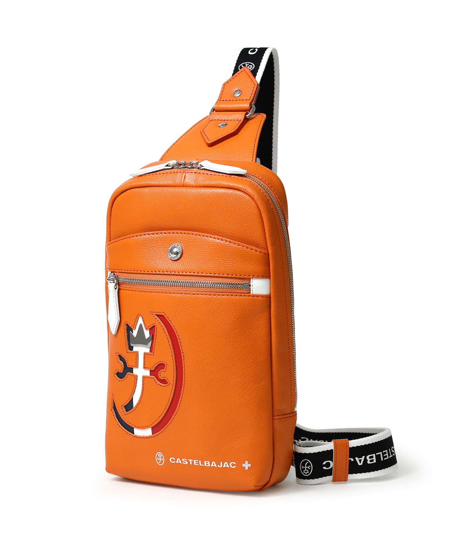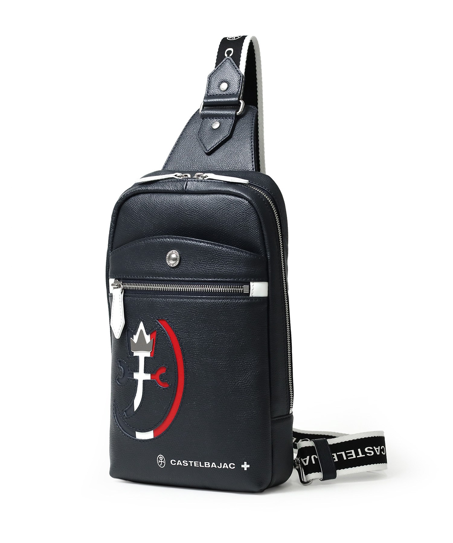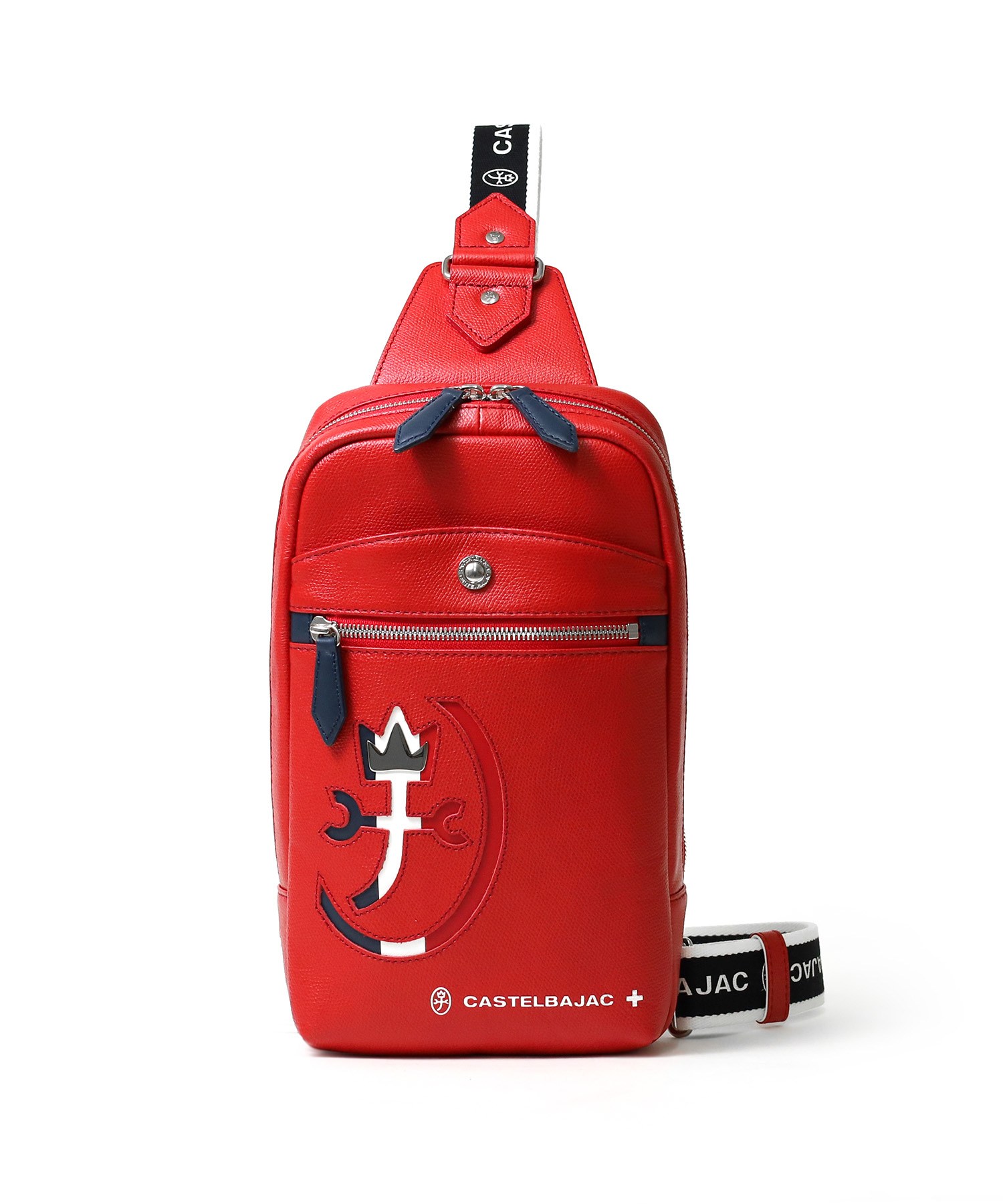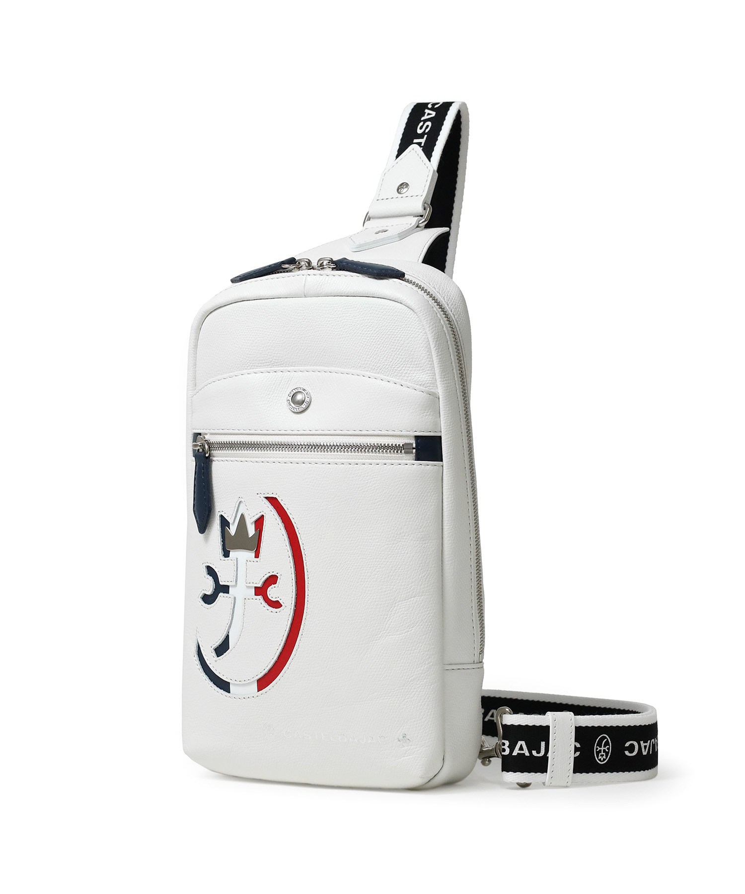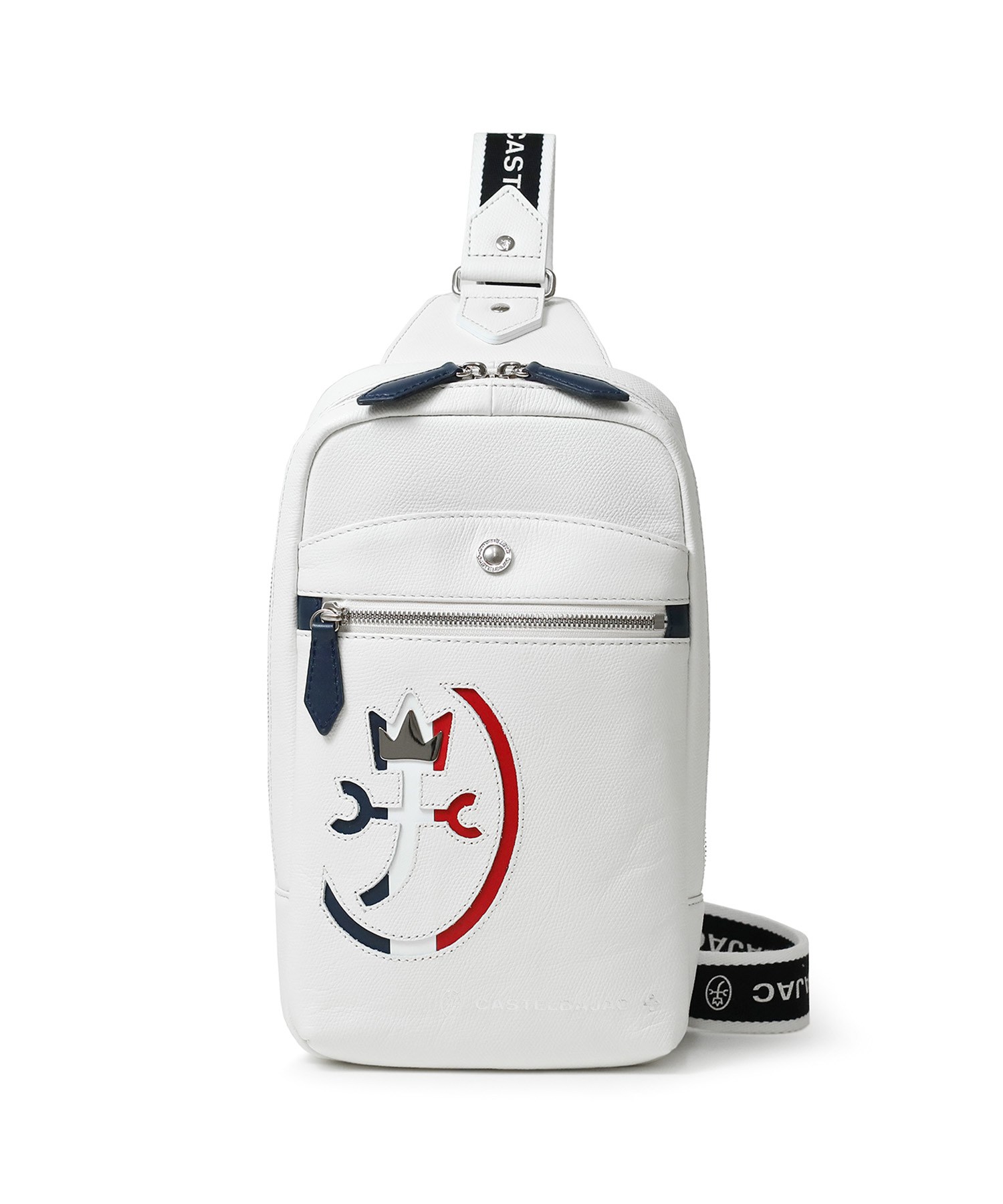 カステルバジャックらしいデザインのレザーワンショルダーバッグ。トリコロールカラーの家紋に王冠のメタルパーツがポイントです。エンボス加工を施したオリジナル牛革に、シルバー箔押しのブランドロゴを入れることで高級感を演出しています。