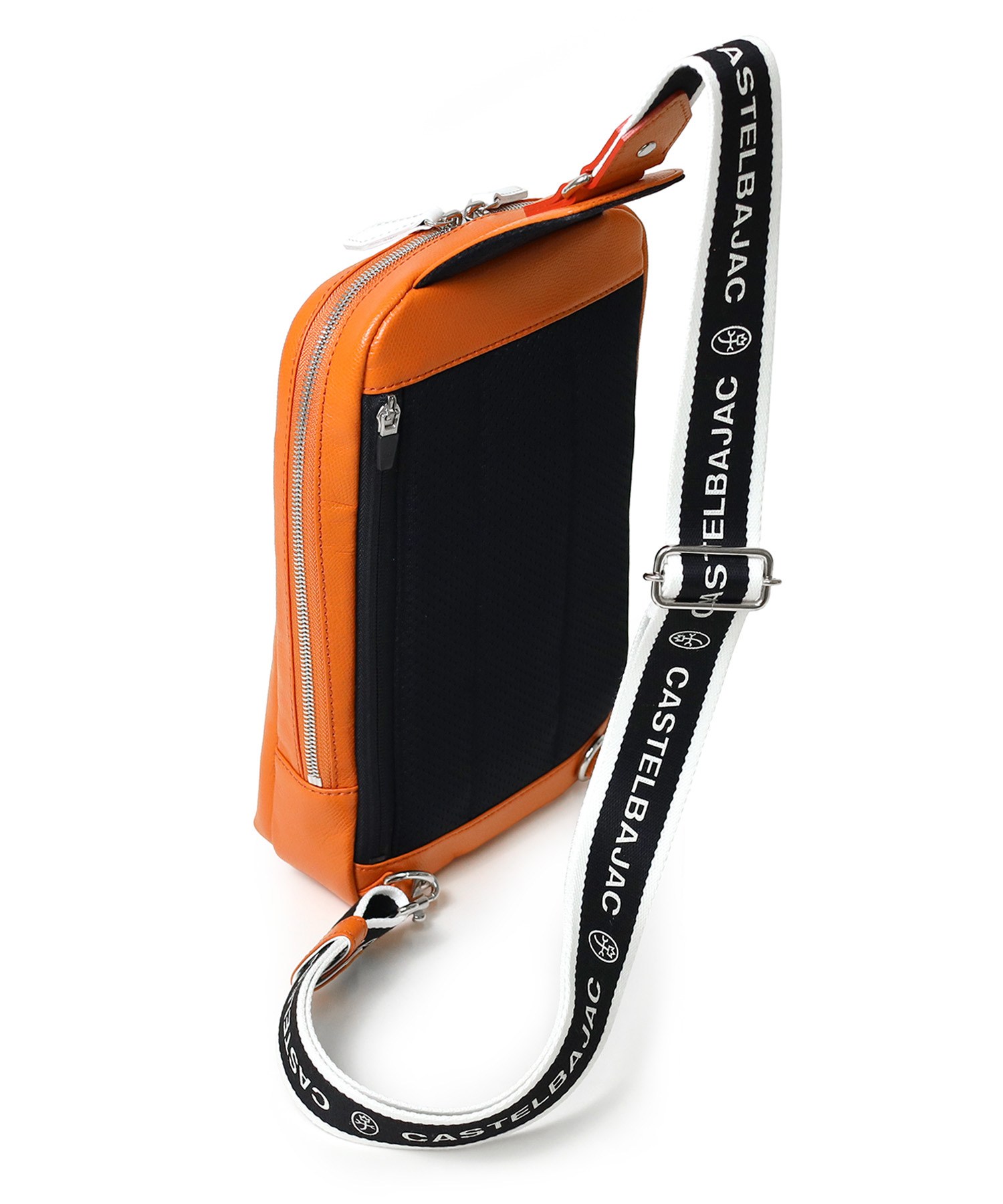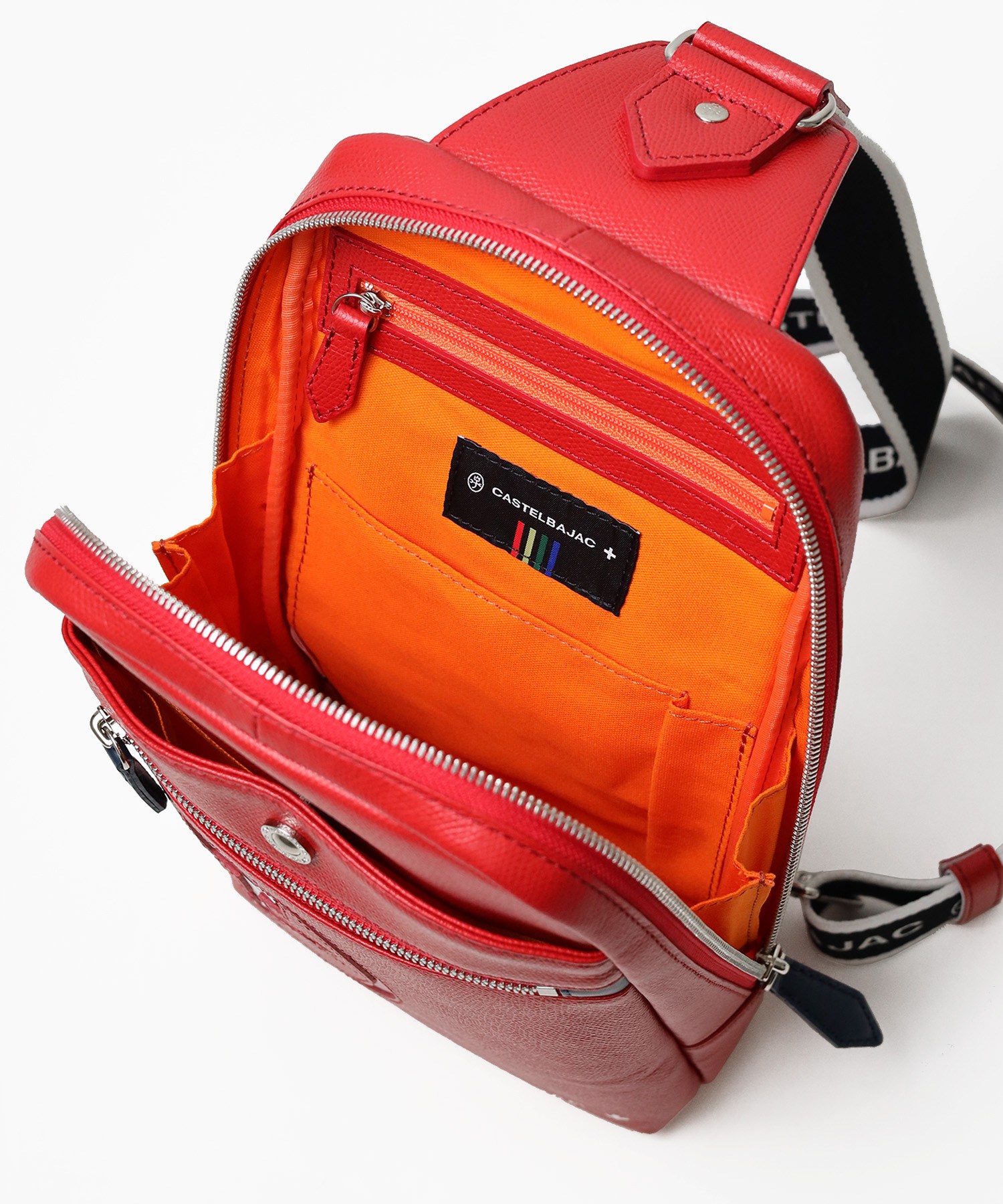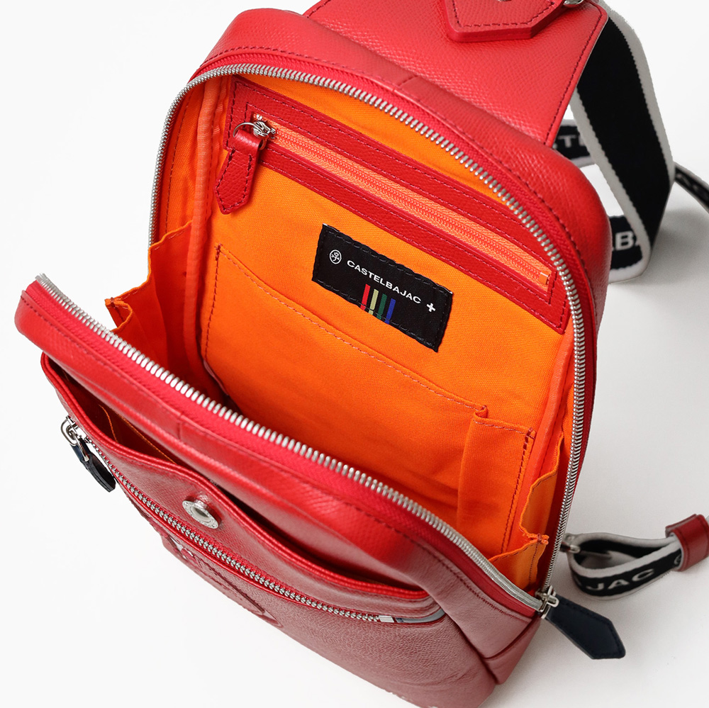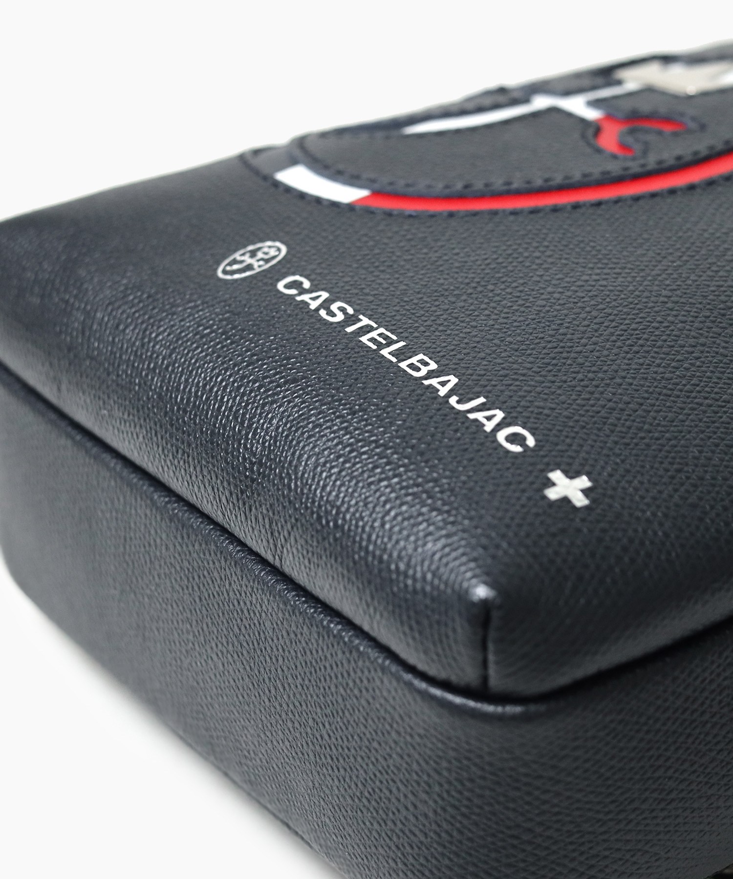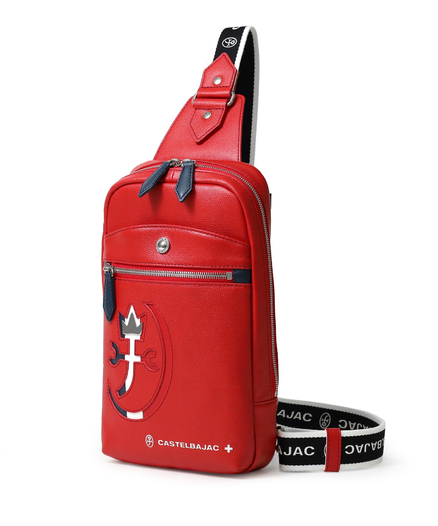 カステルバジャックらしいデザインのレザーワンショルダーバッグ。トリコロールカラーの家紋に王冠のメタルパーツがポイントです。エンボス加工を施したオリジナル牛革に、シルバー箔押しのブランドロゴを入れることで高級感を演出しています。