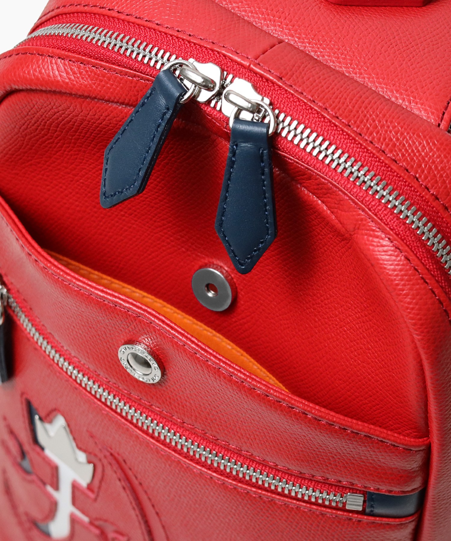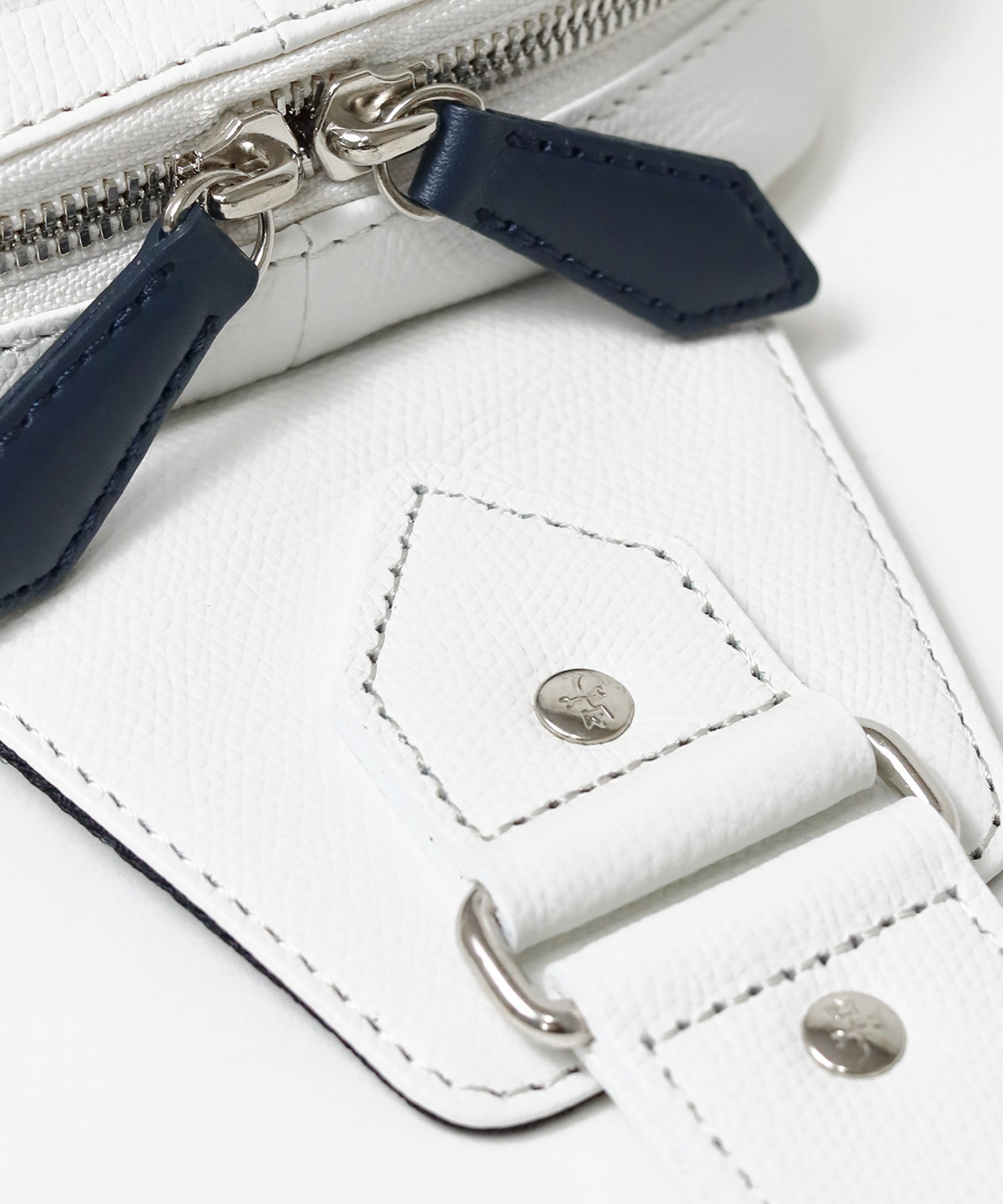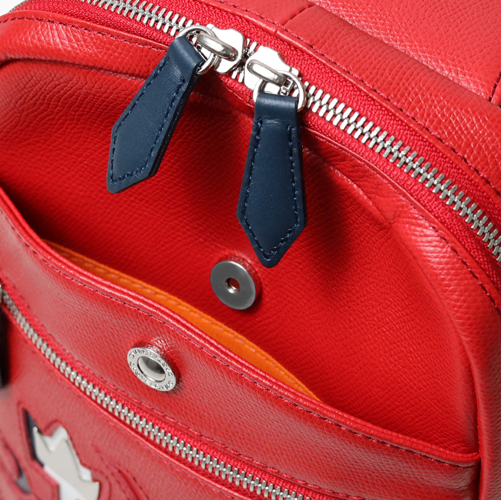 ブランドアイコンの家紋をトリコロールカラーで表現した日本製レザーカジュアルシリーズ。本体素材には良質な原皮を国内タンナーで丁寧に鞣し、長い時間を掛けてミーリングを施したソフトな風合いの軽量オリジナル牛革を使用。バジャックらしい発色と、シンプルで高級感のあるエンボスは傷が目立ちにくく、しっかりとした底面で自立性があるのも魅力。王冠のメタルパーツとブランドロゴのシルバーの箔押しで高級感を高めています。