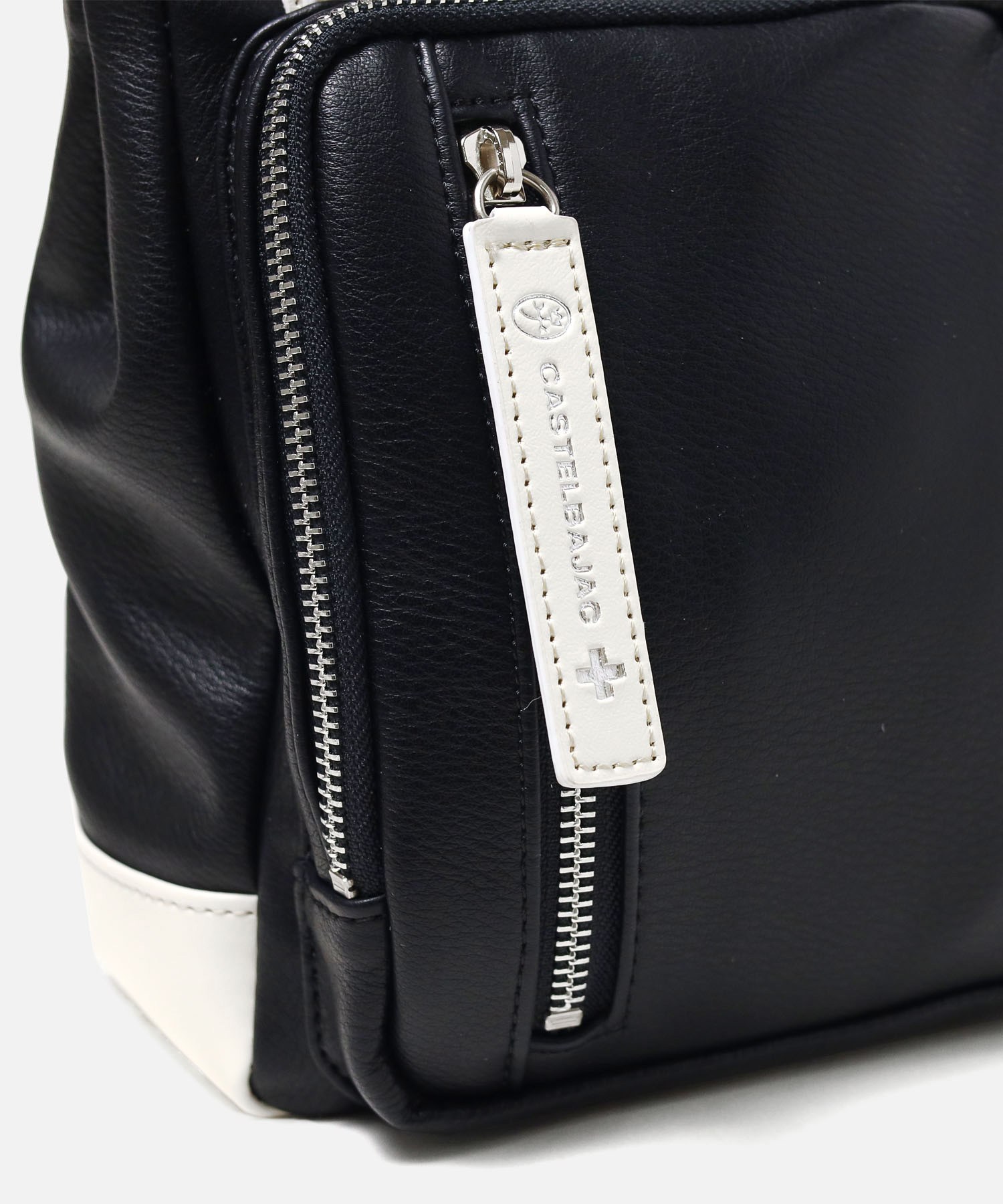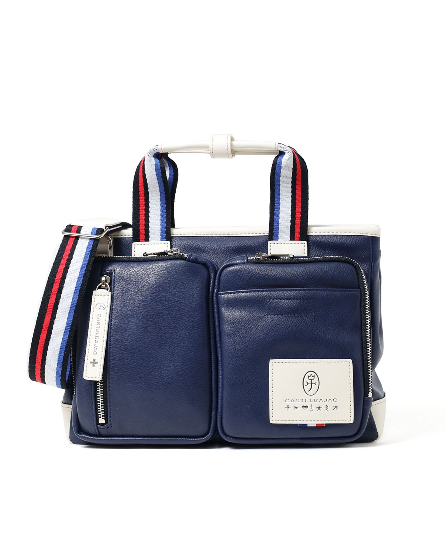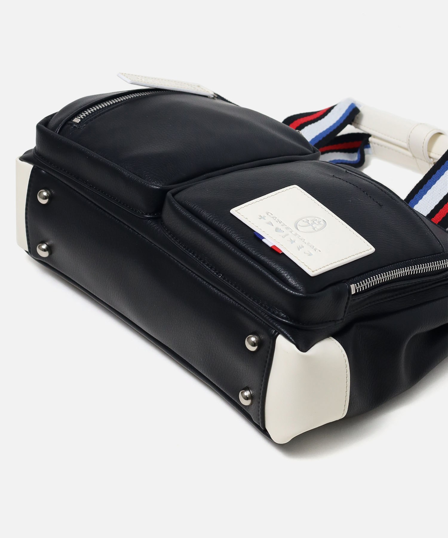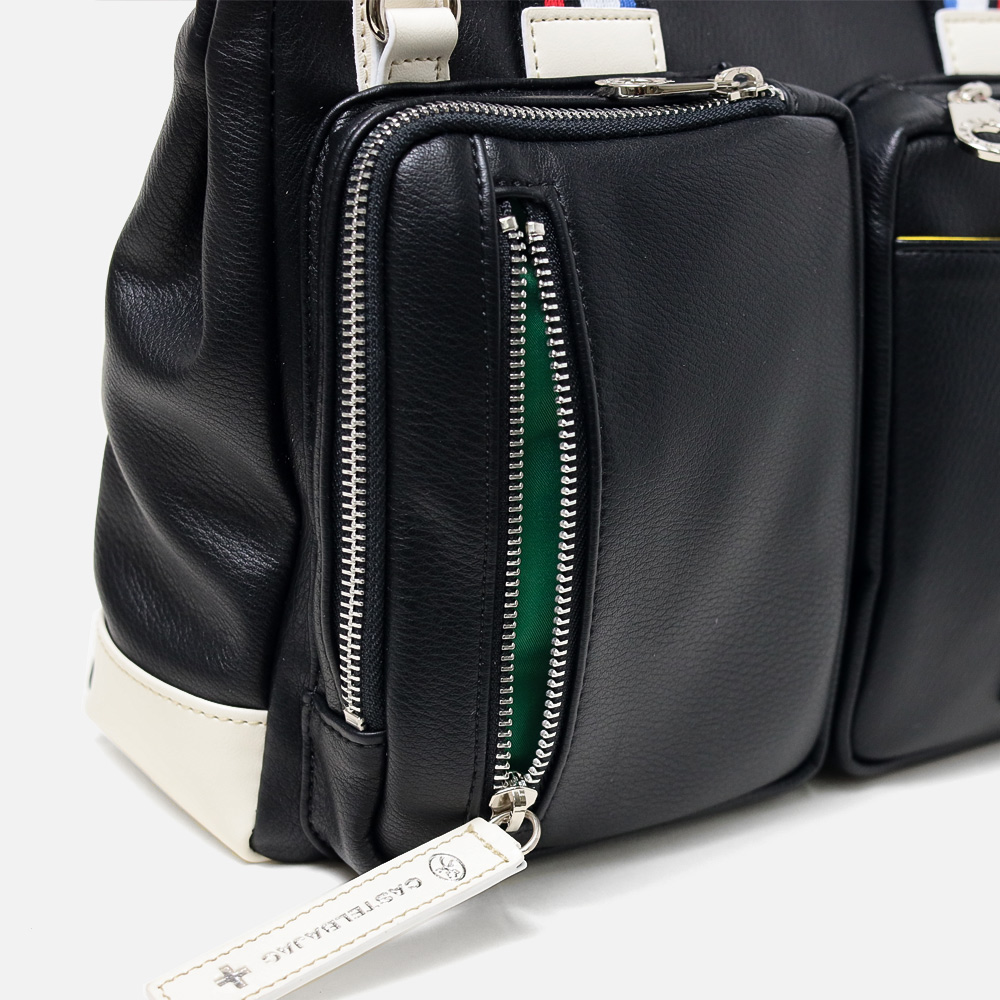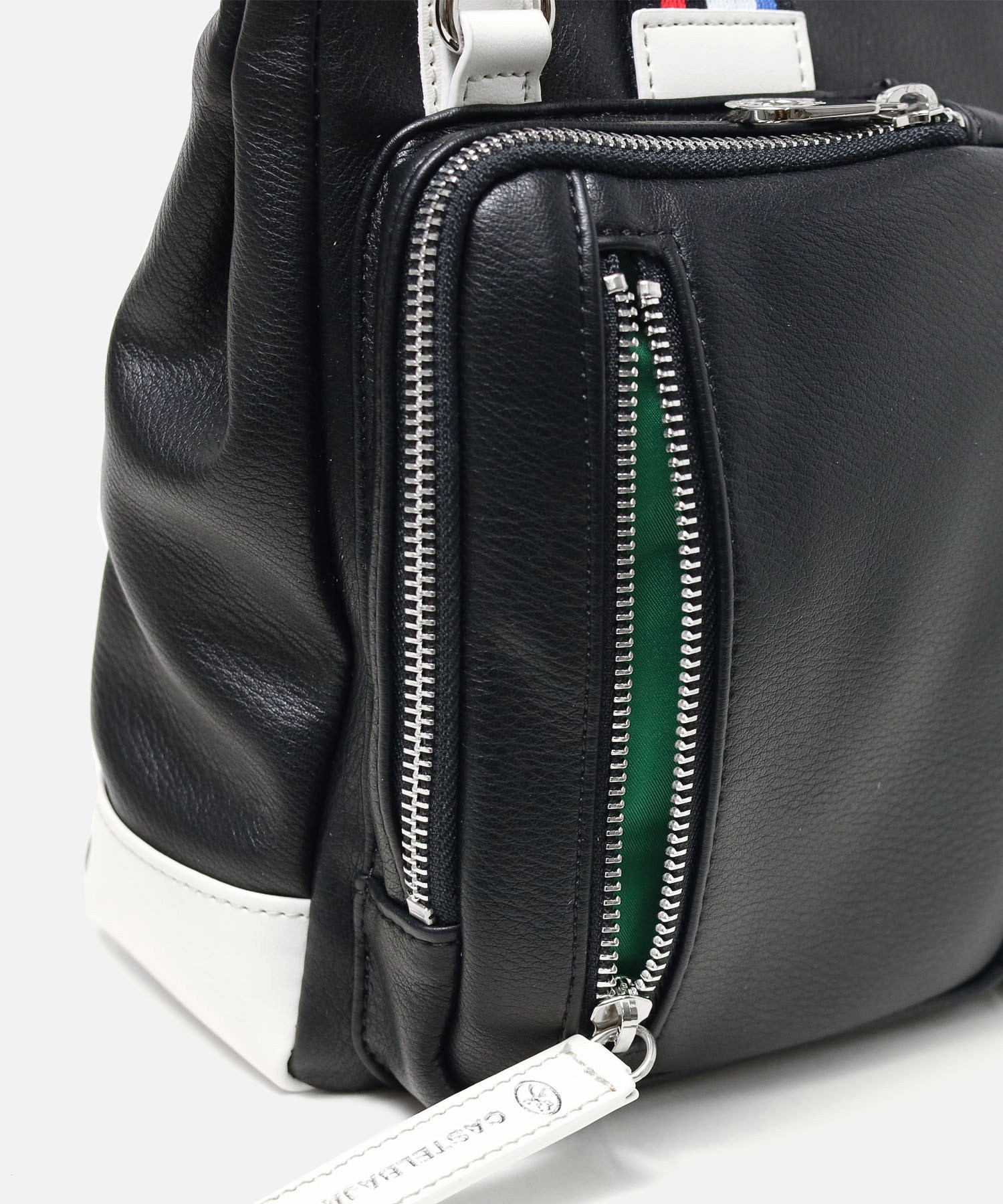 ファスナー使いやポケットのディティール等でスポーツ・ユニセックス的なテイストを表現したシリーズ。大きめロゴパッチやトリコロールカラーのリボンとテープ、引き手のネーム表現等でのカステルバジャックらしいブランド表現がポイントです。デイリーに使いやすいサイズ感と内外装共に機能性が充実のアイテムで、細かいものなど整理整頓しての収納に対応します。ショルダーベルト付属のため、2WAYでお使いいただけます。