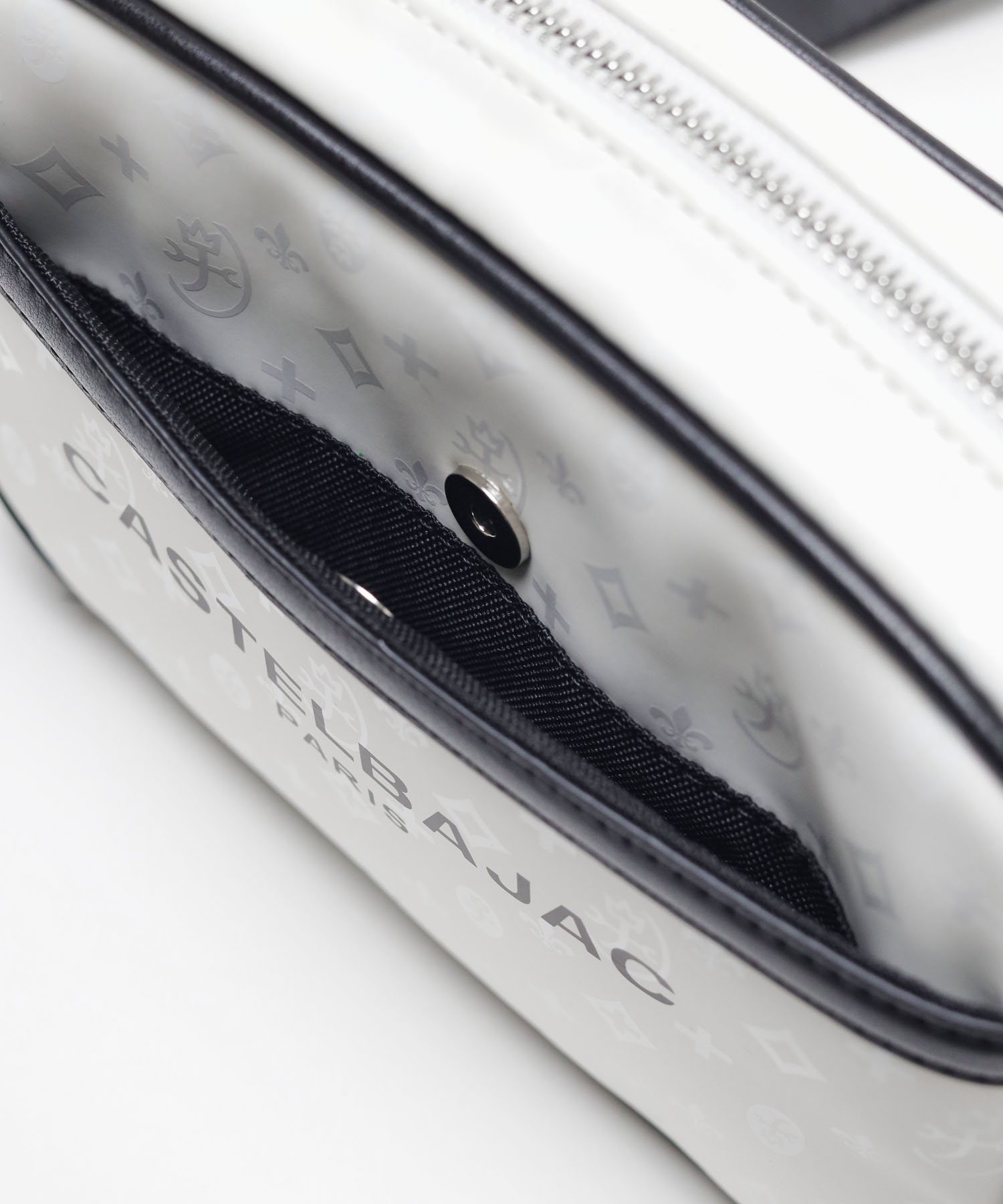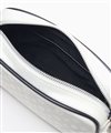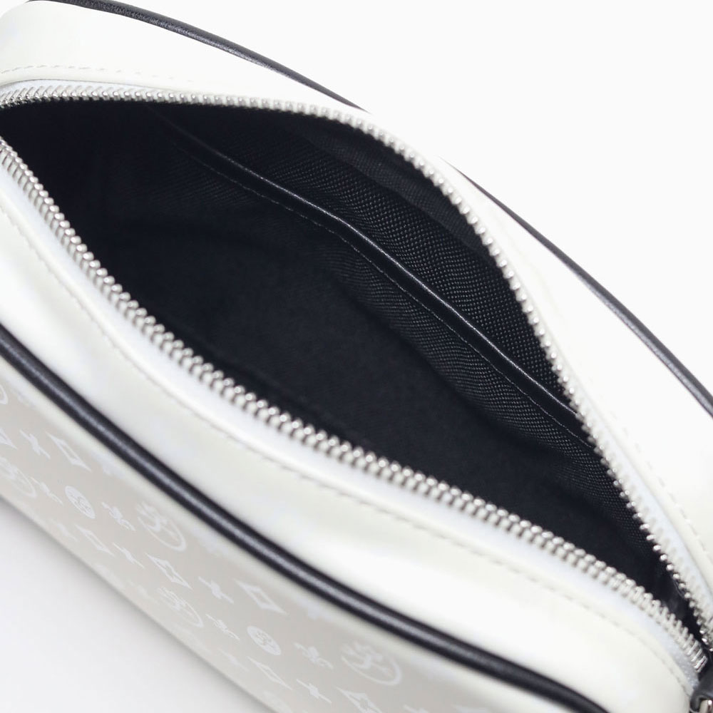 本体には、マットな質感が魅力のラバー素材を採用。表面に光沢のあるモノグラム柄をプリントすることで、よりキラキラと存在感を放ちます。付属部分には厚みのある牛革を組み合わせ、上品な印象に仕上げています。