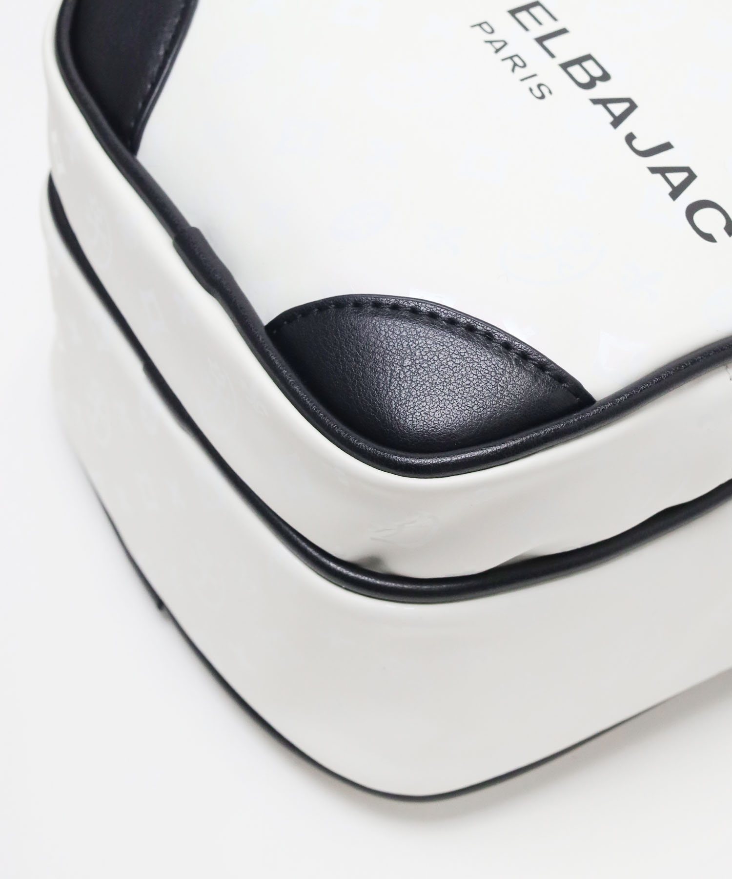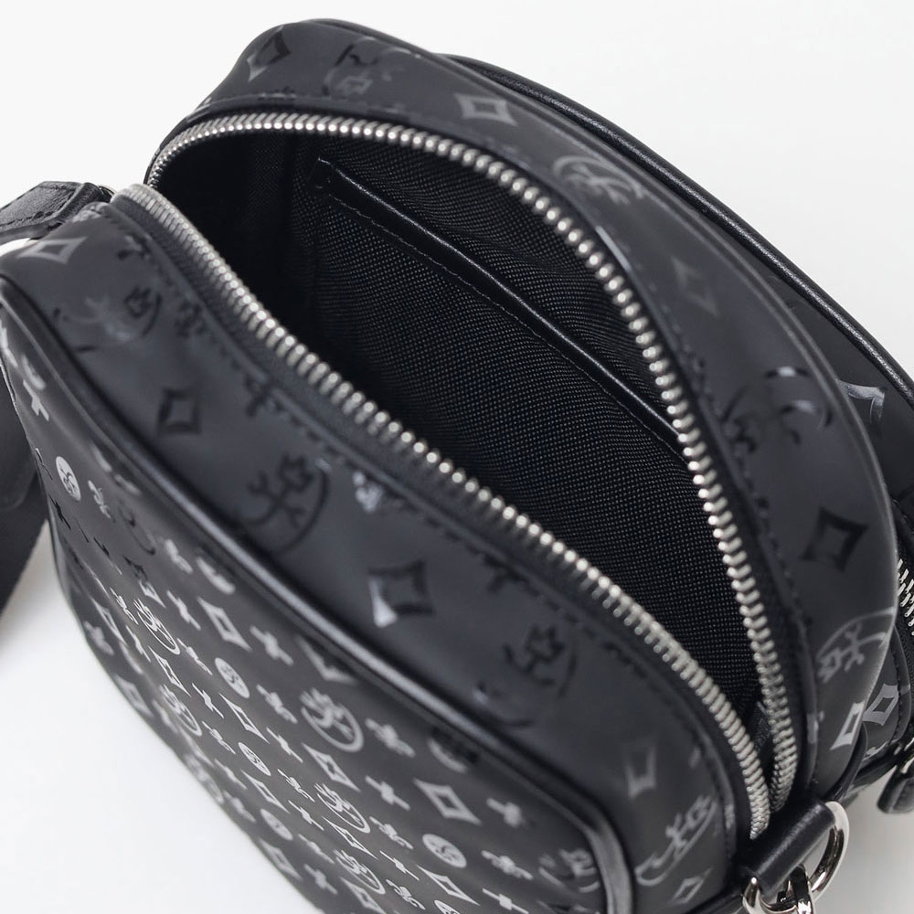 本体には、マットな質感が魅力のラバー素材を採用。表面に光沢のあるモノグラム柄をプリントすることで、よりキラキラと存在感を放ちます。付属部分には厚みのある牛革を組み合わせ、上品な印象に仕上げています。