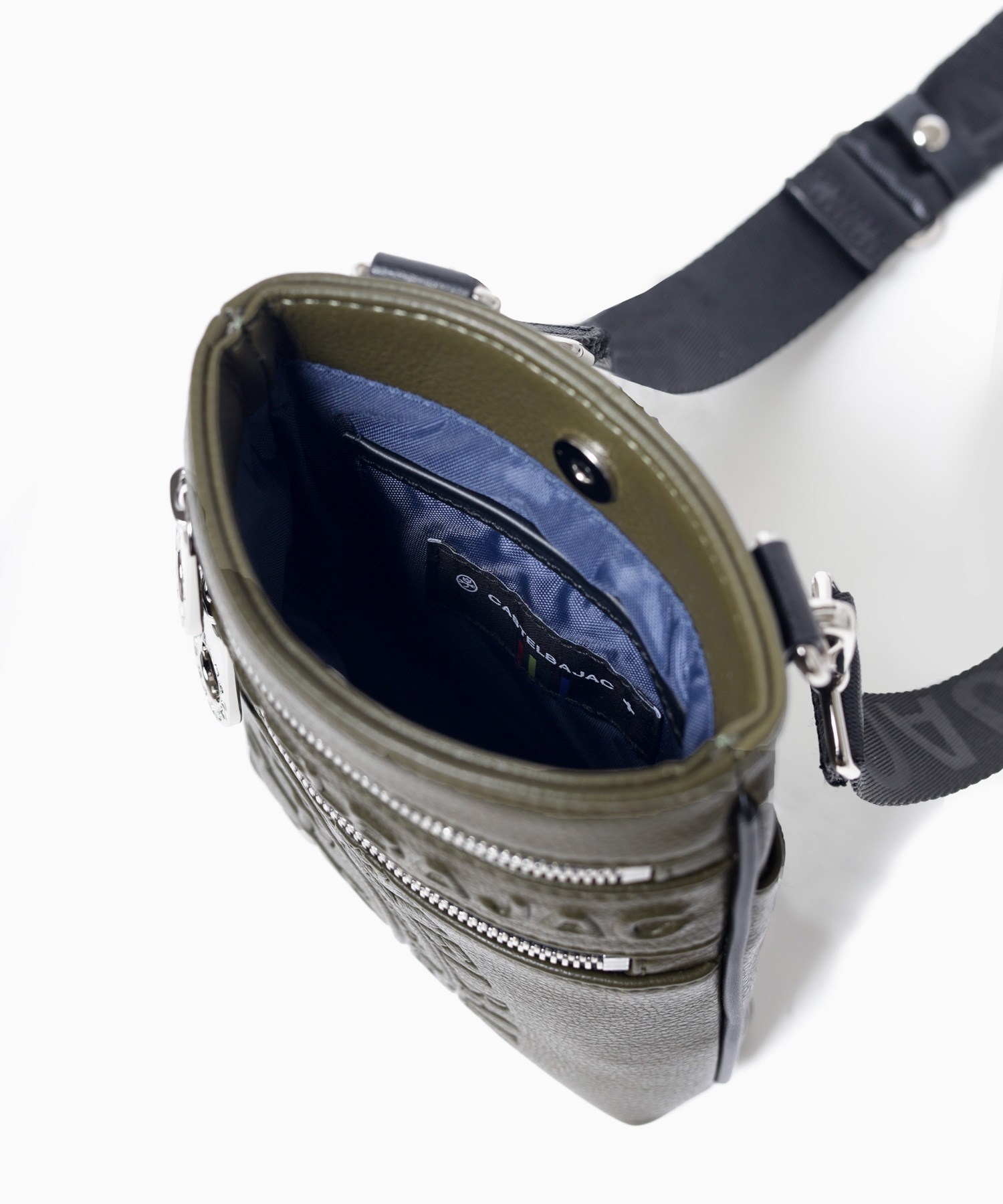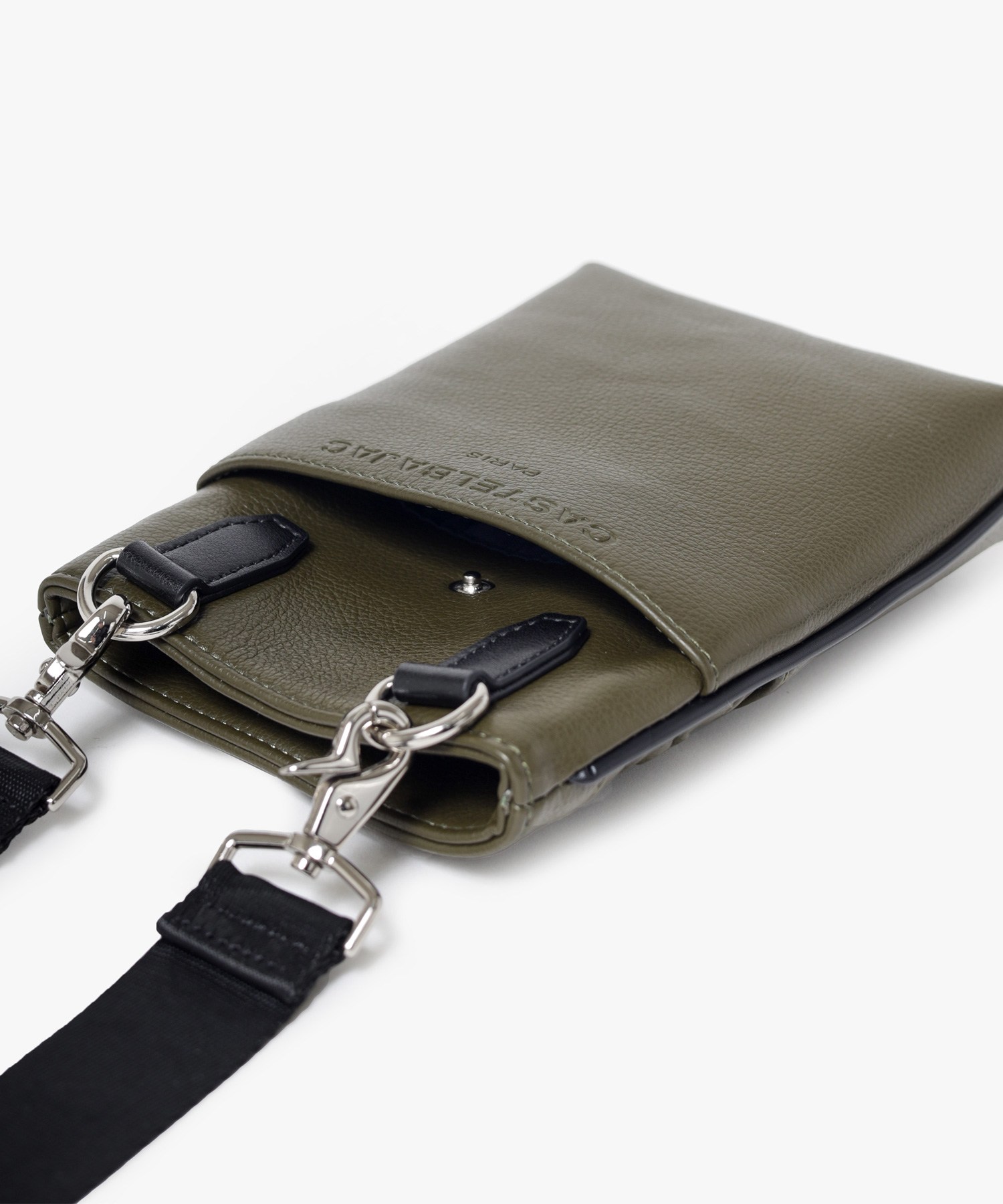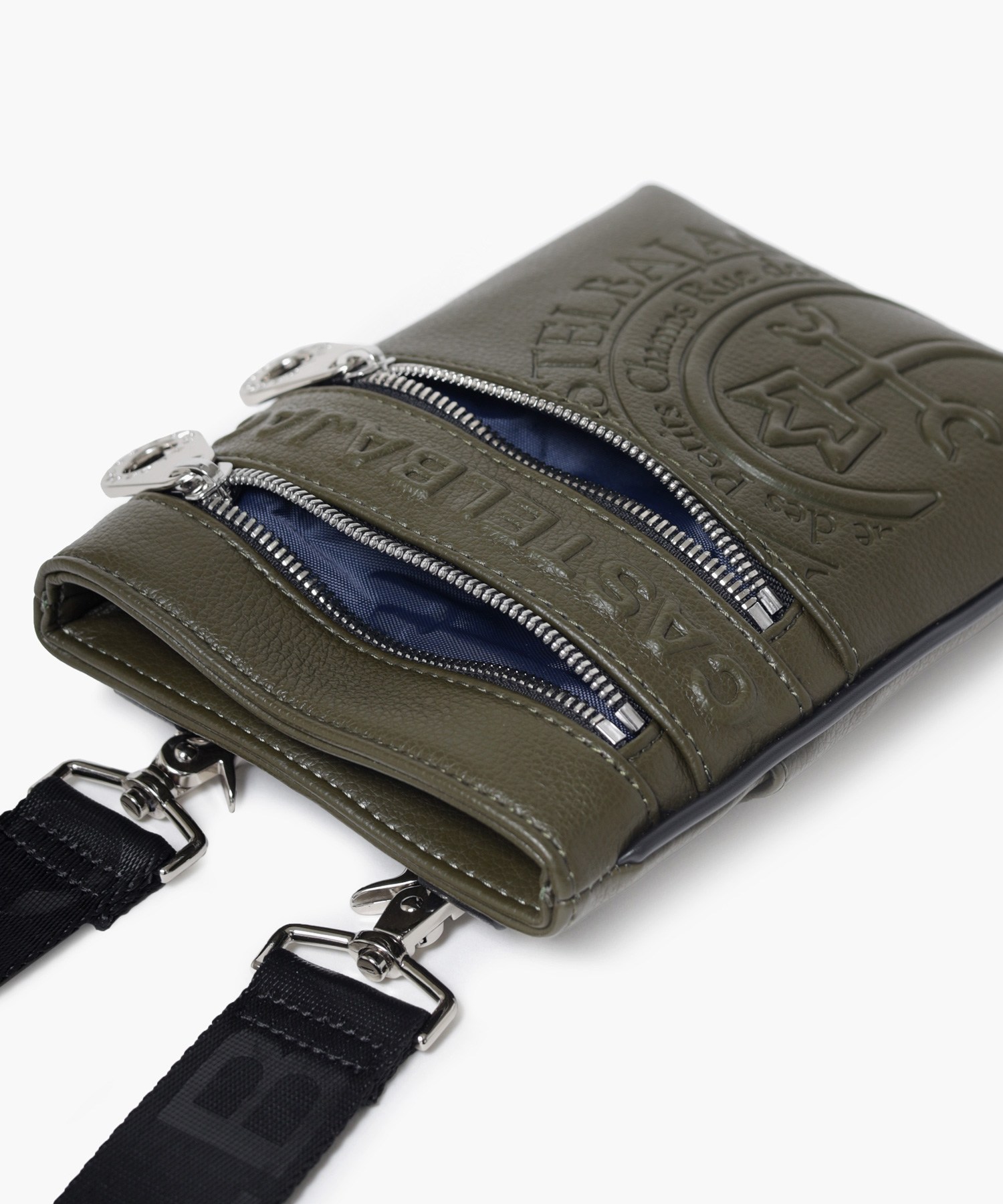 まるで革のような質感の合成皮革に、大きなロゴを浮き立たせブランド感を漂わせた、カステルバジャックのスマホショルダーバッグ。シンプルなデザインながらも、大胆で存在感のあるロゴが際立ち、スタイリッシュな雰囲気を醸し出しています。洗練されたデザインと実用性を兼ね備え、普段使いからお出かけや旅行にもおすすめのサイズです。