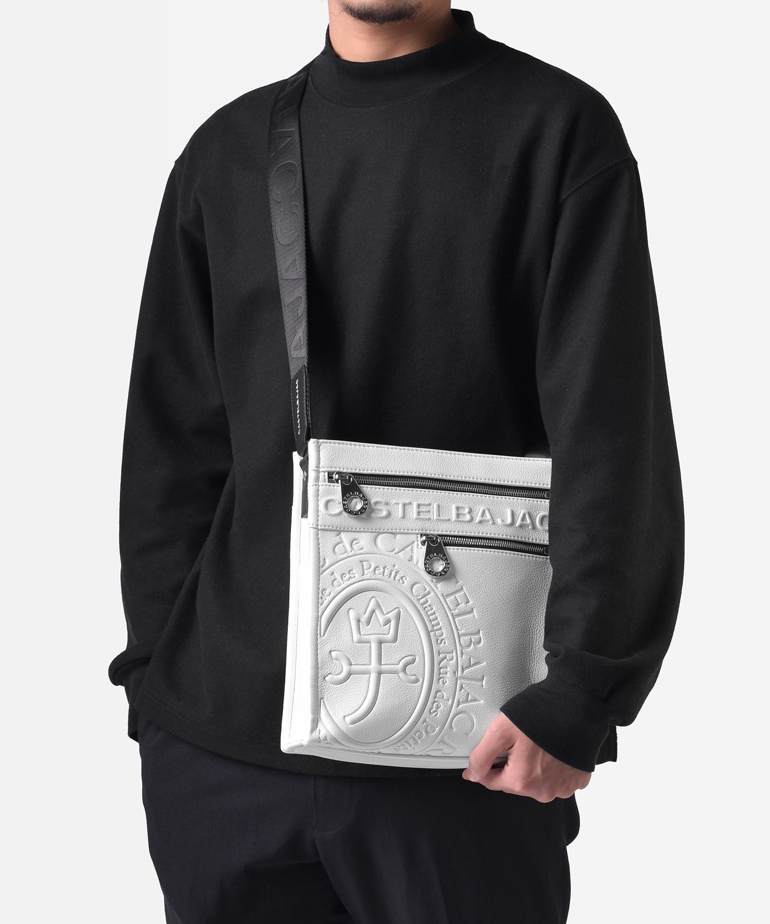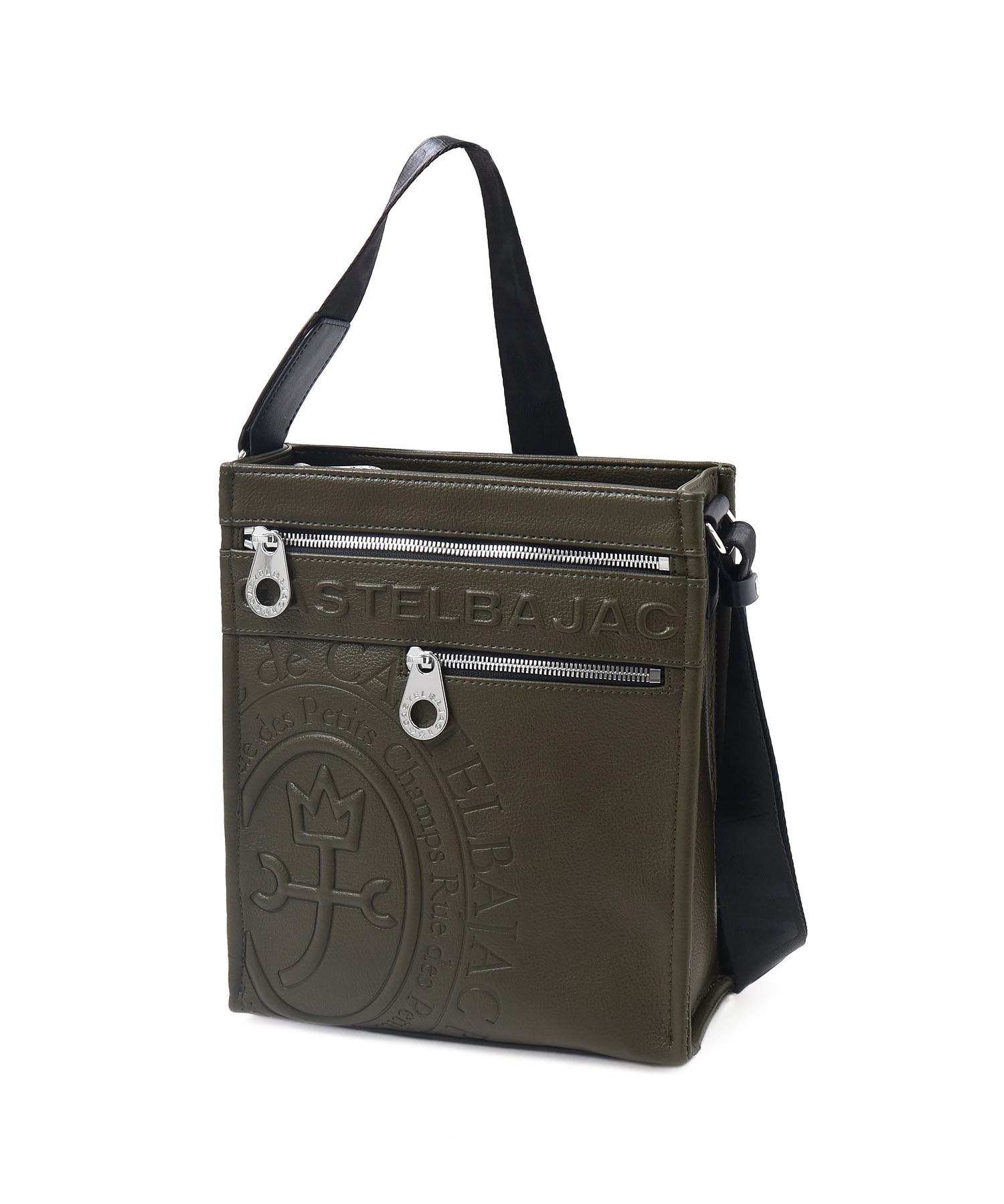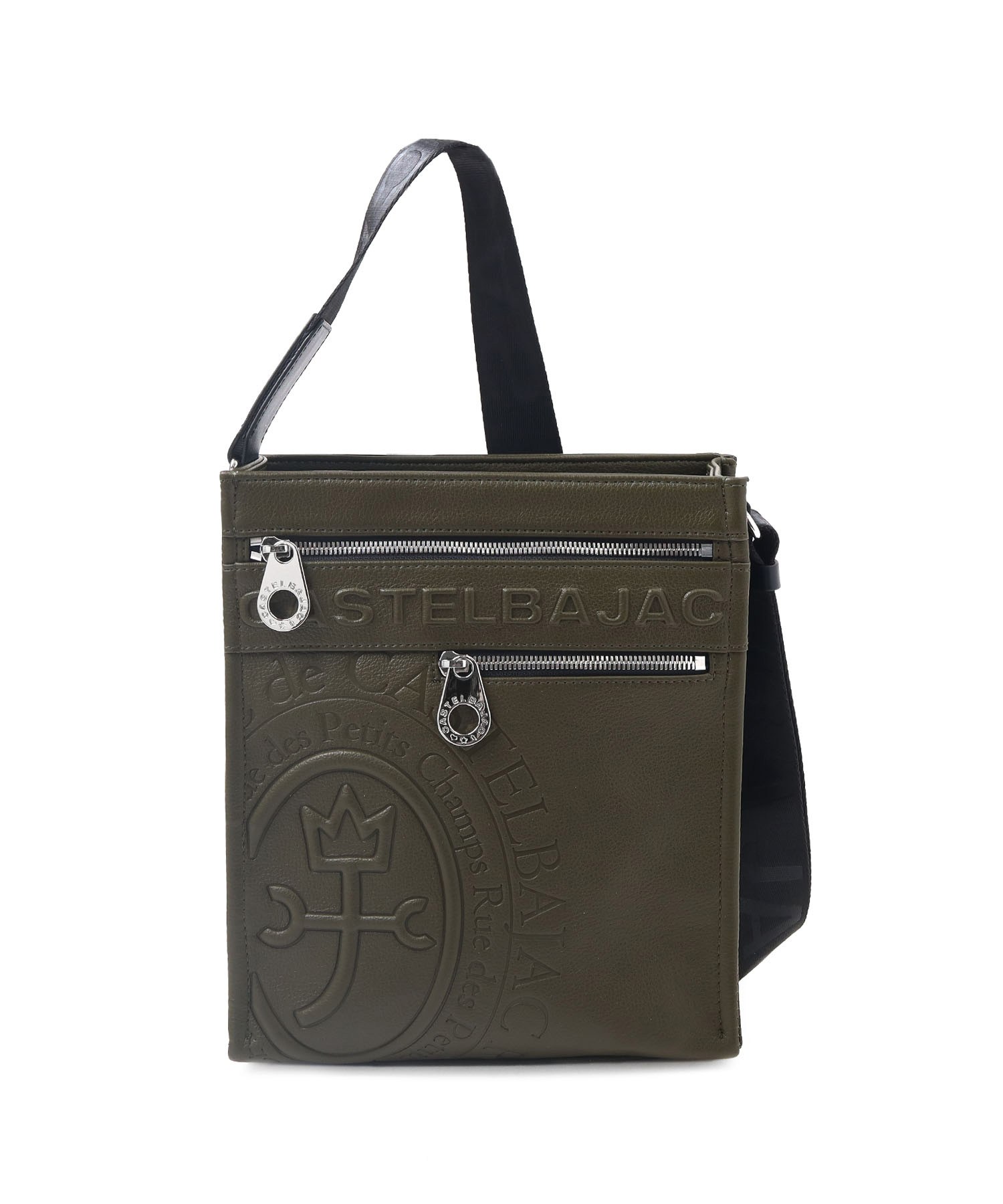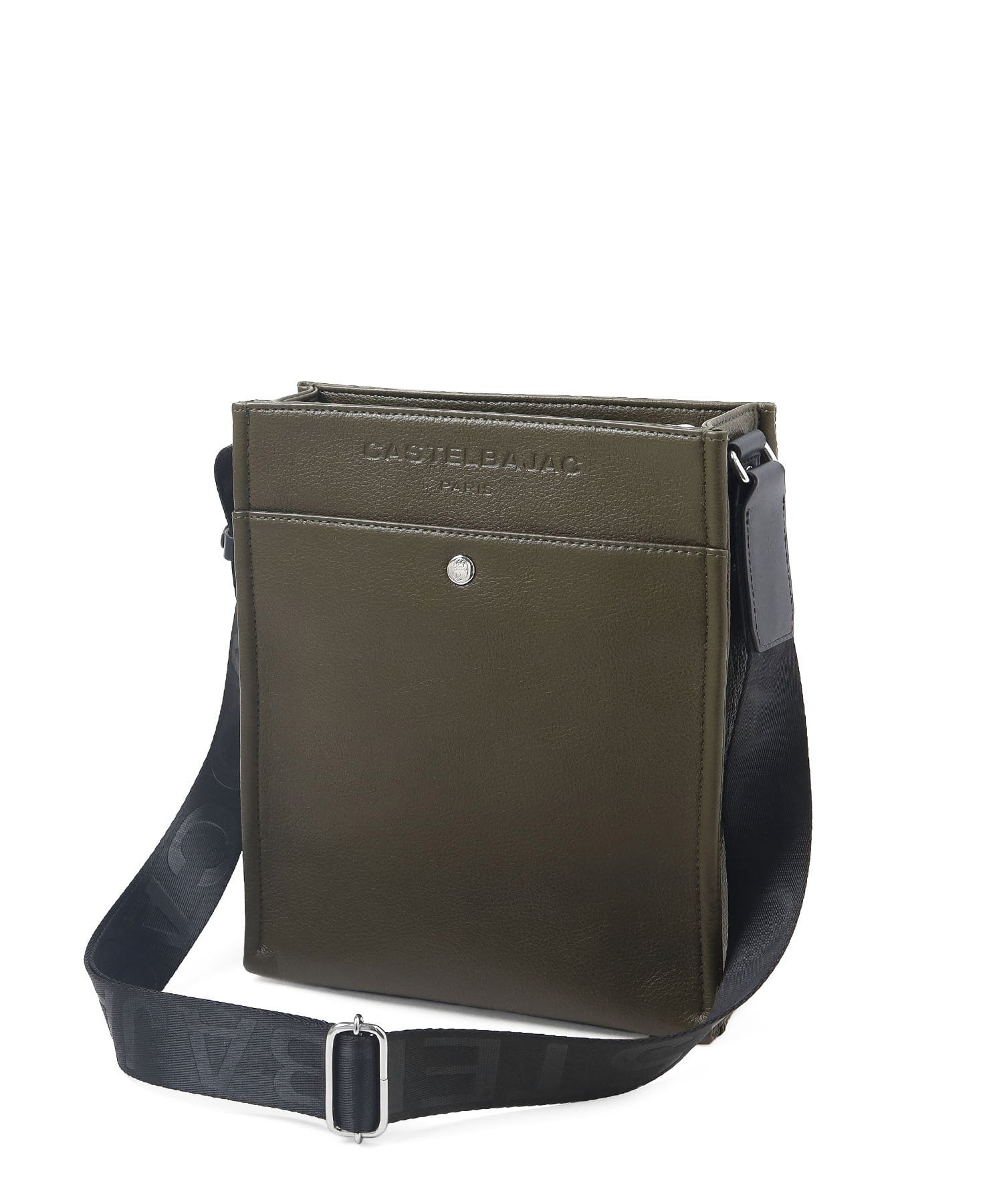 まるで革のような質感の合成皮革に、大きなロゴを浮き立たせブランド感を漂わせた、カステルバジャックのショルダーバッグ。シンプルなデザインながらも、大胆で存在感のあるロゴが際立ち、スタイリッシュな雰囲気を醸し出しています。クロ、シロ、カーキの使いやすい色展開は、日常のスタイリングにさりげないアクセントをプラス。洗練されたデザインと実用性を兼ね備え、普段使いに最適です。