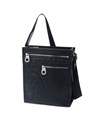 収納機能は、外側の前面にファスナーポケットが大小それぞれ1つずつあり、背面にホック付きポケット、そして内側にファスナーポケットとオープンポケットがございます。500mlペットボトルがすっぽりと入るサイズ感です。マチがしっかりとあるため、荷物をたくさん入れても型崩れせずお持ちいただけます。