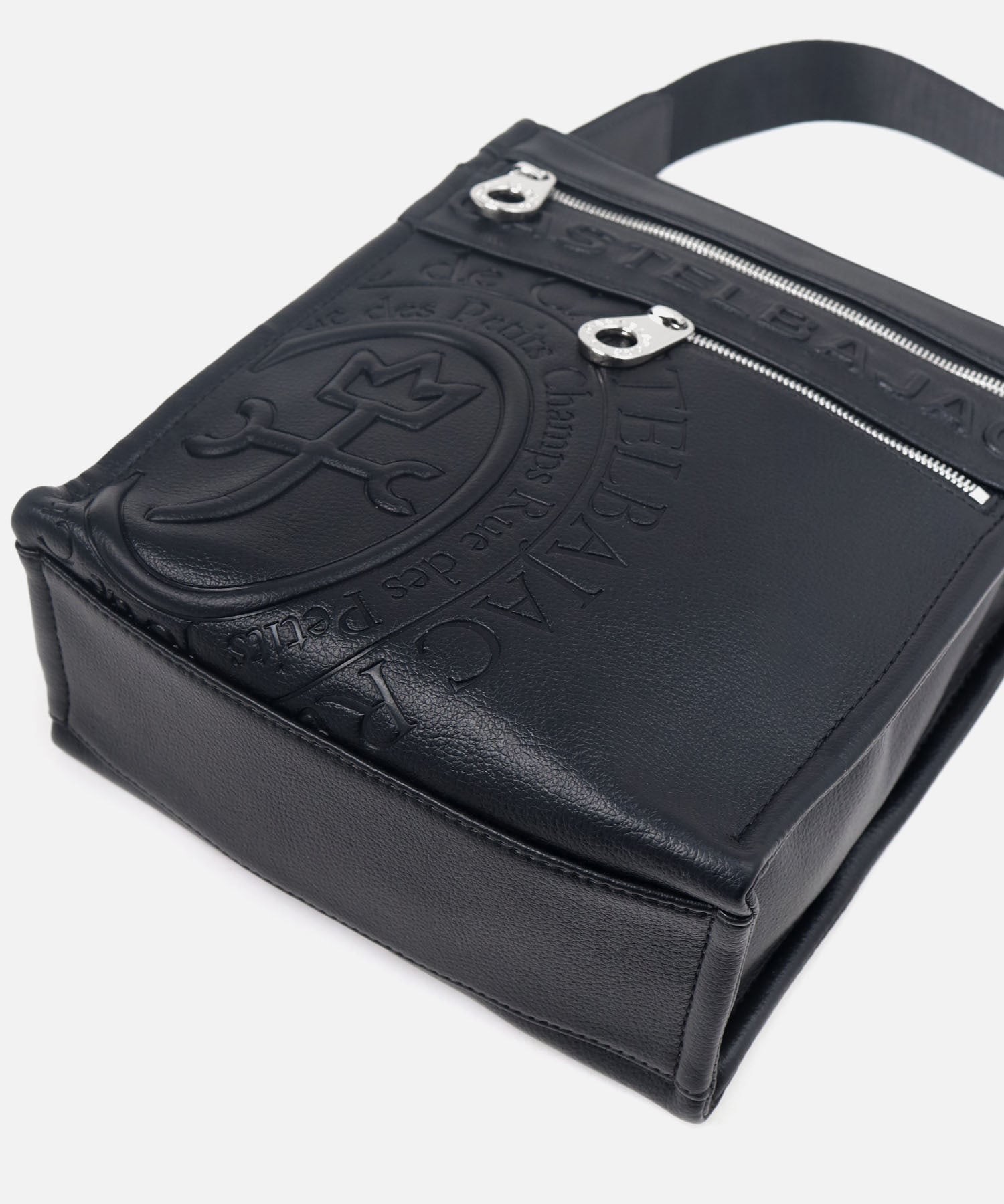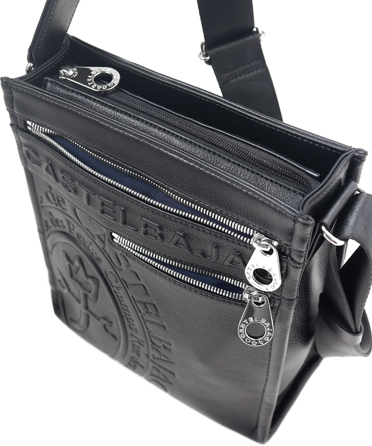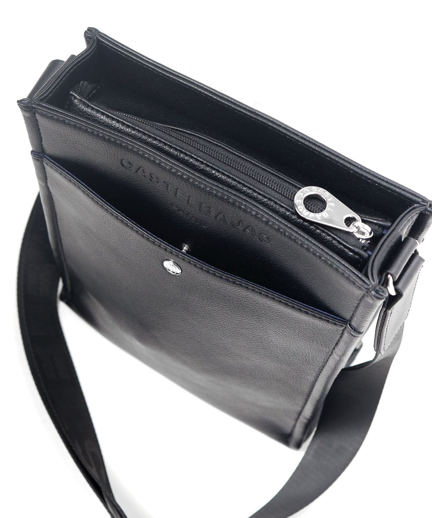 まるで革のような質感の合成皮革に、大きなロゴを浮き立たせブランド感を漂わせた、カステルバジャックのショルダーバッグ。シンプルなデザインながらも、大胆で存在感のあるロゴが際立ち、スタイリッシュな雰囲気を醸し出しています。洗練されたデザインと実用性を兼ね備え、普段使いに最適です。