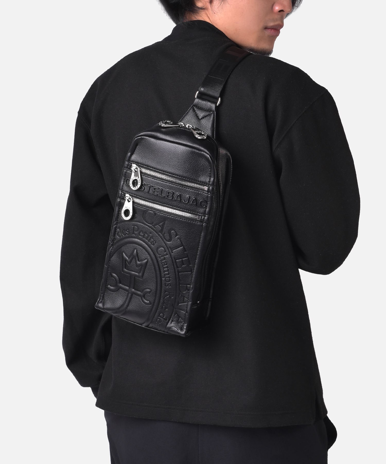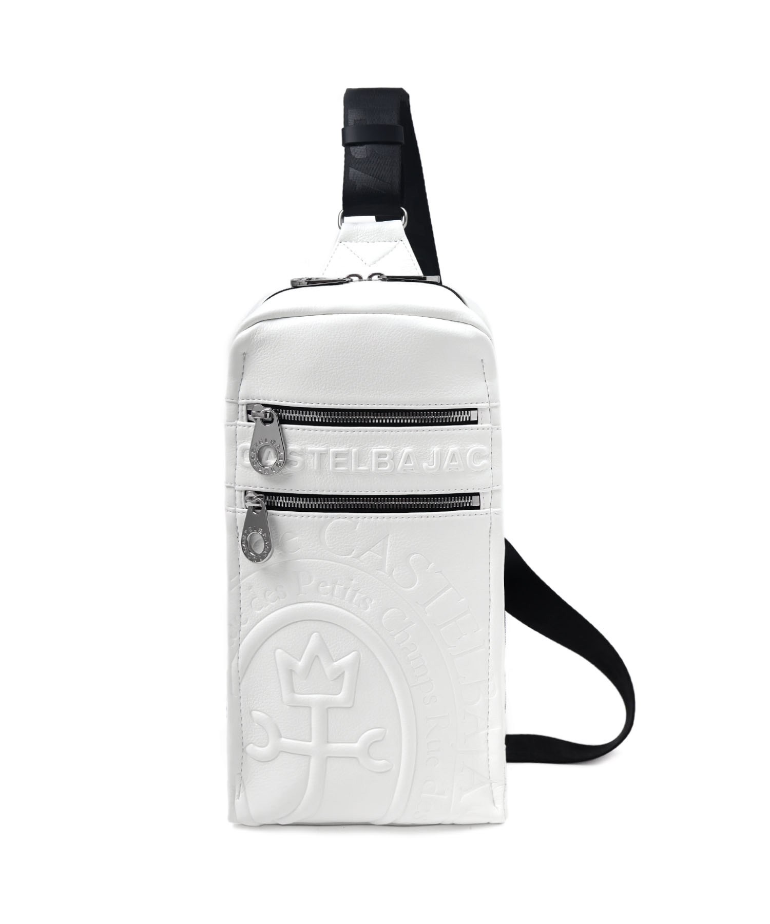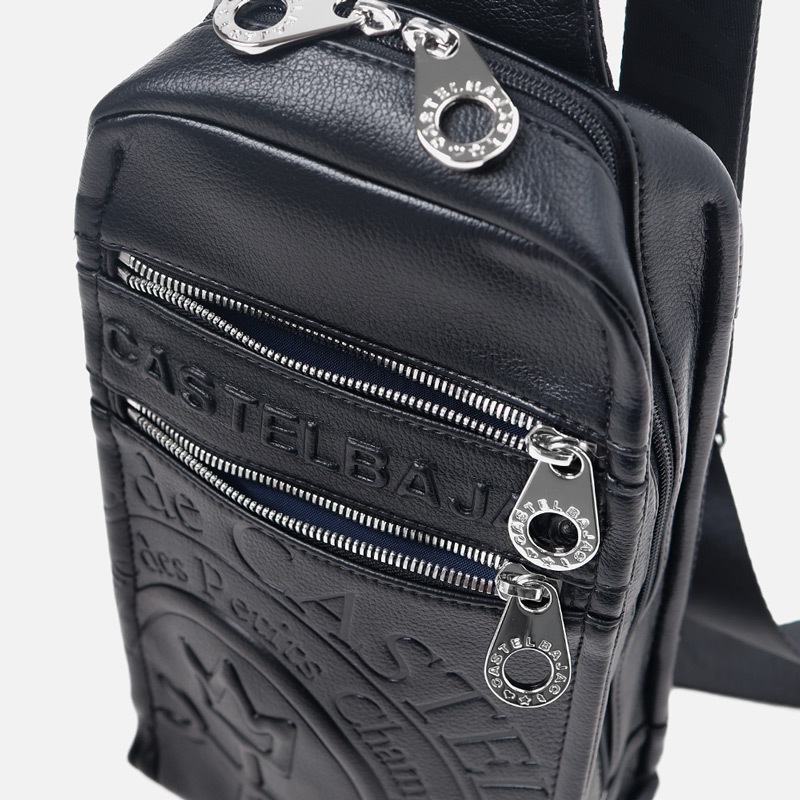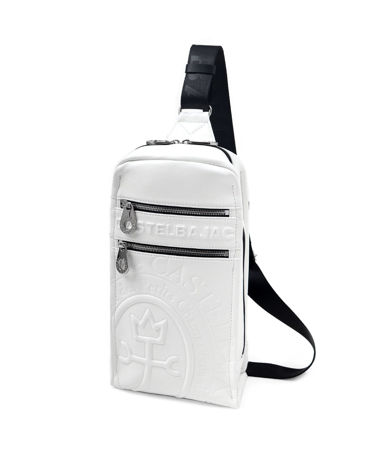 まるで革のような質感の合成皮革に、大きなロゴを浮き立たせブランド感を漂わせた、カステルバジャックのワンショルダーバッグ。シンプルなデザインながらも、大胆で存在感のあるロゴが際立ち、スタイリッシュな雰囲気を醸し出しています。500mlペットボトルがすっぽりと入り、お出かけや旅行などに大活躍のワンショルダーバッグです。