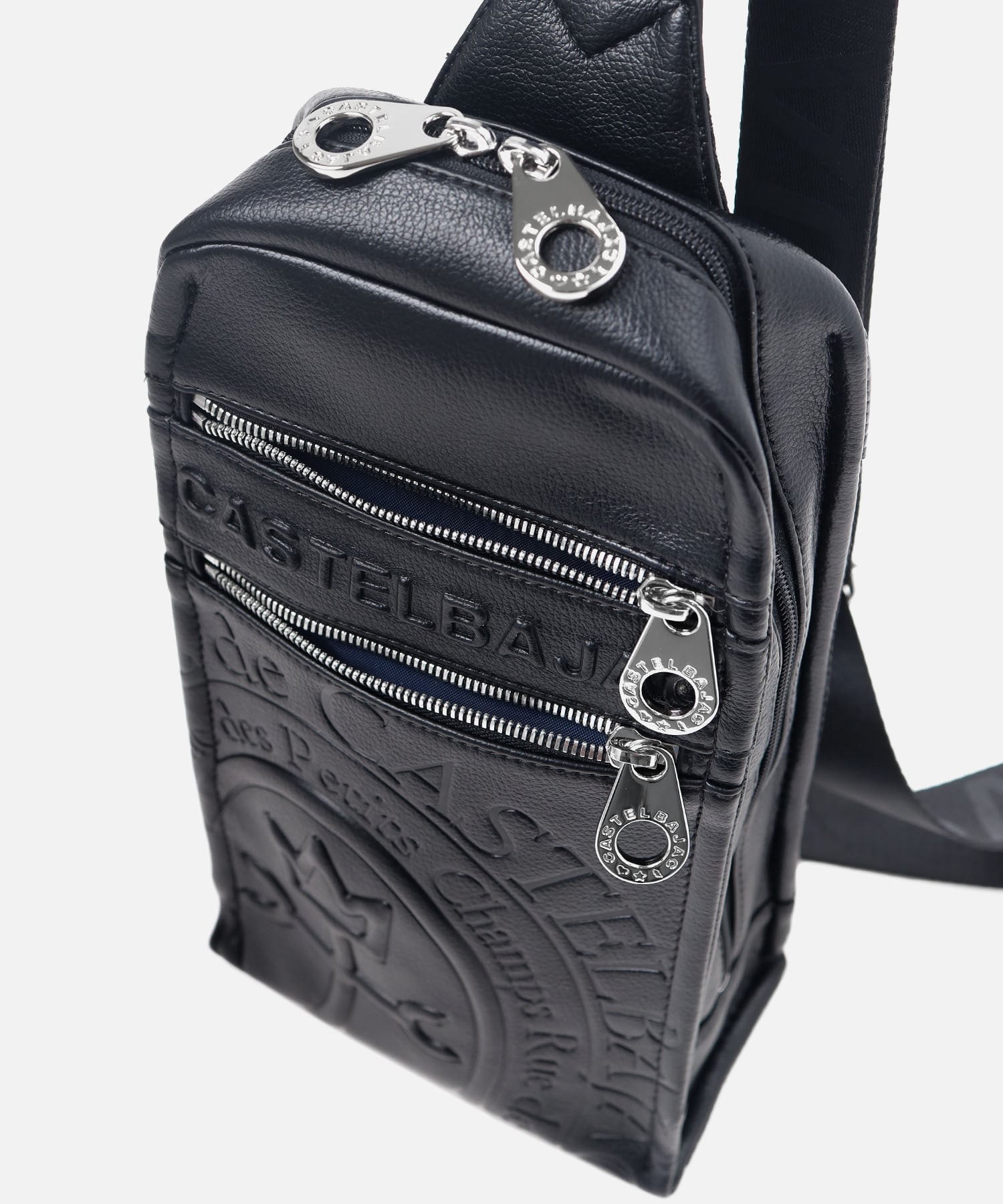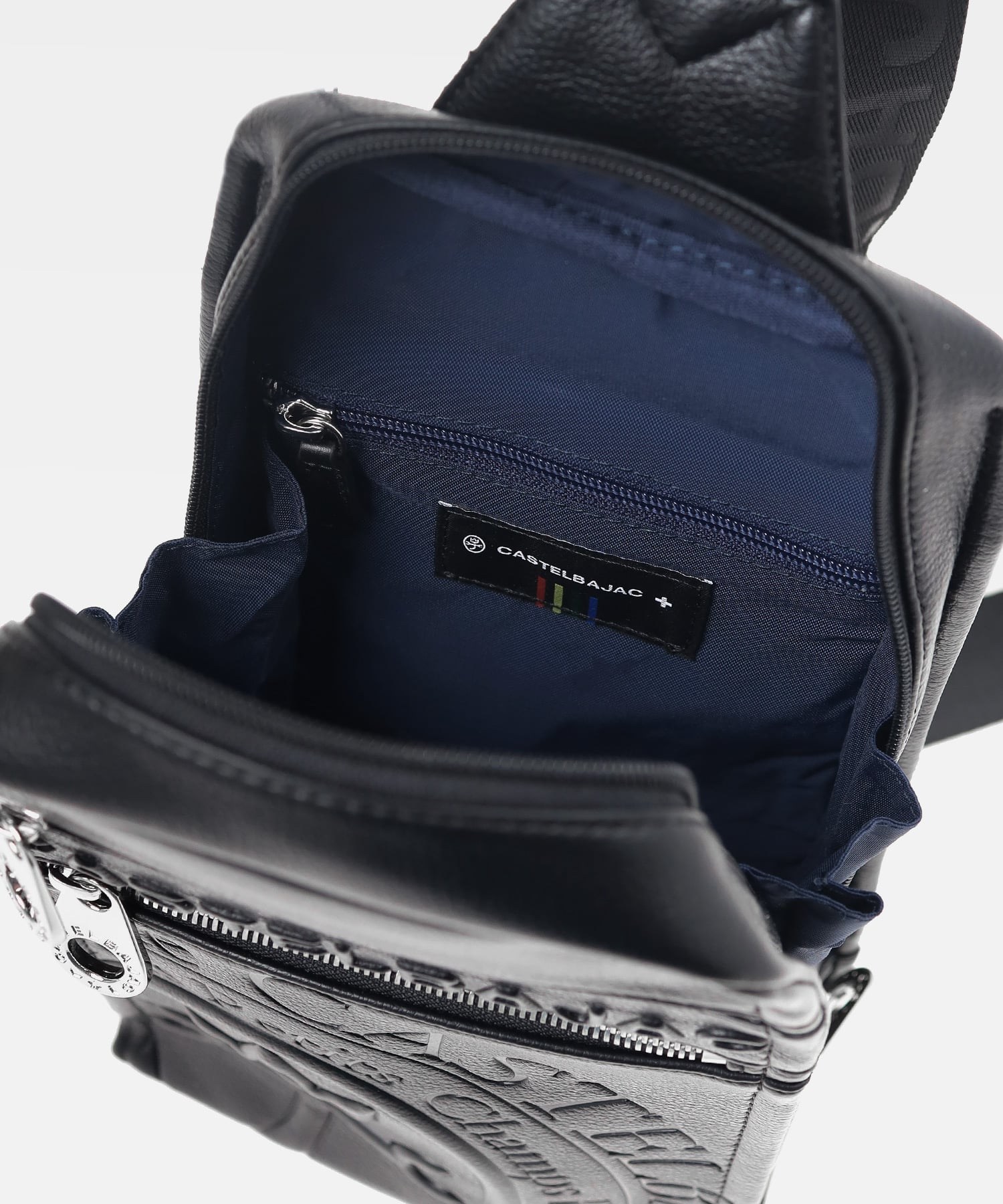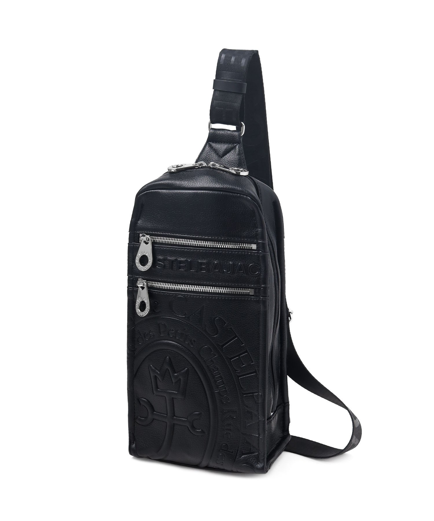 まるで革のような質感の合成皮革に、大きなロゴを浮き立たせブランド感を漂わせた、カステルバジャックのワンショルダーバッグ。シンプルなデザインながらも、大胆で存在感のあるロゴが際立ち、スタイリッシュな雰囲気を醸し出しています。500mlペットボトルがすっぽりと入り、お出かけや旅行などに大活躍のワンショルダーバッグです。