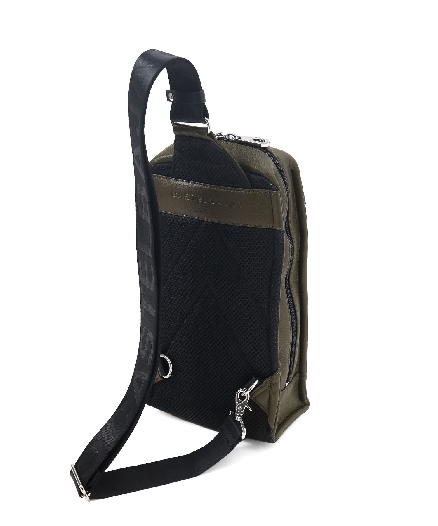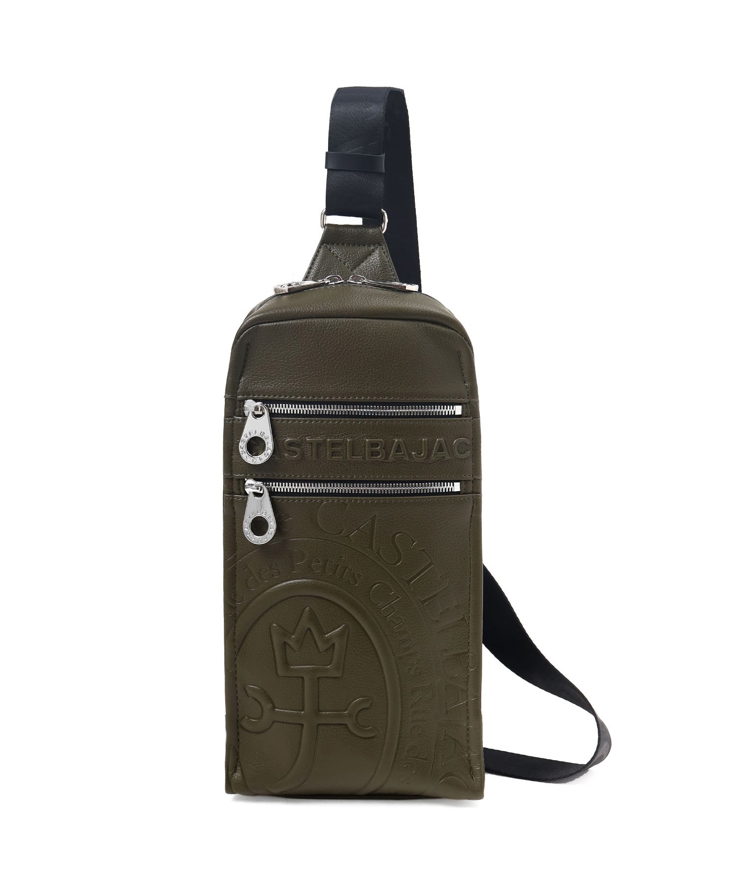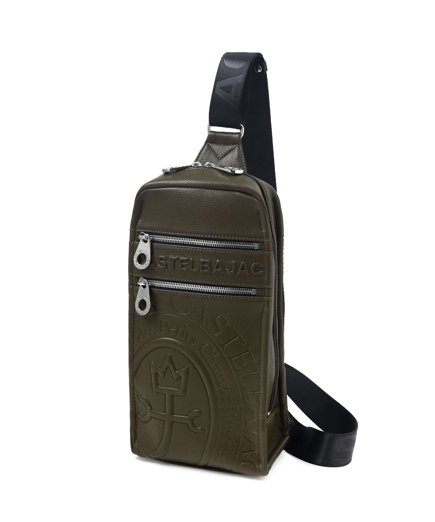 まるで革のような質感の合成皮革に、大きなロゴを浮き立たせブランド感を漂わせた、カステルバジャックのワンショルダーバッグ。シンプルなデザインながらも、大胆で存在感のあるロゴが際立ち、スタイリッシュな雰囲気を醸し出しています。クロ、シロ、カーキの使いやすい色展開は、日常のスタイリングにさりげないアクセントをプラス。洗練されたデザインと実用性を兼ね備え、普段使いに最適です。