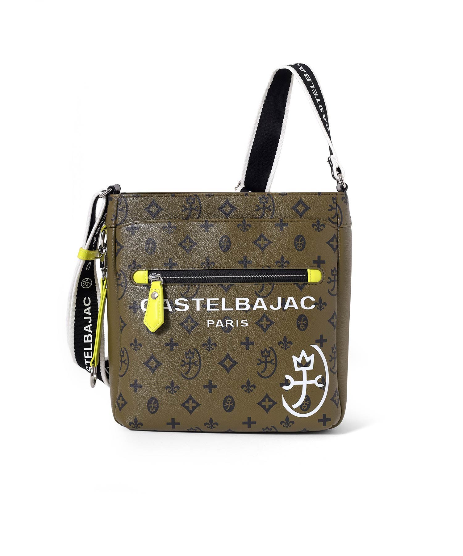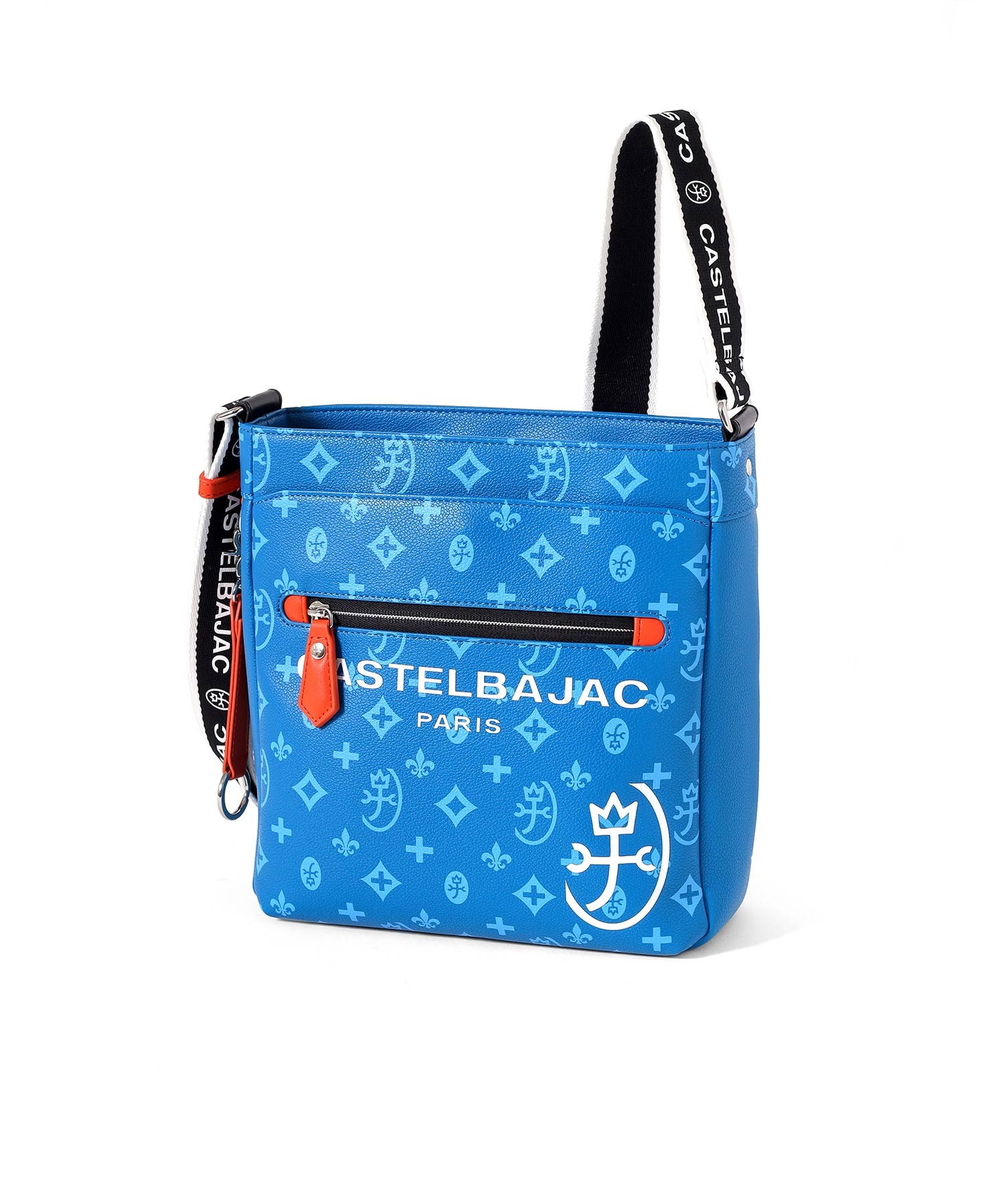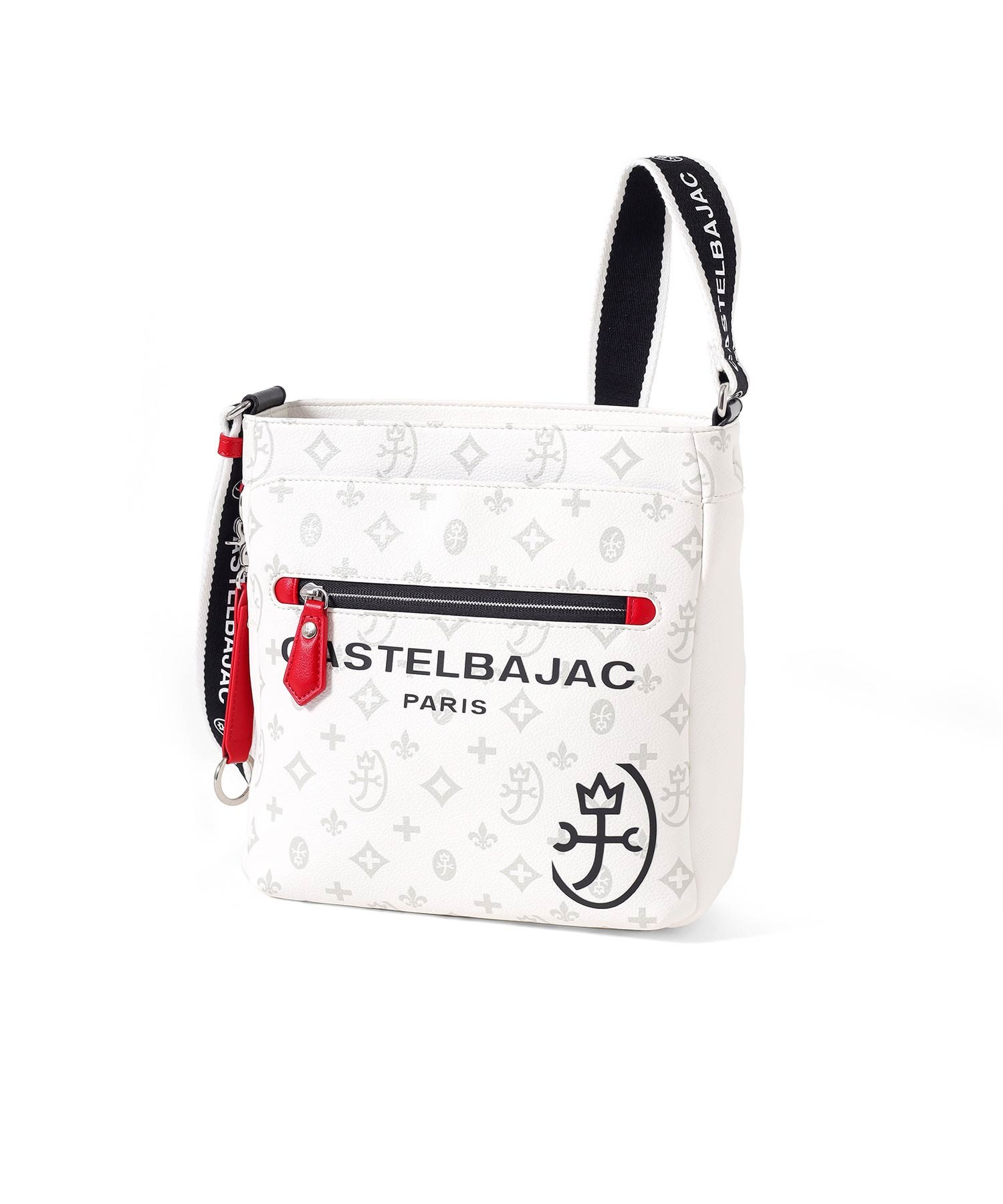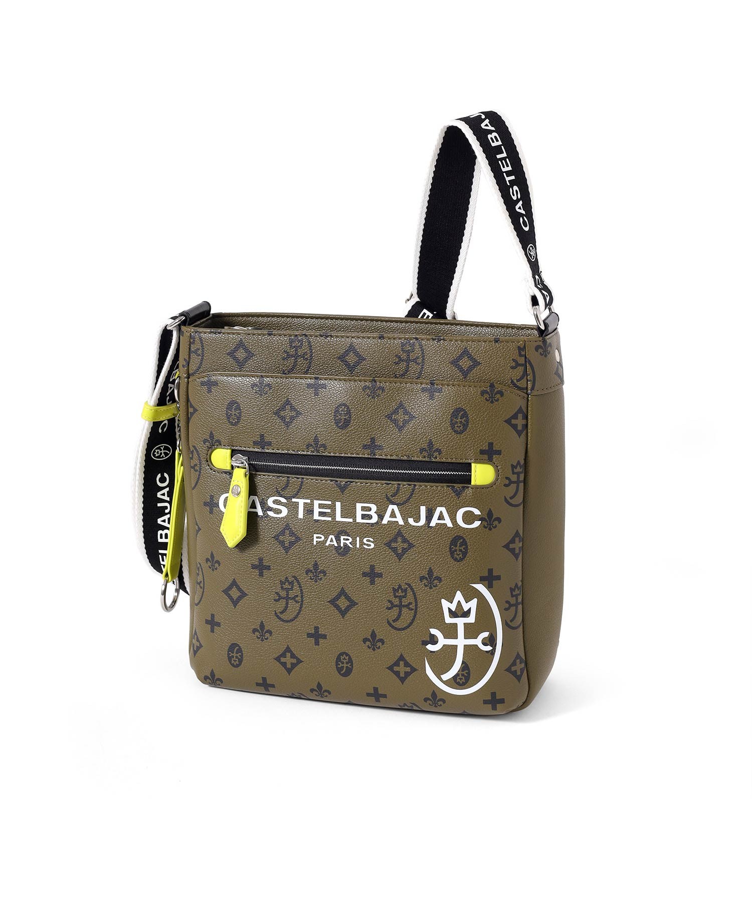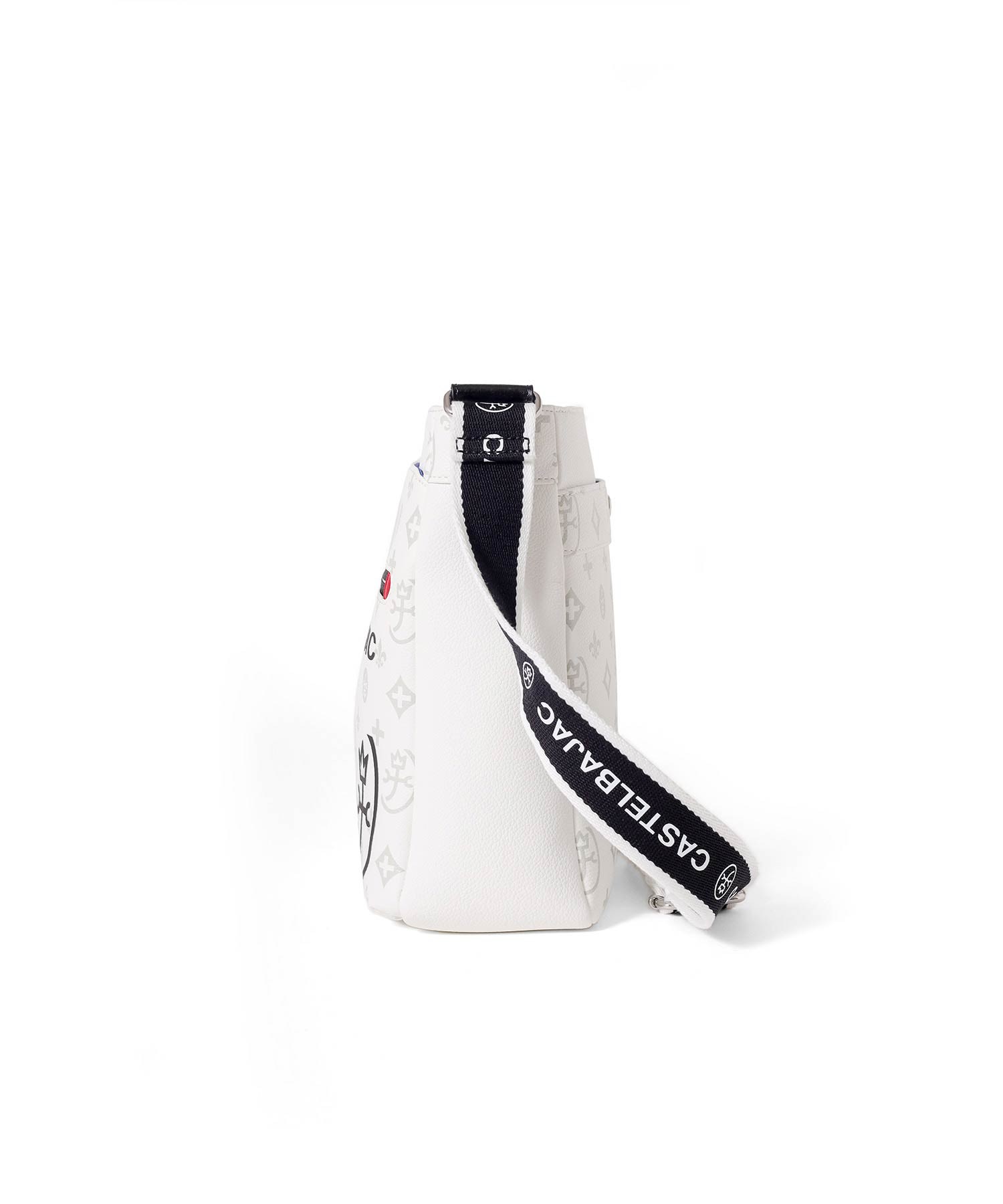 バッグの本体色と差し色にもなるアクセントカラーのコンビネーションが魅力のカステルバジャックのB5ショルダーバッグ。本体素材はシボ感のある合成皮革を使用し、カバンの前面や背面にカステルバジャックのオリジナルモノグラム柄をプリントしました。付属のキーホルダーがアクセントとなっています。