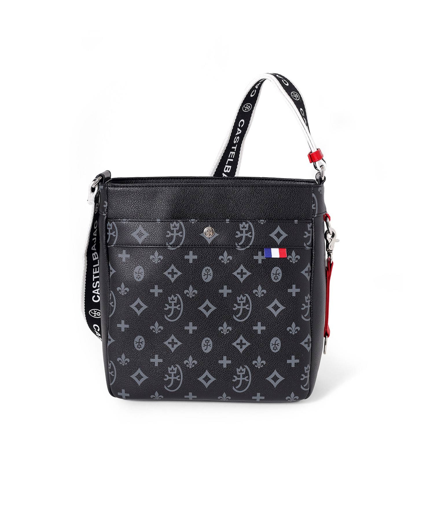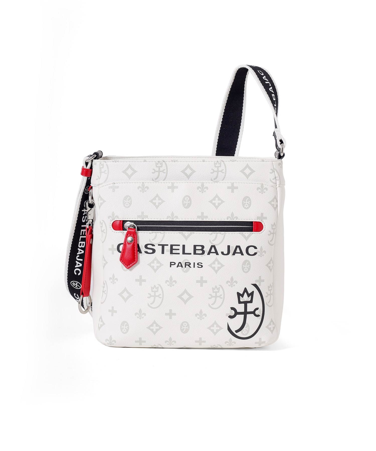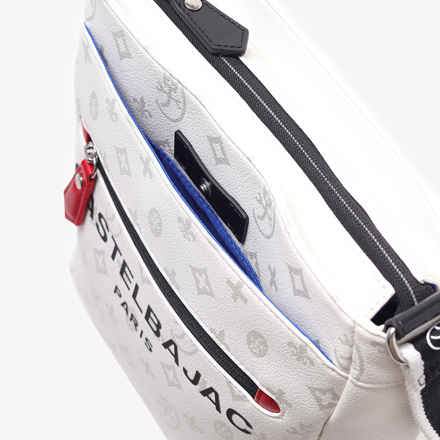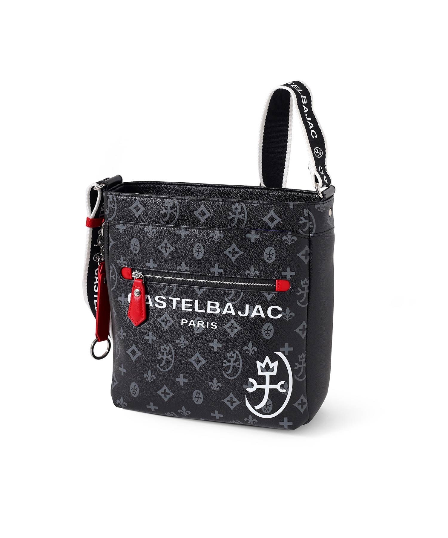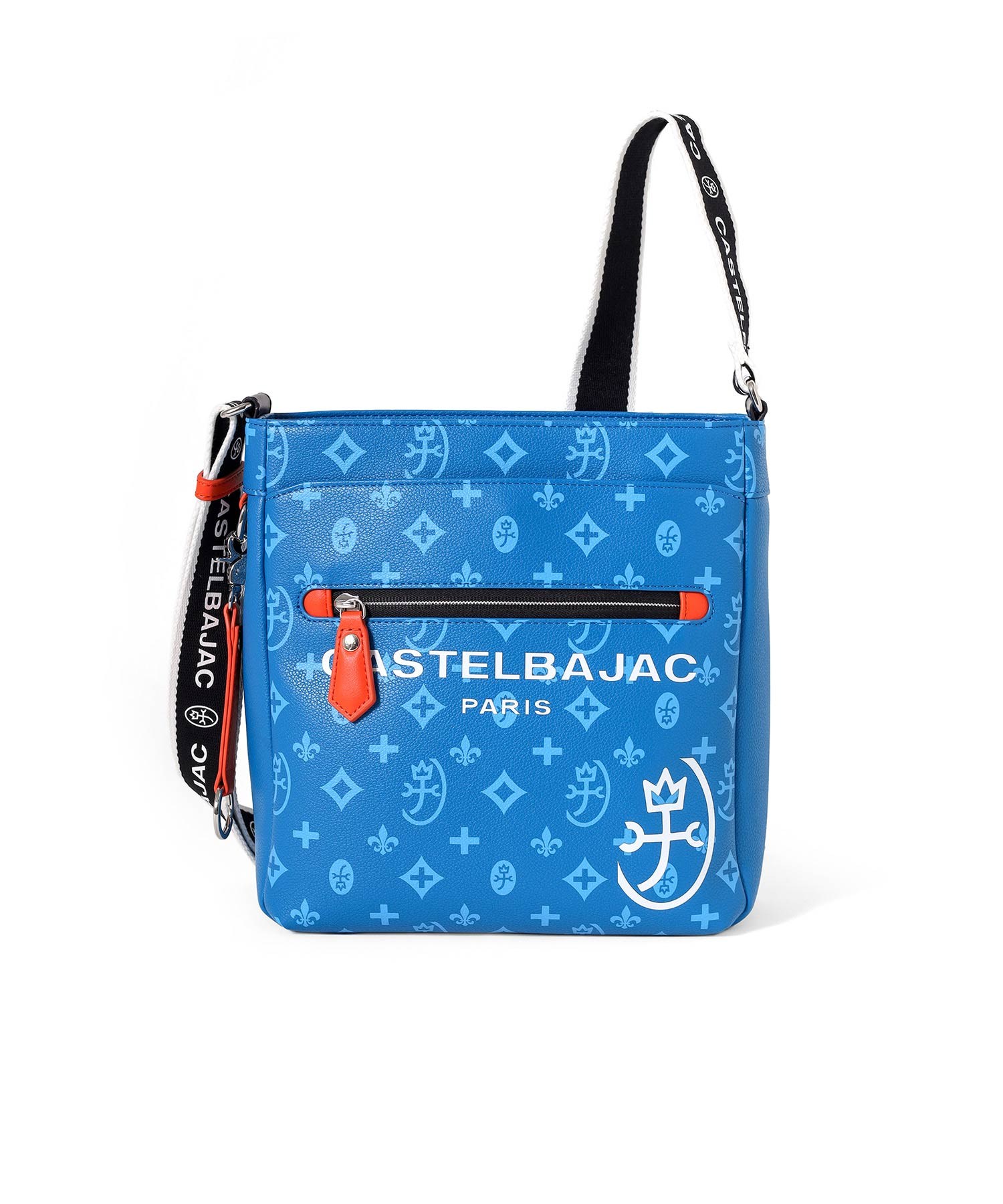 バッグの本体色と差し色にもなるアクセントカラーのコンビネーションが魅力のカステルバジャックのB5ショルダーバッグ。本体素材はシボ感のある合成皮革を使用し、カバンの前面や背面にカステルバジャックのオリジナルモノグラム柄をプリントしました。付属のキーホルダーがアクセントとなっています。