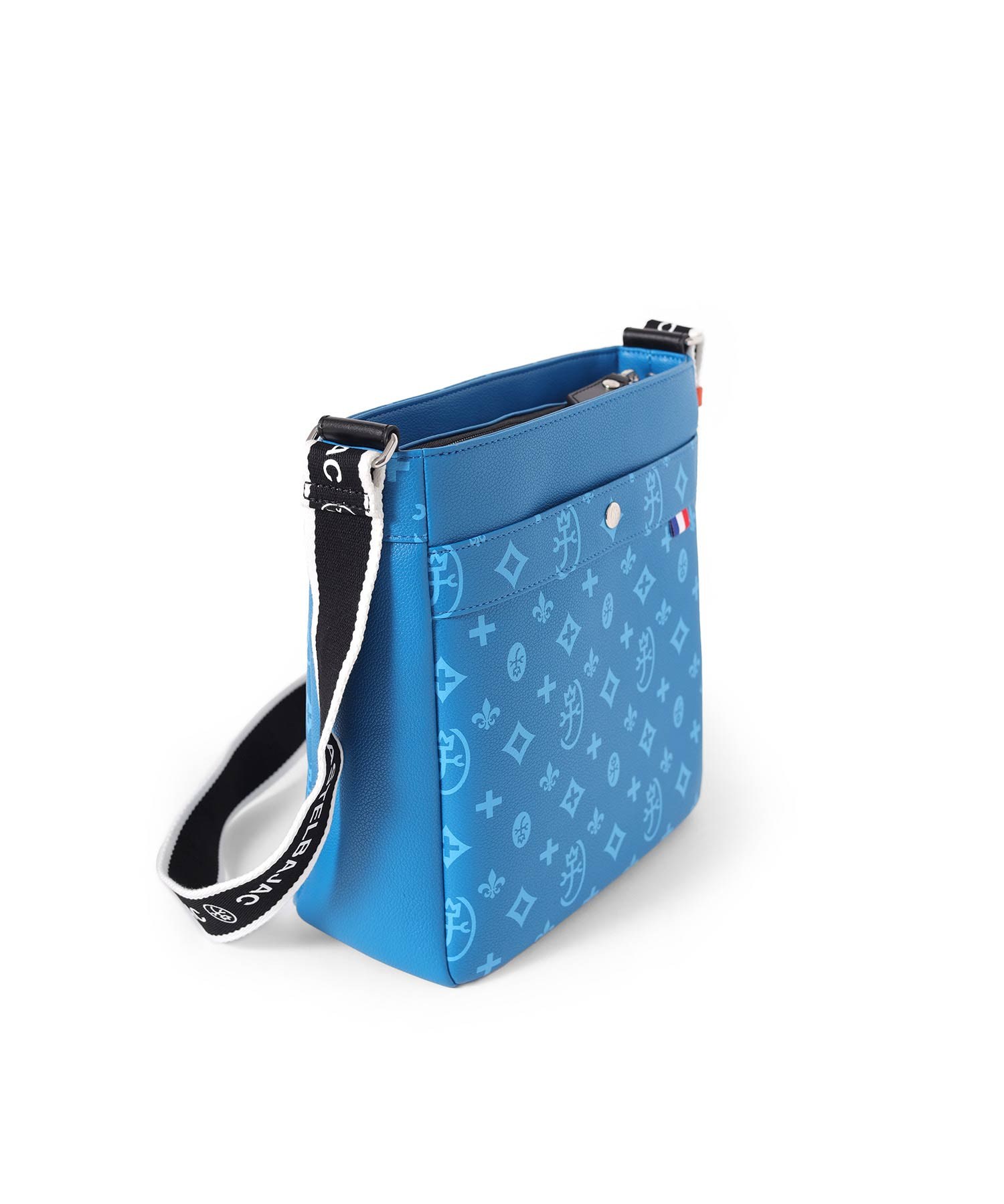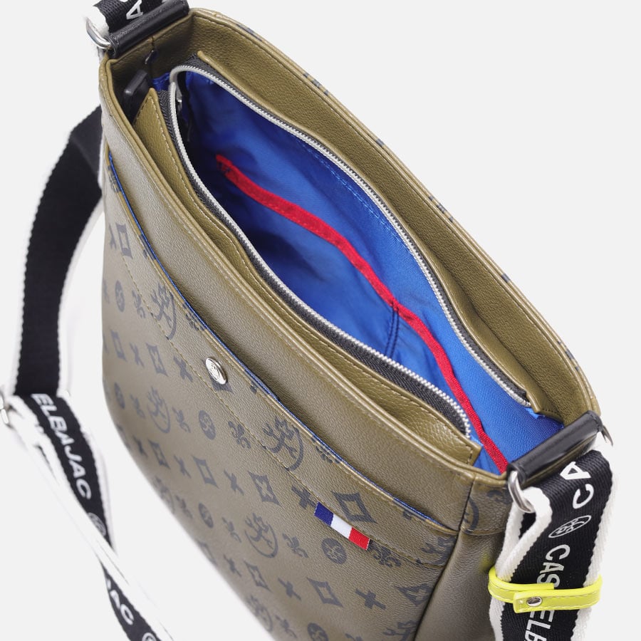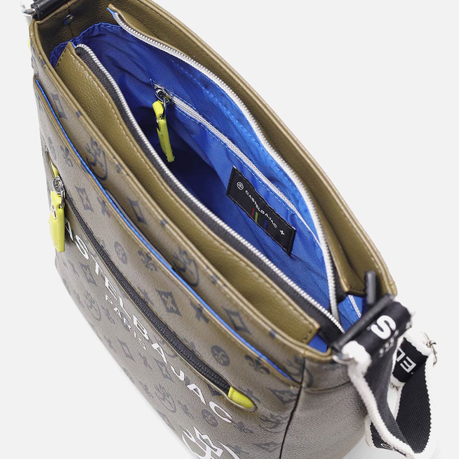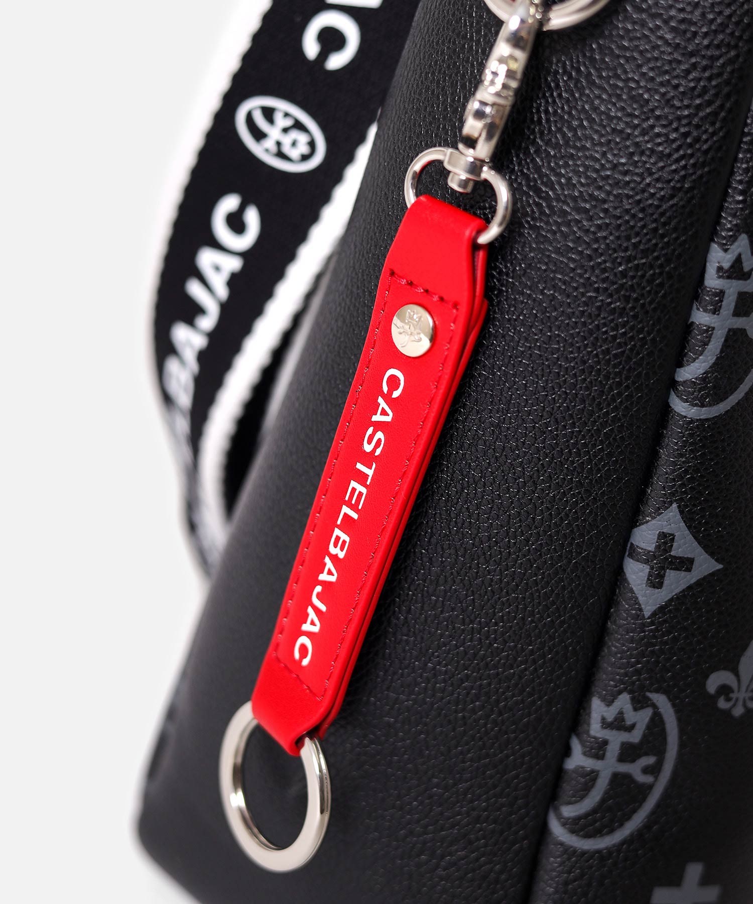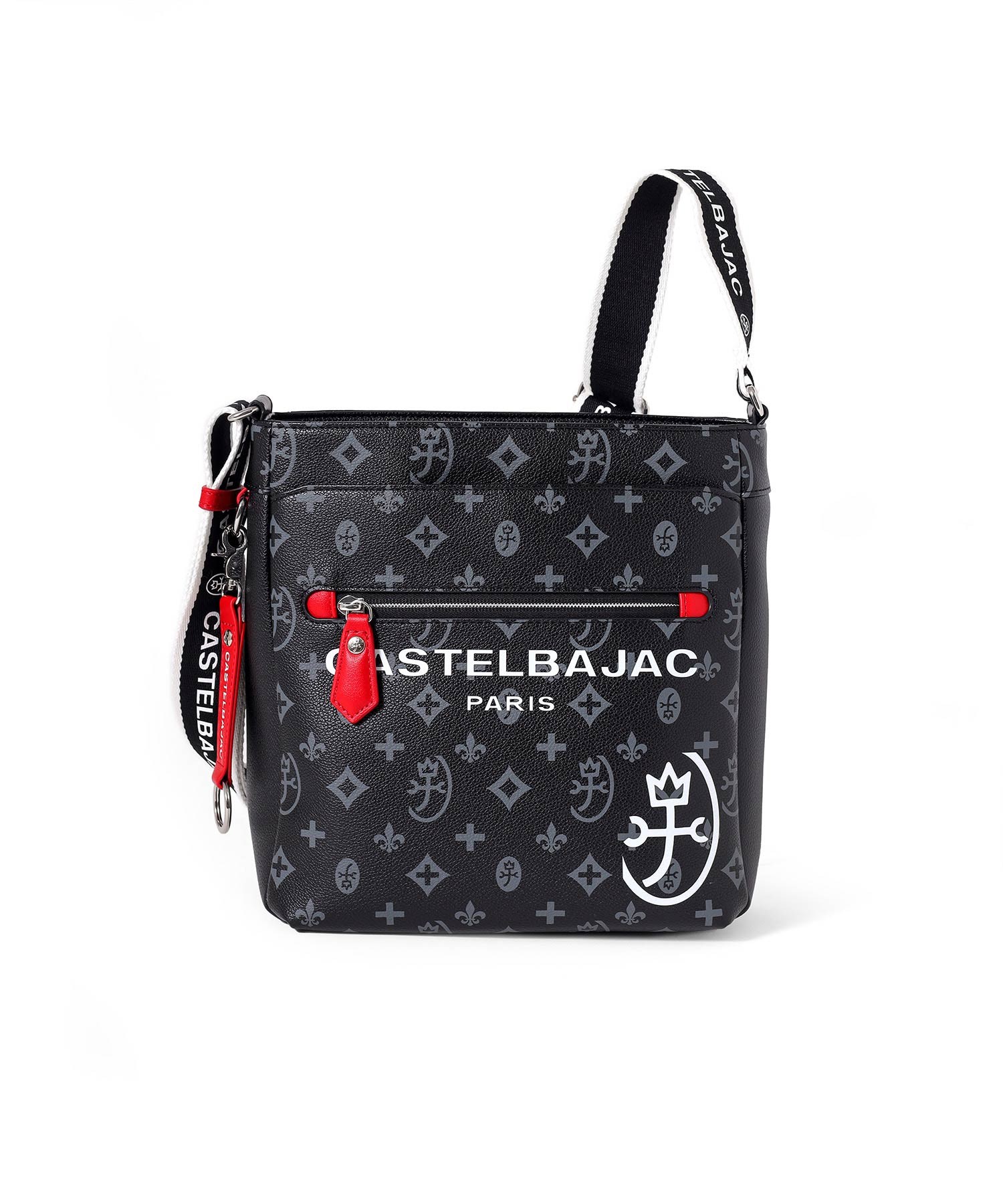 バッグの本体色と差し色にもなるアクセントカラーのコンビネーションが魅力のカステルバジャックのB5ショルダーバッグ。本体素材はシボ感のある合成皮革を使用し、カバンの前面や背面にカステルバジャックのオリジナルモノグラム柄をプリントしました。付属のキーホルダーがアクセントとなっています。