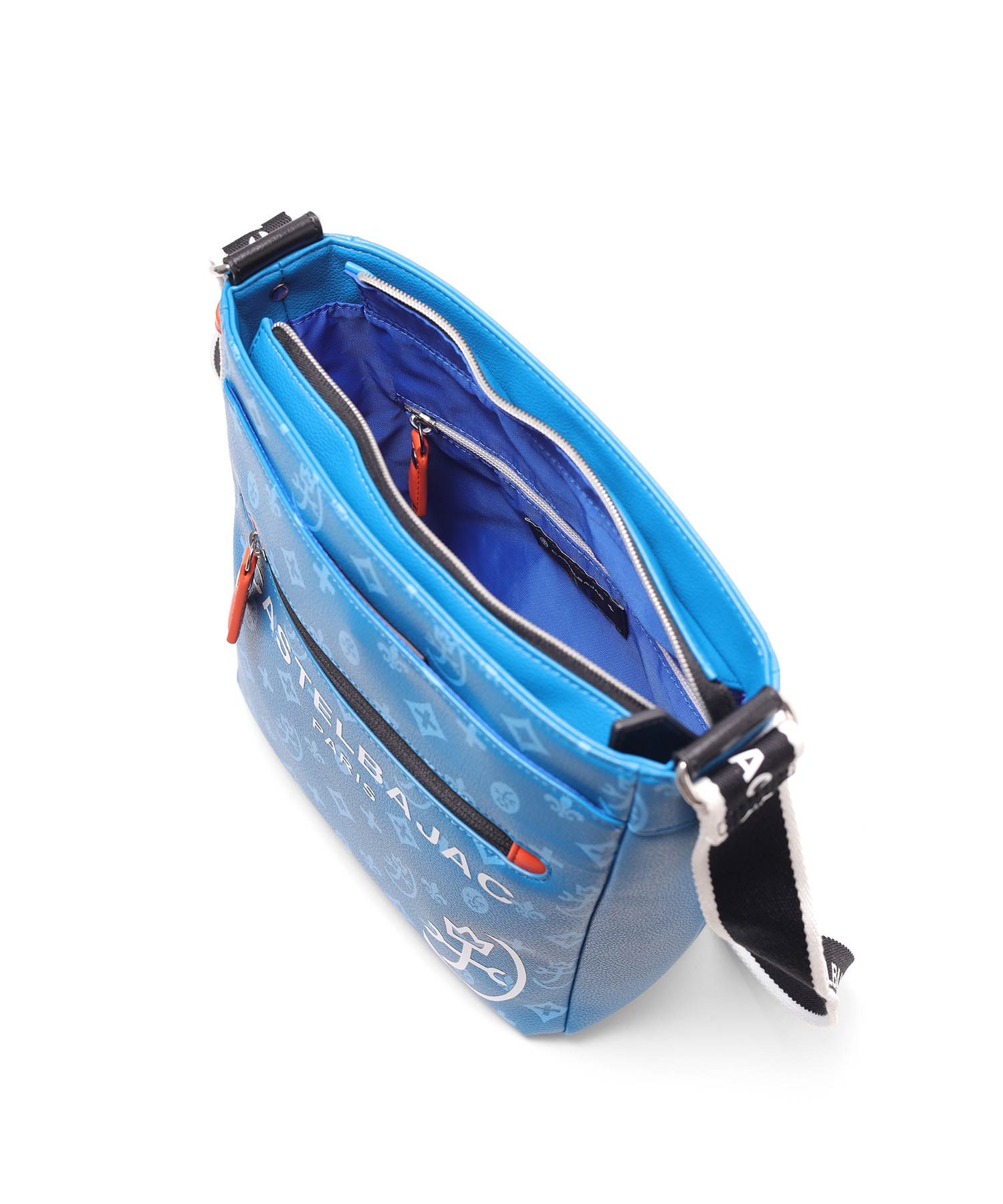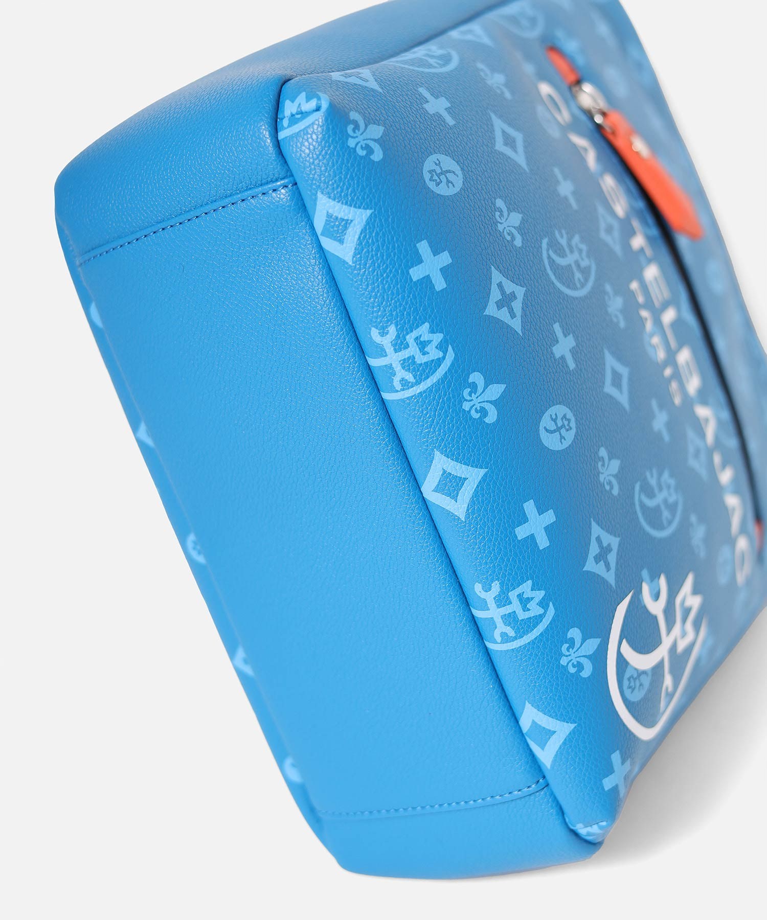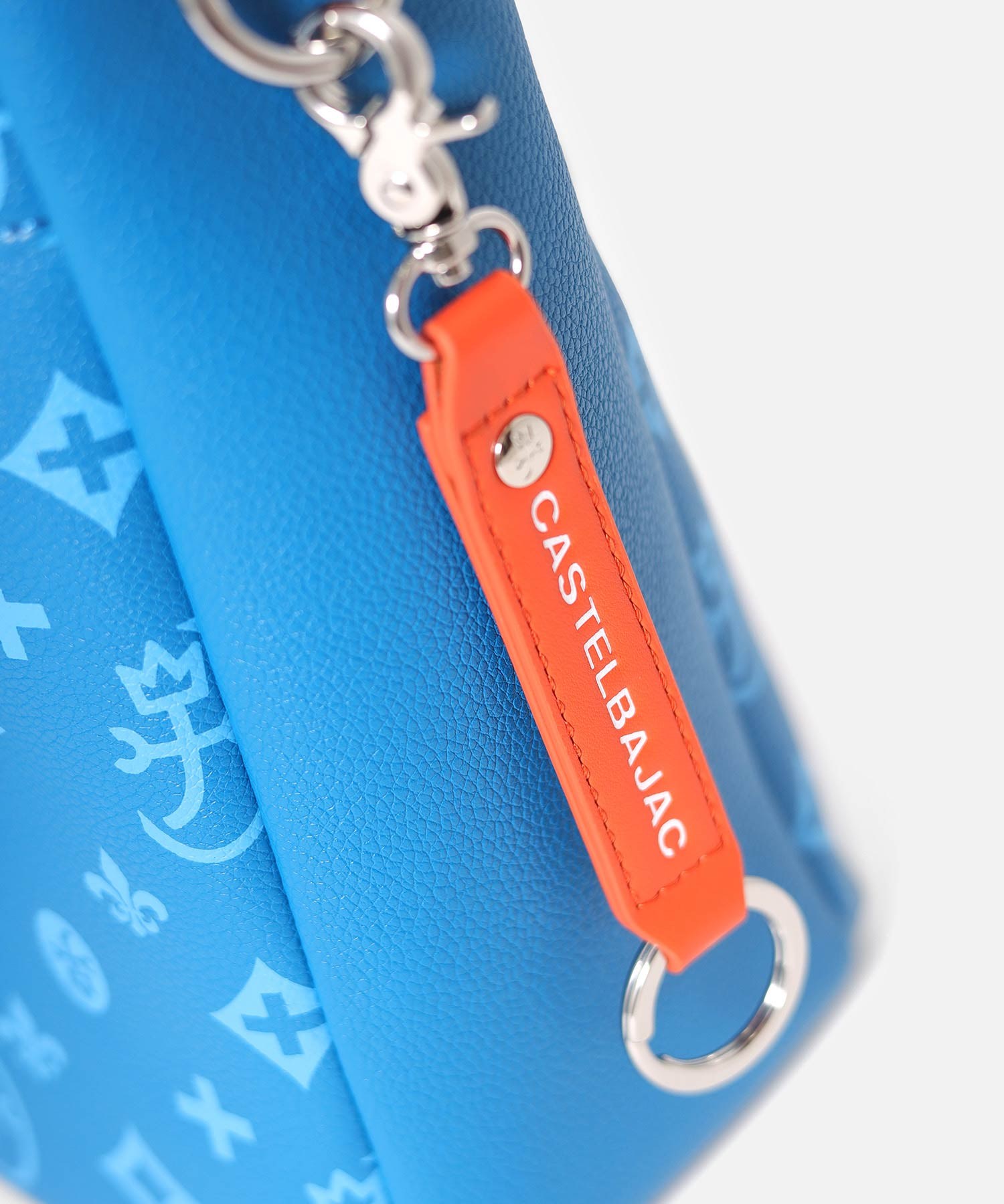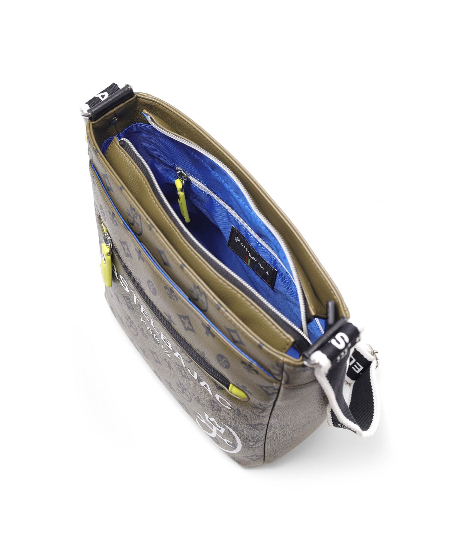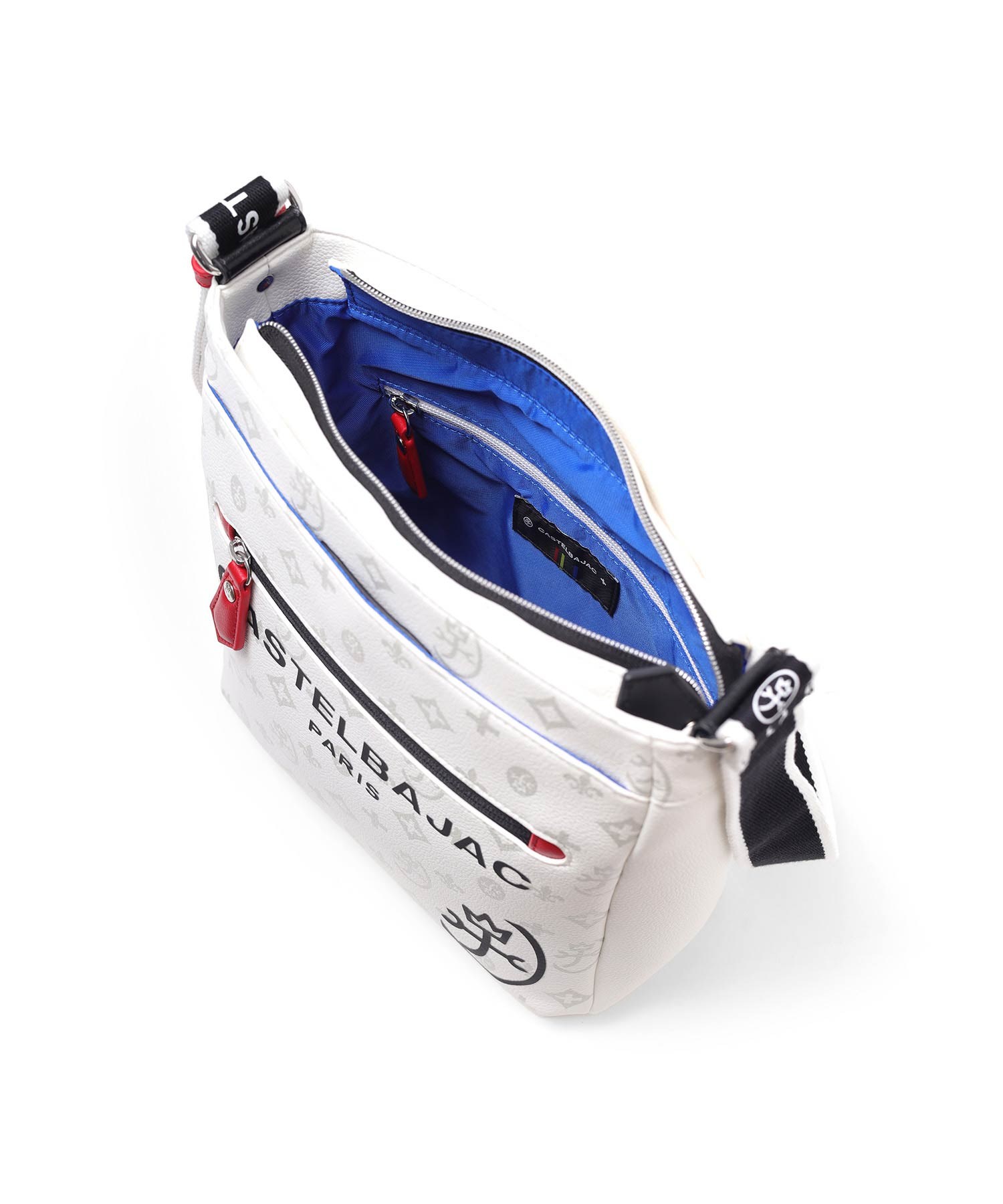 バッグの本体色と差し色にもなるアクセントカラーのコンビネーションが魅力のカステルバジャックのB5ショルダーバッグ。本体素材はシボ感のある合成皮革を使用し、カバンの前面や背面にカステルバジャックのオリジナルモノグラム柄をプリントしました。付属のキーホルダーがアクセントとなっています。